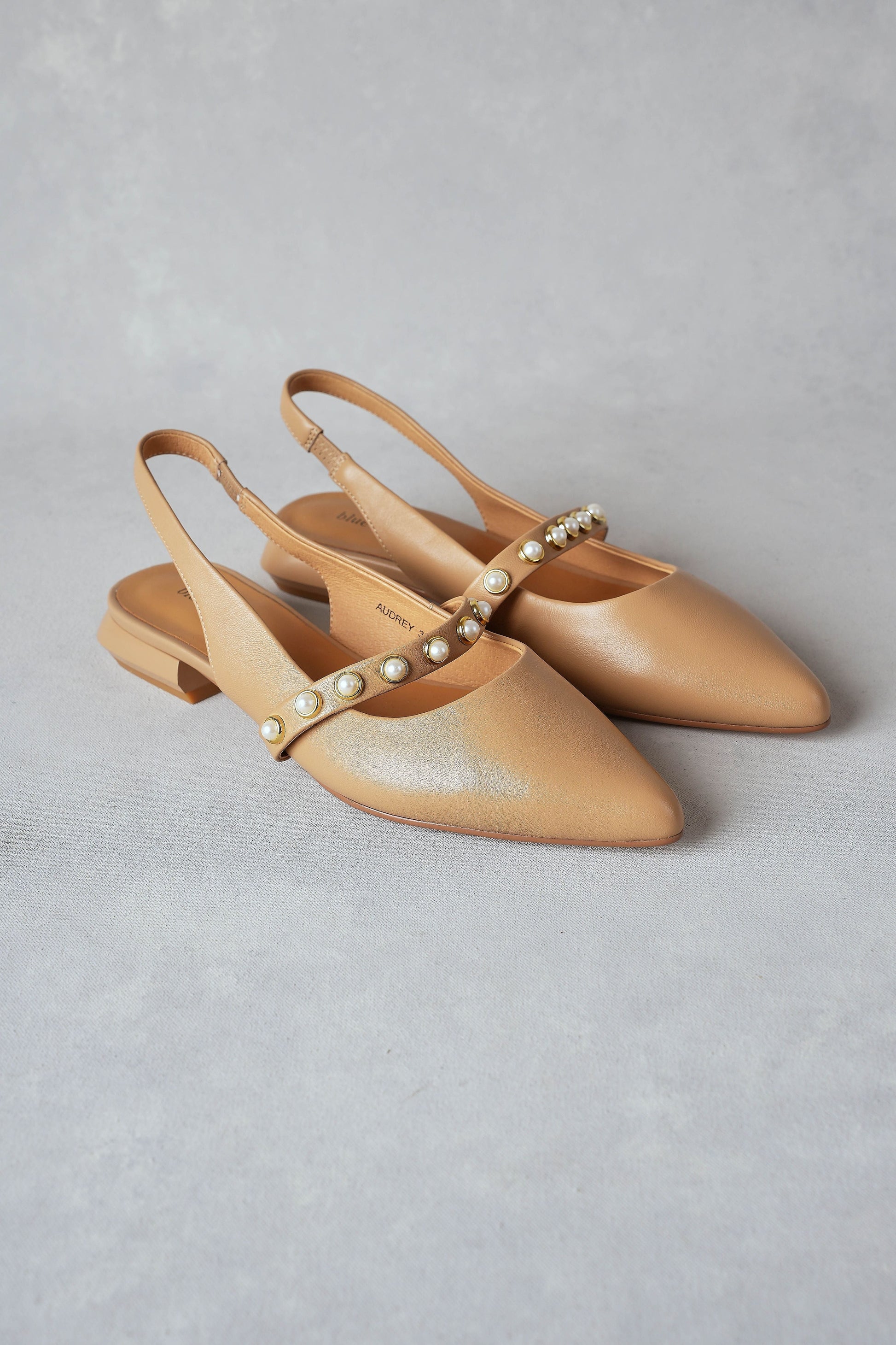 Designed for women who appreciate comfort and sophistication, our Audrey Sling Back is crafted from leather and features a fashionable foot strap with faux pearl detailing. Blending style and practicality, slip on these dressy flats and go.