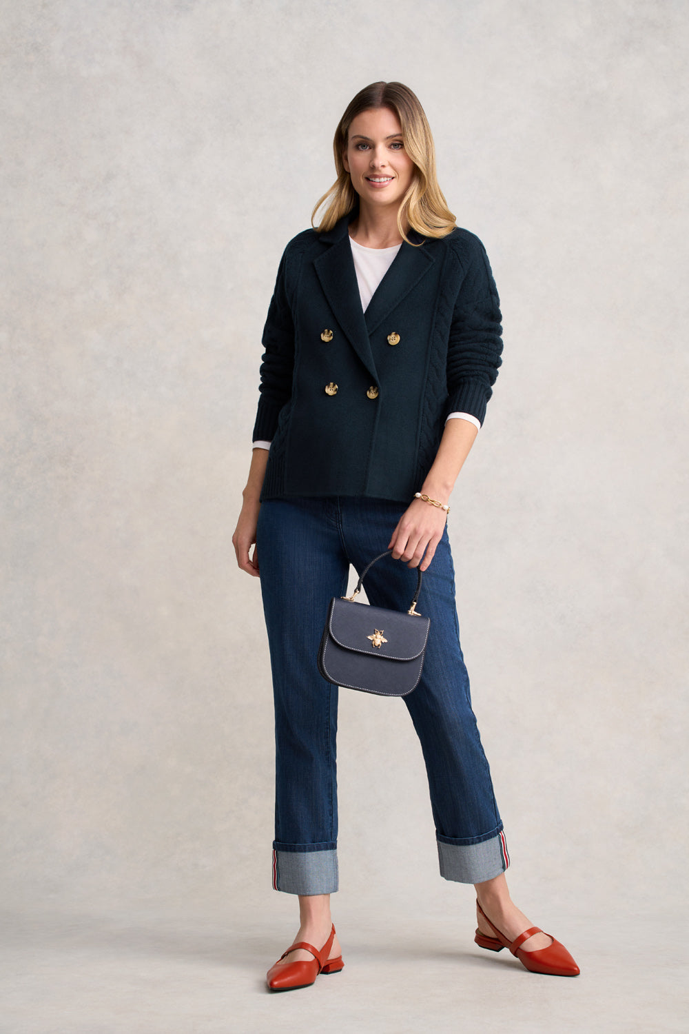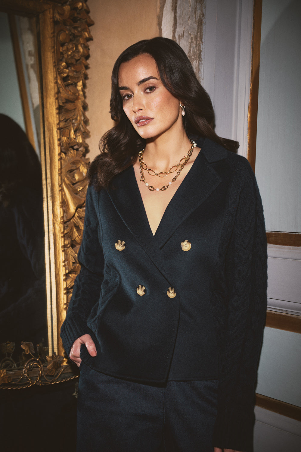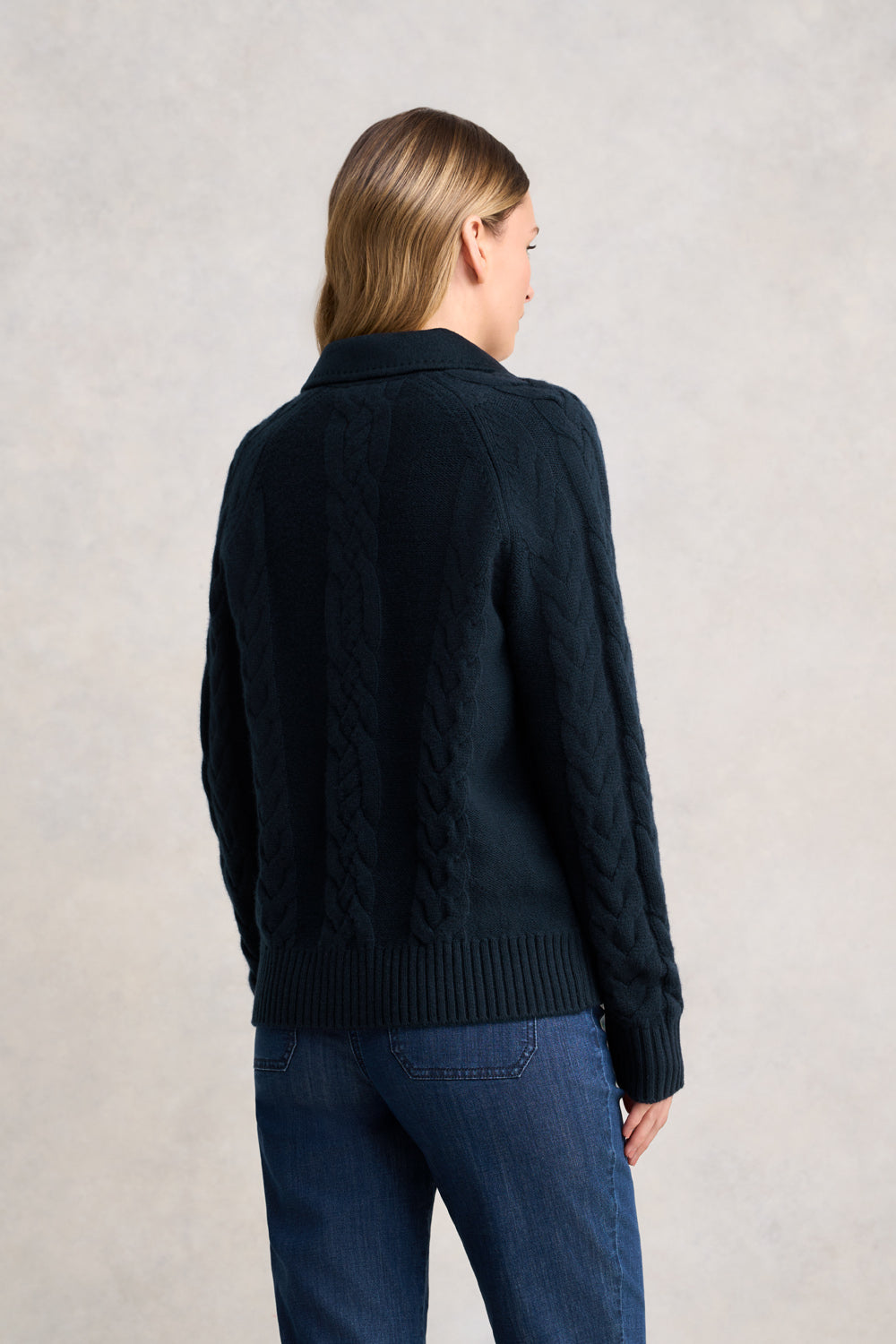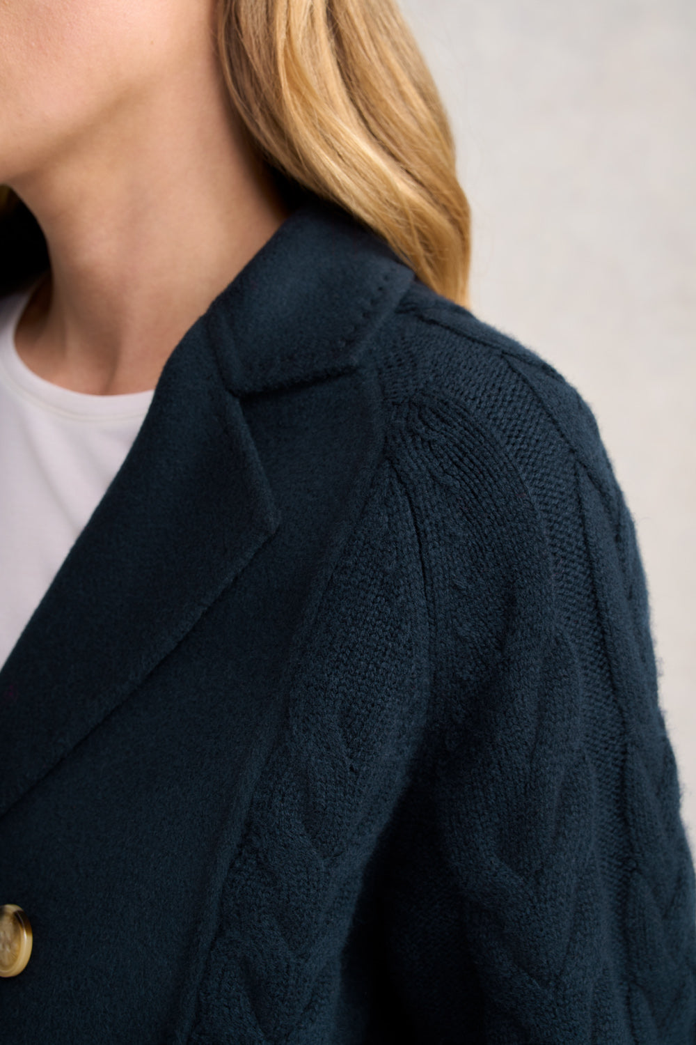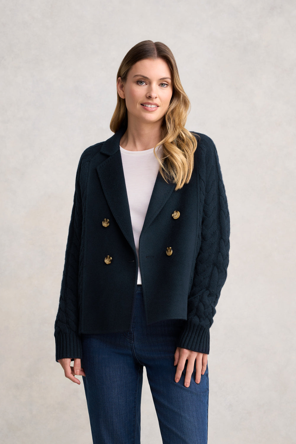 A love letter to effortless winter style, our Cable Mix Jacket in Ink is where warmth meets quiet sophistication. Crafted from a luxurious merino wool–cashmere blend, it features soft cable knit textures and elegant faux horn buttons. With the cosy ease of a cardigan and the polish of a jacket, this timeless piece brings a touch of artisanal charm to every chilly-day moment.