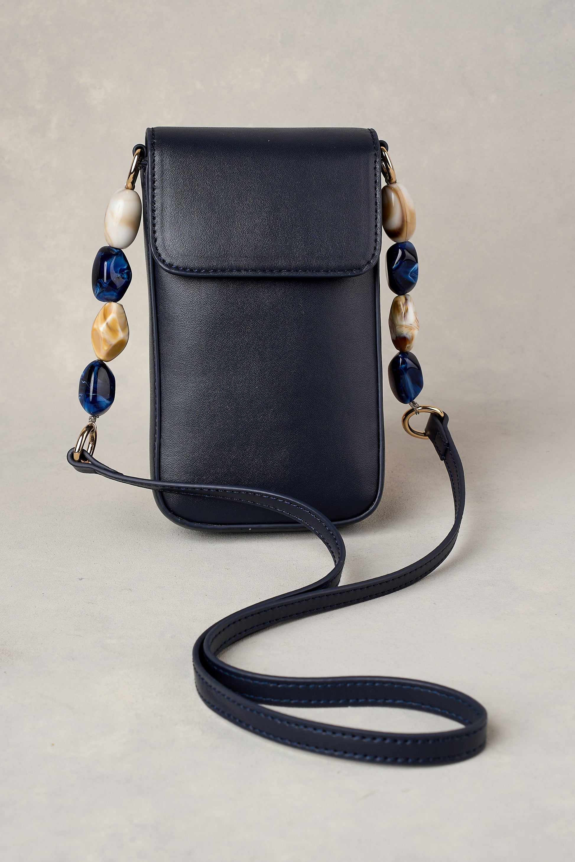A must-add to your style rotation, our Beaded Strap Phone Bag with its sleek silhouette is now available in Ink. Featuring a structured finish with a secure fold over flap, we love this bag’s statement crossbody strap with its oversized resin bead detailing. This accessory is both playful and distinctive.