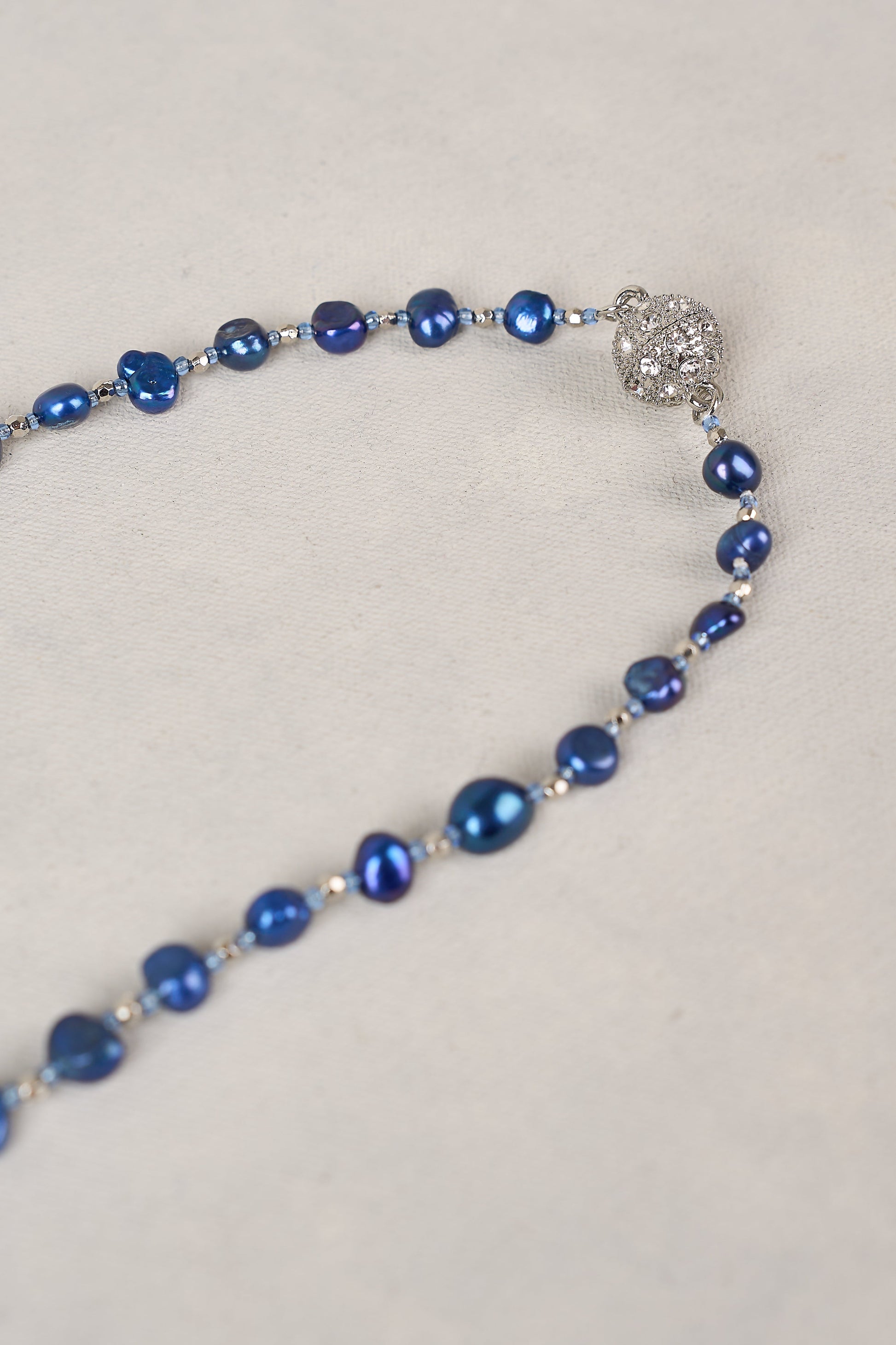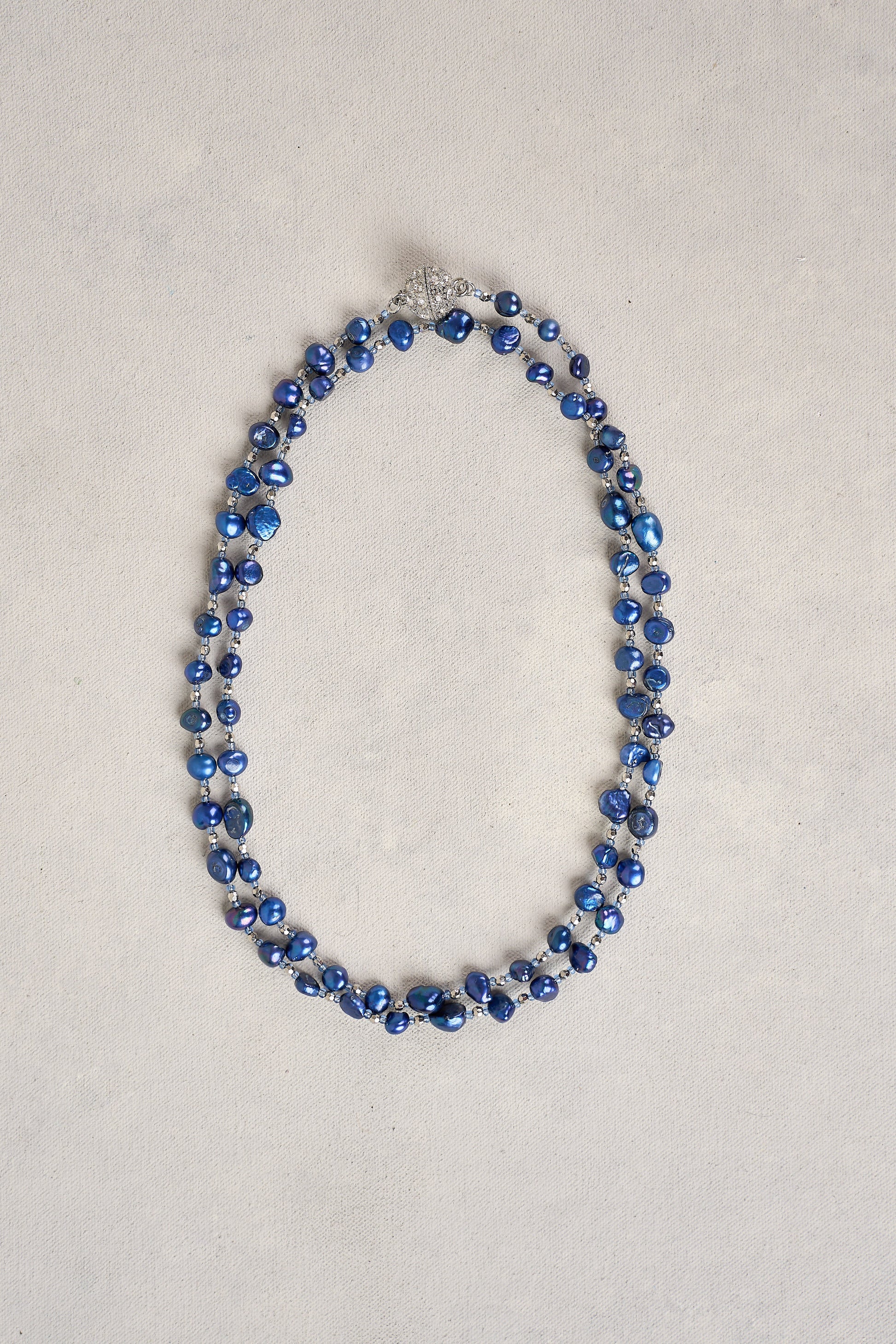 Dramatic and refined, this dark blue pearl necklace showcases organically shaped pearls and seed beads for texture and depth. Designed to be worn long, it’s finished with a magnetic clasp for ease. A moody take on French-inspired style.