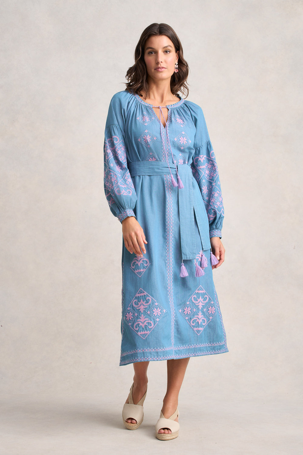 Romantic and free-spirited, this maxi dress is embroidered with pink mosaic motifs that shine against denim blue. With full sleeves, side splits and a tassel-tie belt, it flows with ease and elegance — a timeless piece for days that call for a touch of artistry.