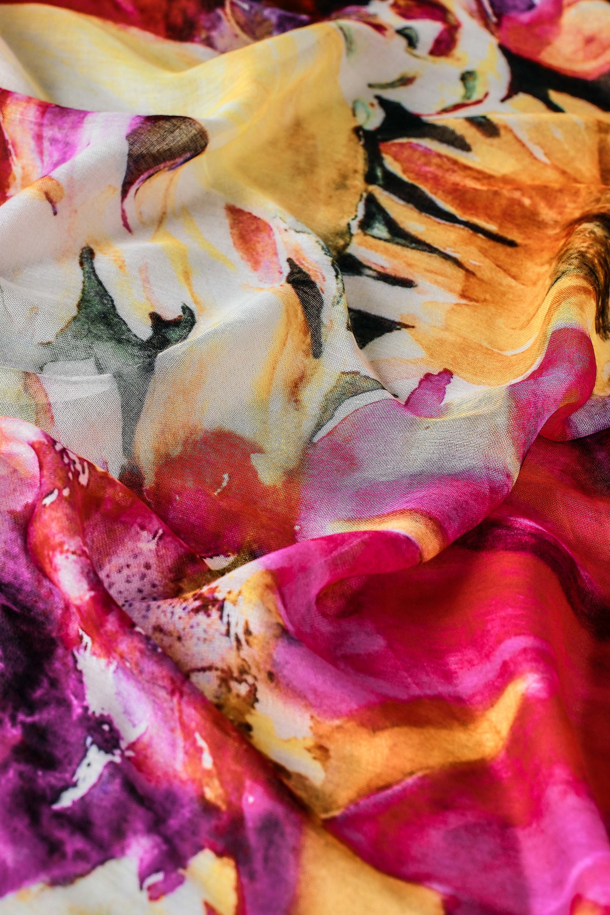 Lightweight with a touch of silk, this scarf is scattered with colourful, vibrant floral blooms. Its soft drape and lively palette make it an easy way to brighten your wardrobe all year round.
