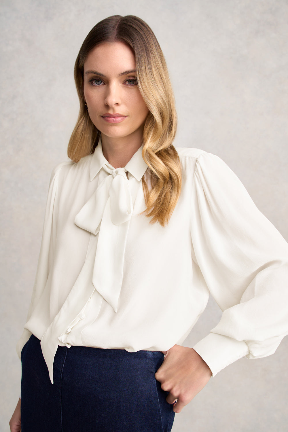 Elegant and versatile, this beautiful shirt is crafted from soft crepe de Chine. With a cutaway neckline, self-covered buttons, and removable tie, it’s designed to be styled your way. Blouson sleeves and gentle gathers add a touch of French refinement.
