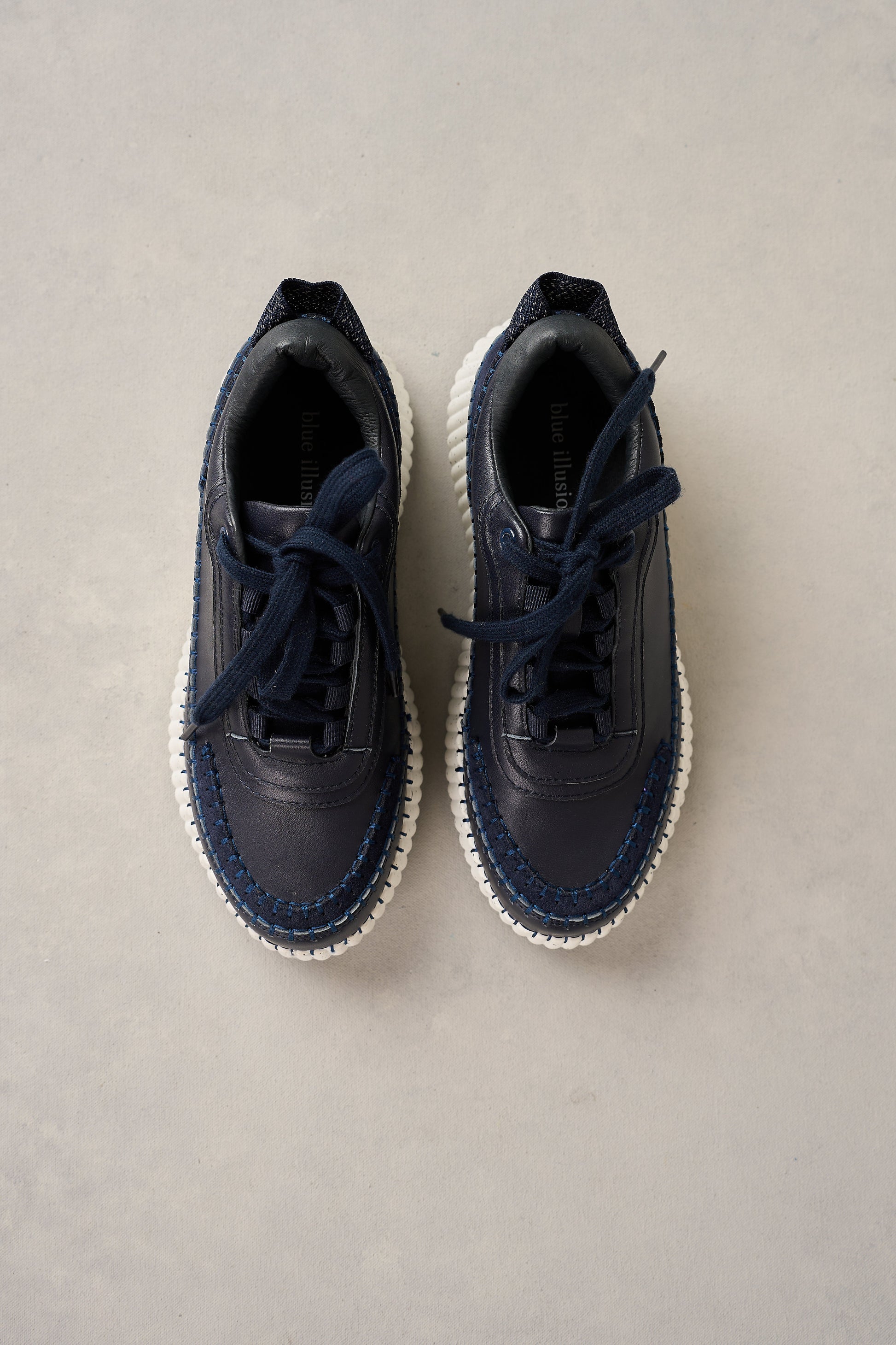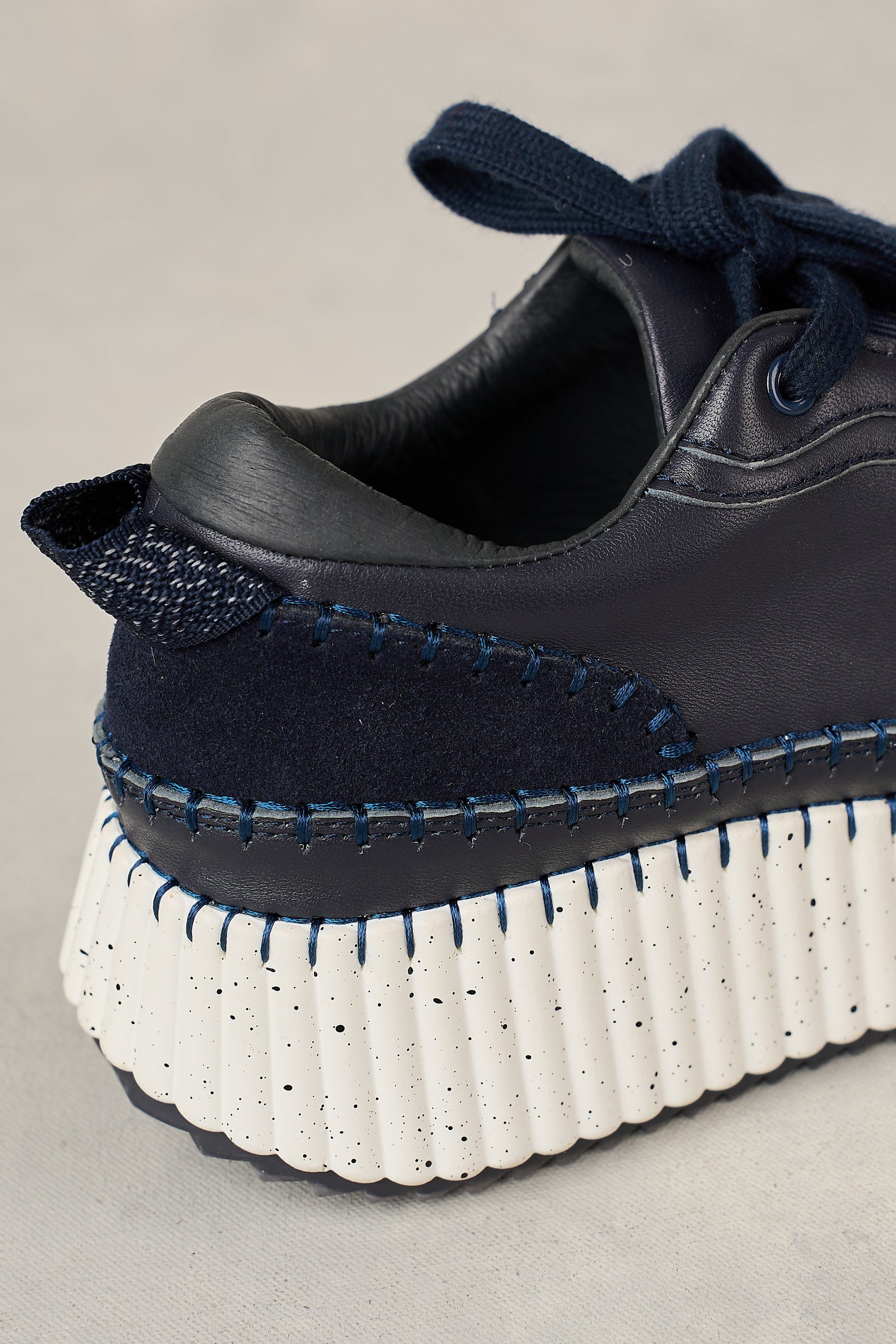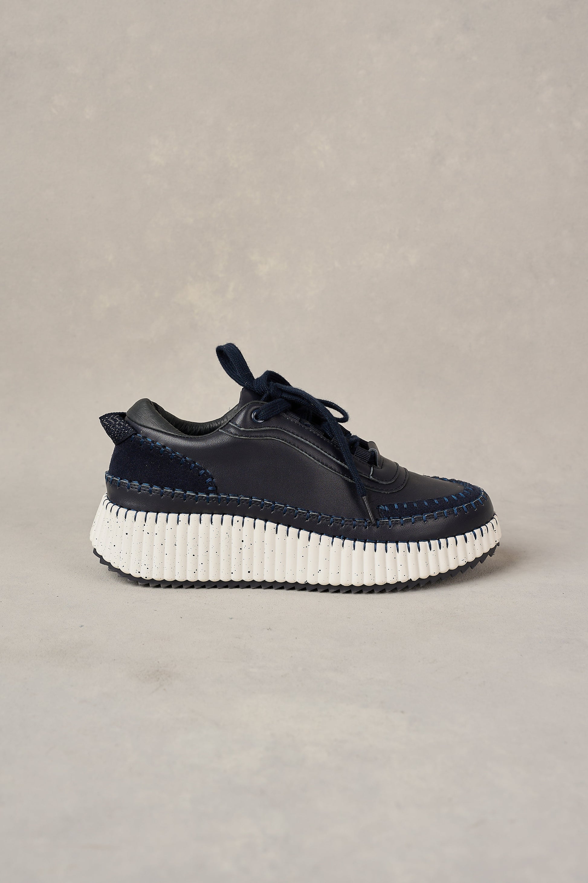‘Step’ up your sneaker game with our Celine Leather Sneaker. In Ink with a playful pop of texture with a suede back panel, this shoe is full of attitude and features a chunky white speckled platform with contrast stitching and ridged base. Complete with classic laces, this shoe is sporty, stylish and fun.