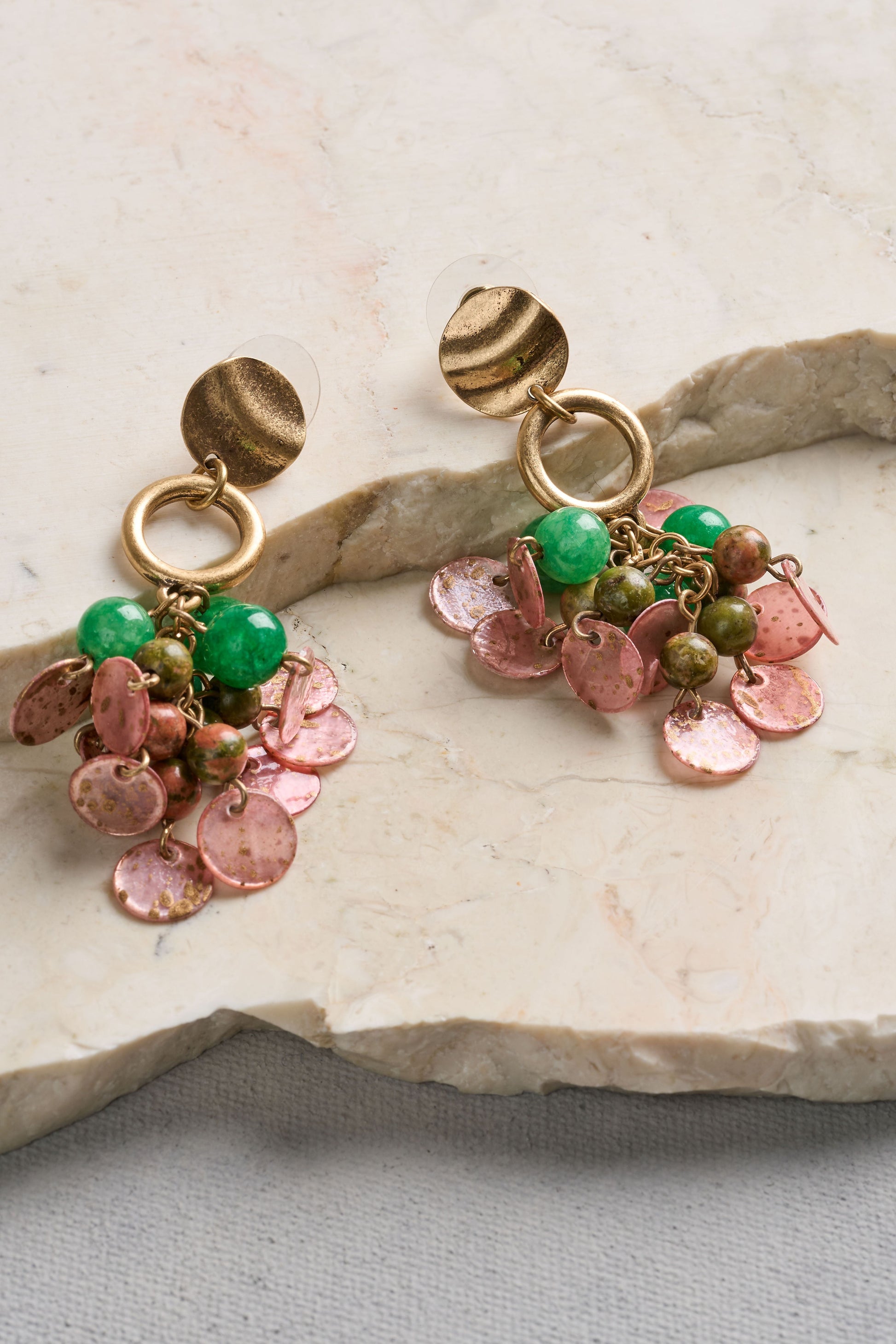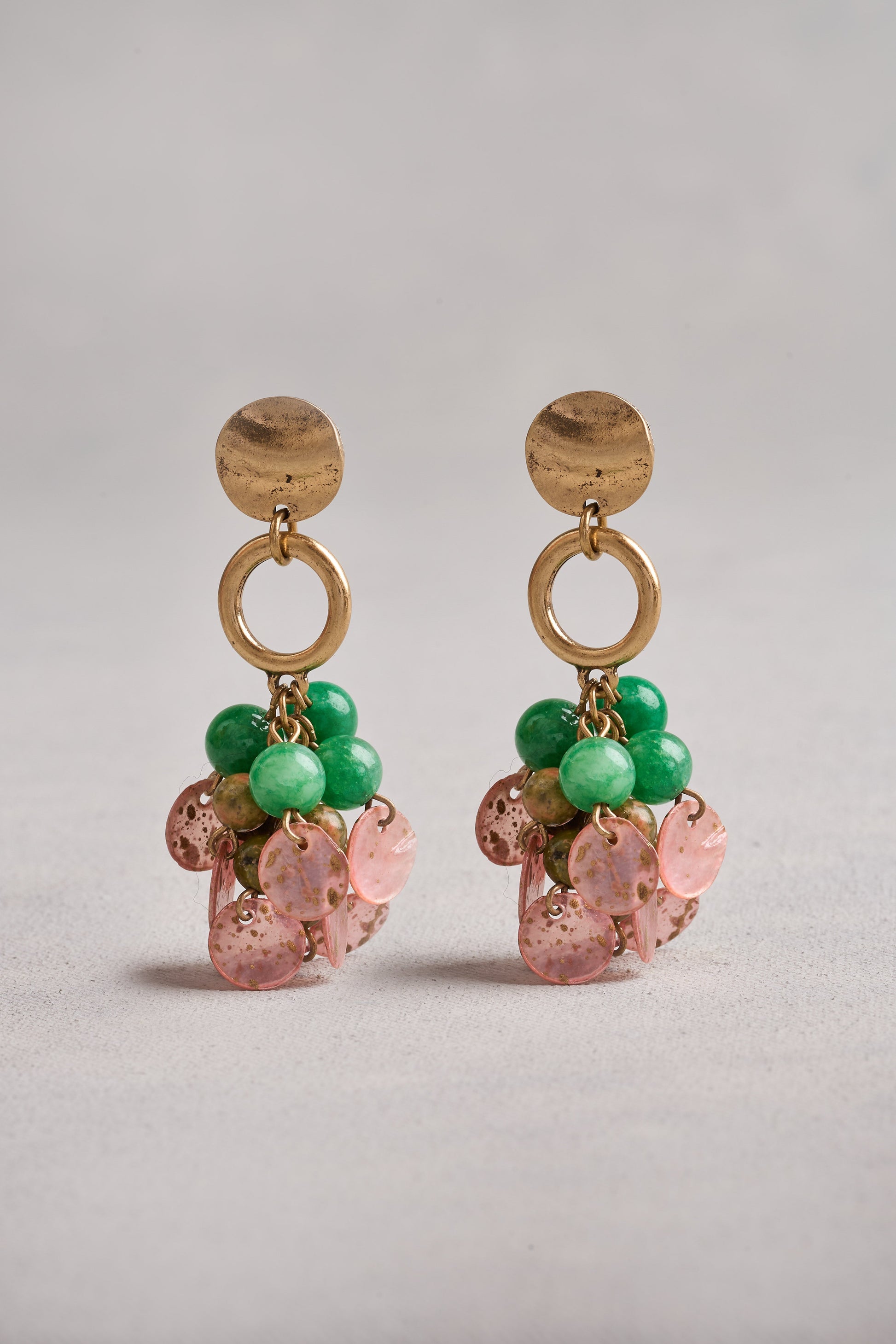Playful and eye-catching, these multicolour cluster earrings feature jumbled beads in jewel-like tones with gold hardware. Lightweight yet impactful, they bring a vibrant accent to simple blouses or flowing dresses, perfect for evenings out or lively summer gatherings.