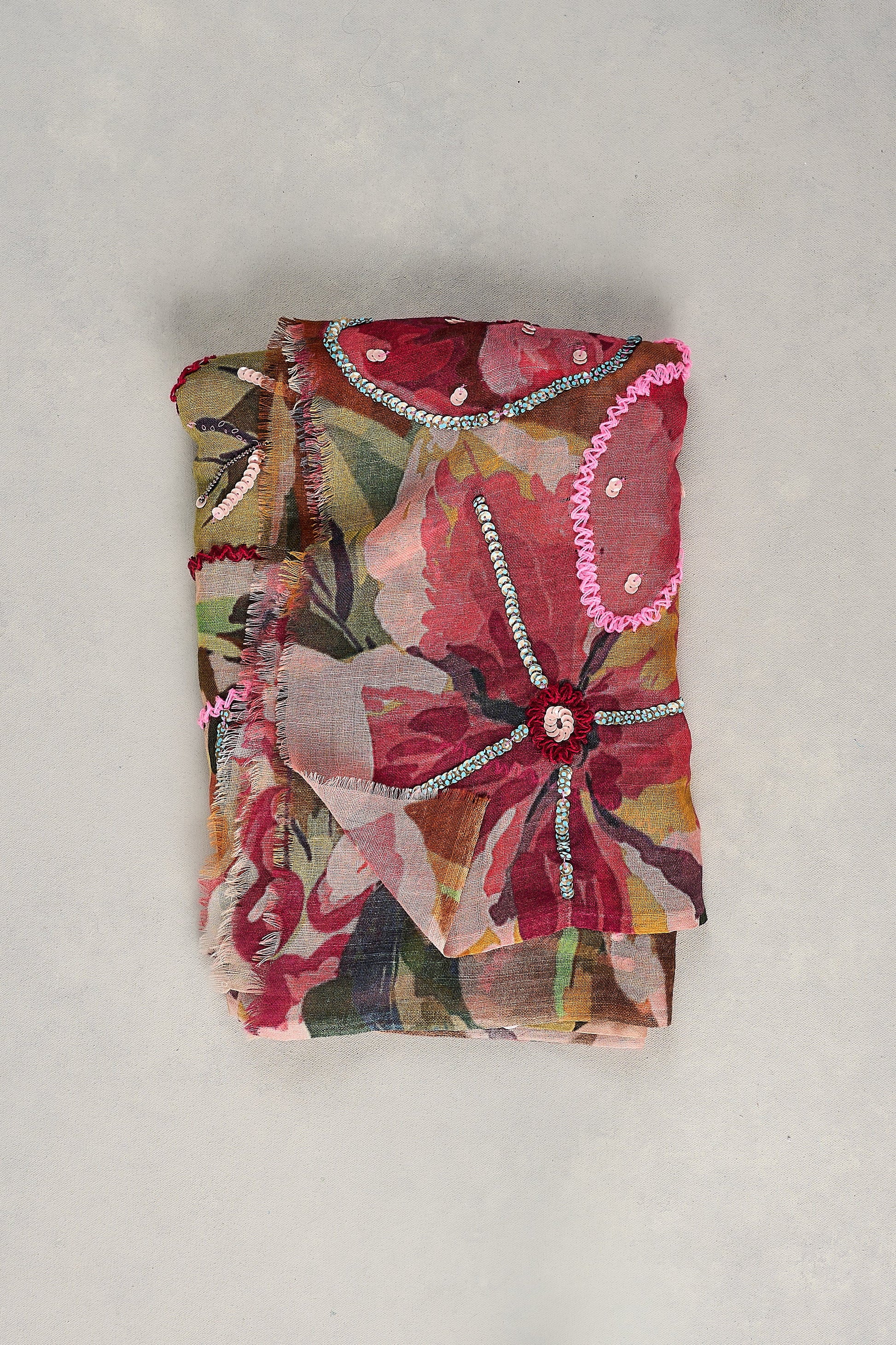 A celebration of colour and craft, this floral scarf is adorned with delicate sequins and embroidery for a touch of whimsy. Crafted from a soft wool-silk blend, it adds texture and romance to your everyday layers.