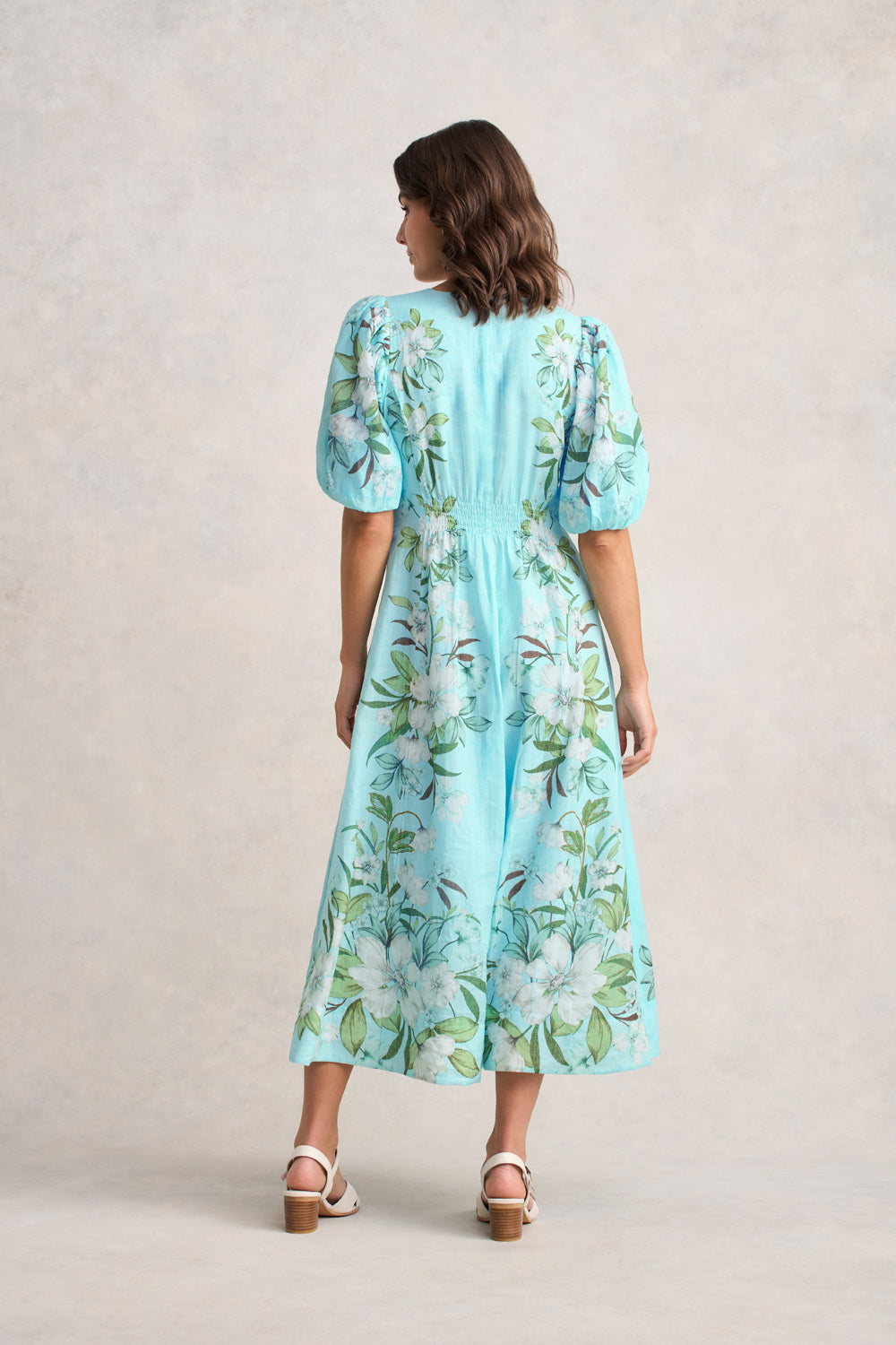 Your next occasion dress is here with our timeless Border Print Dress. Now in the vibrant Placement Print, this elegant, midi-length dress is crafted from a luxurious Ramie and Cotton blend. Fully lined, it features a puff half sleeve, almond V neckline and shirring at the back waist for a flattering finish.