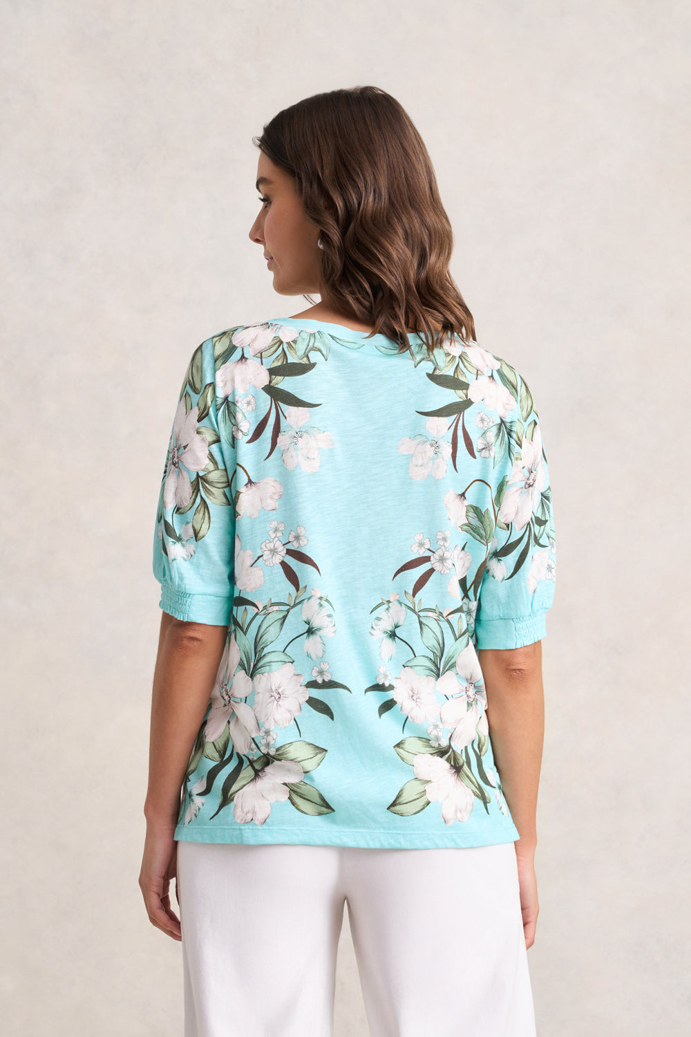 Soft and effortless, the Printed Button Detail T-Shirt is elevated with a floral placement print and delicate shell button detailing at the side. With shirred cuffs and a relaxed fit, it’s an easy piece to add colour and artistry to your everyday.