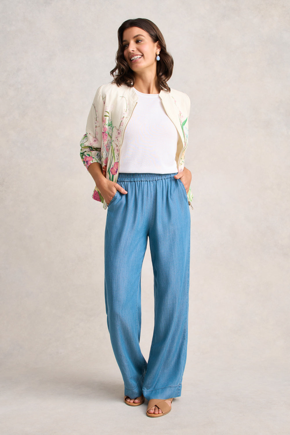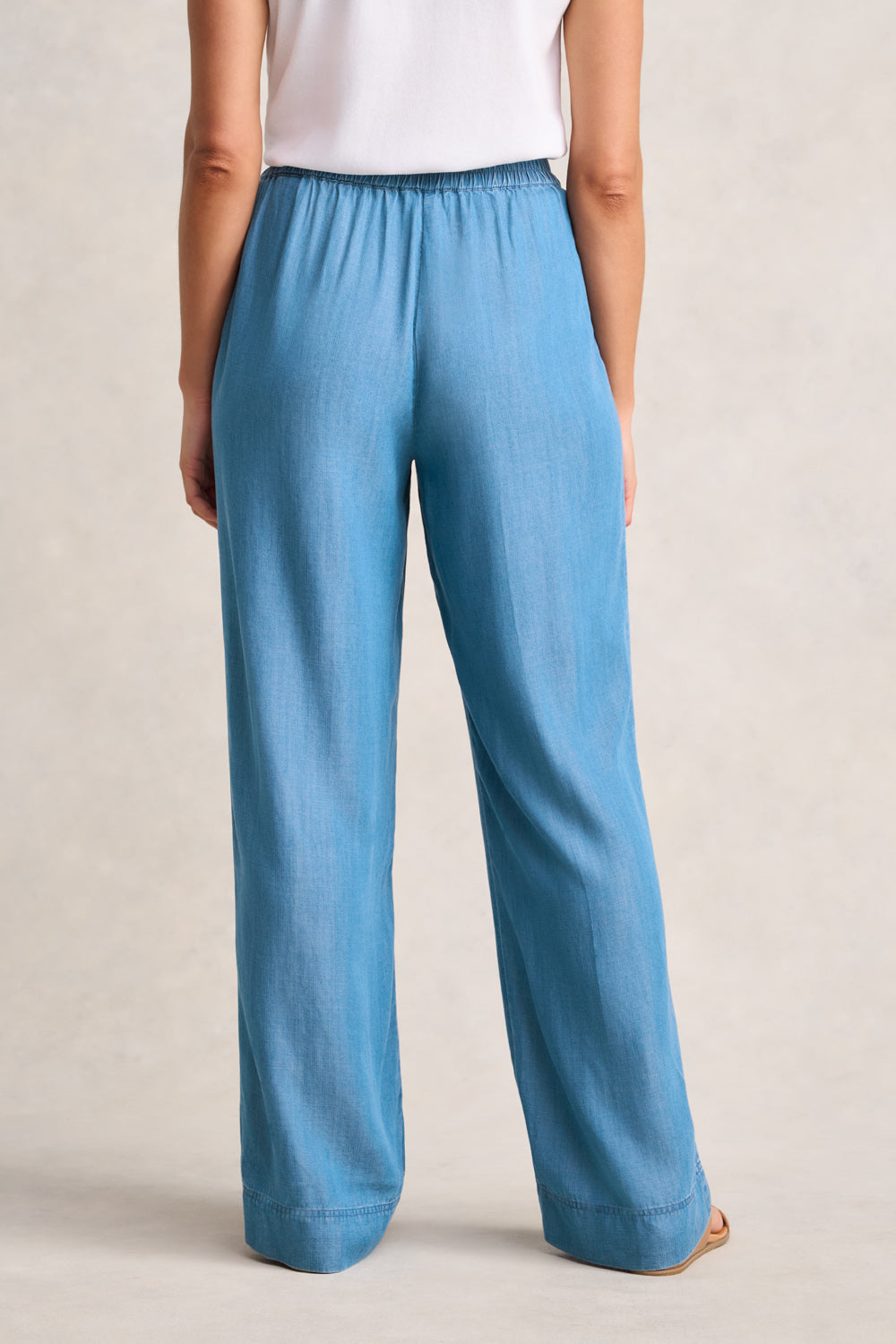 Relaxed yet refined, these Denim Chambray pants are a warm weather staple. Crafted from soft lyocell with a breezy wide leg cut, they feature an elasticated waist and practical pockets for all day comfort. Style with a linen shirt or printed blouse for effortless élégance.