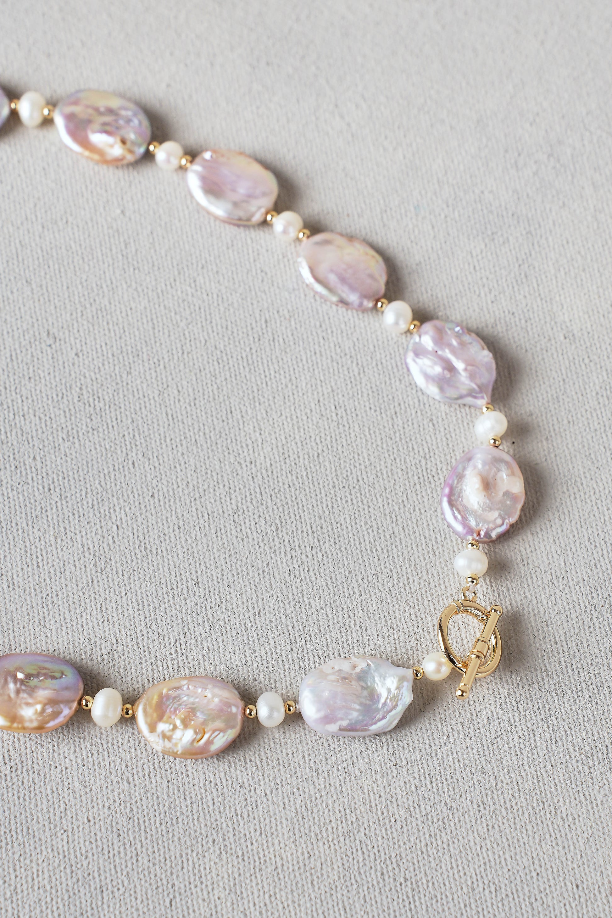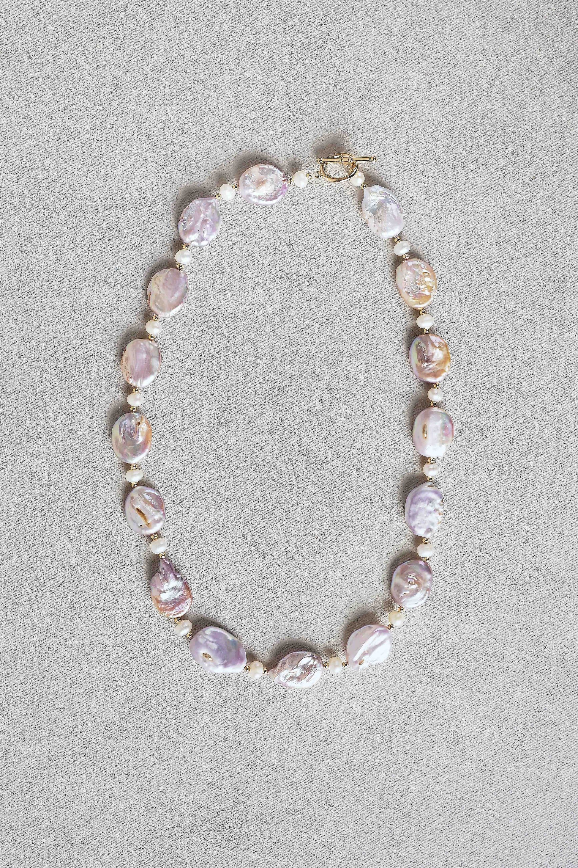 Soft pink pearls in an elegant flat shape give this necklace a modern twist on a classic. It’s a feminine finishing touch for both daytime and evening looks.