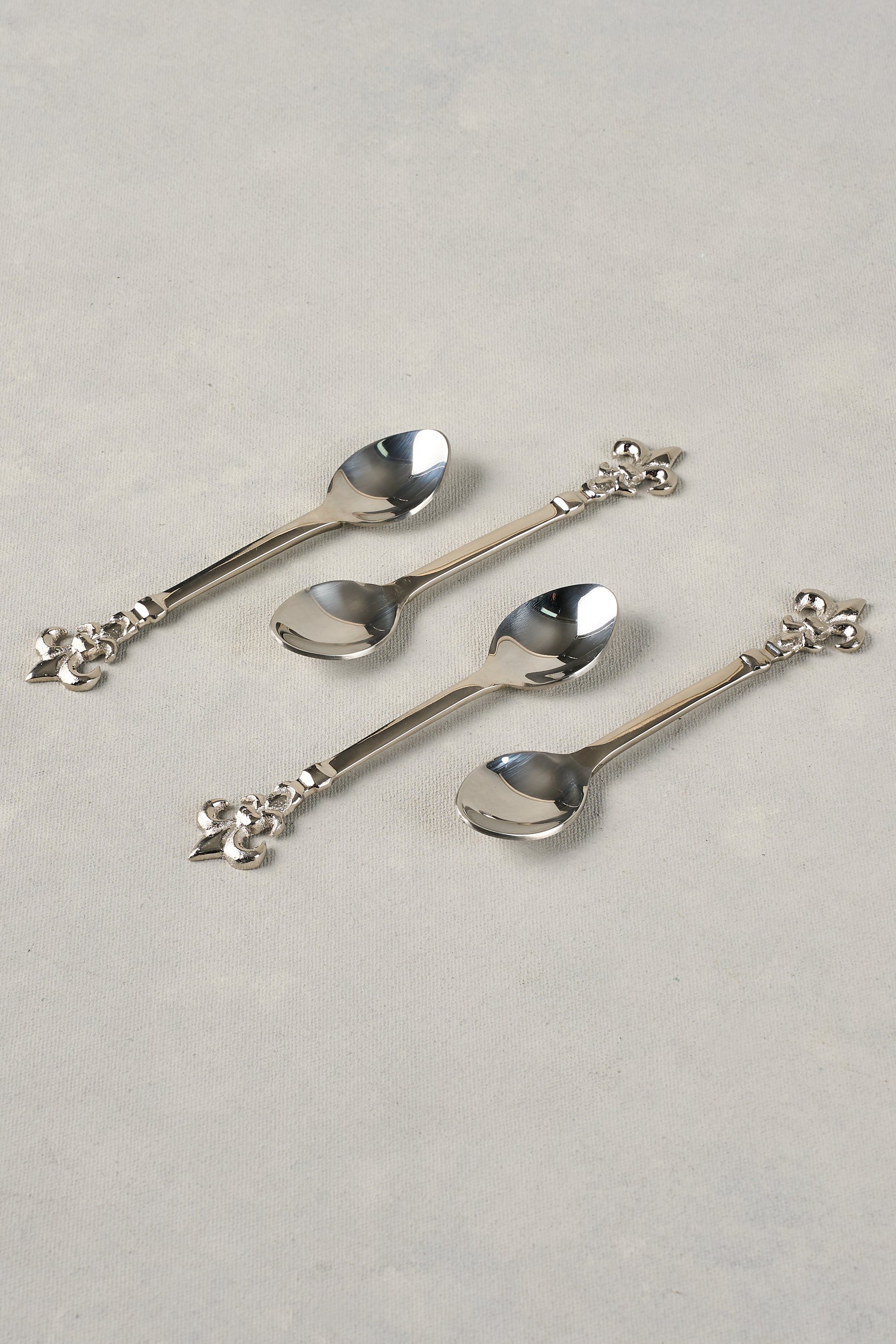 Refined and romantic, this set of four silver-toned teaspoons features delicately detailed fleur-de-lys handles. Perfect for coffee, tea or dessert, they bring a touch of French flair to every cup and course.