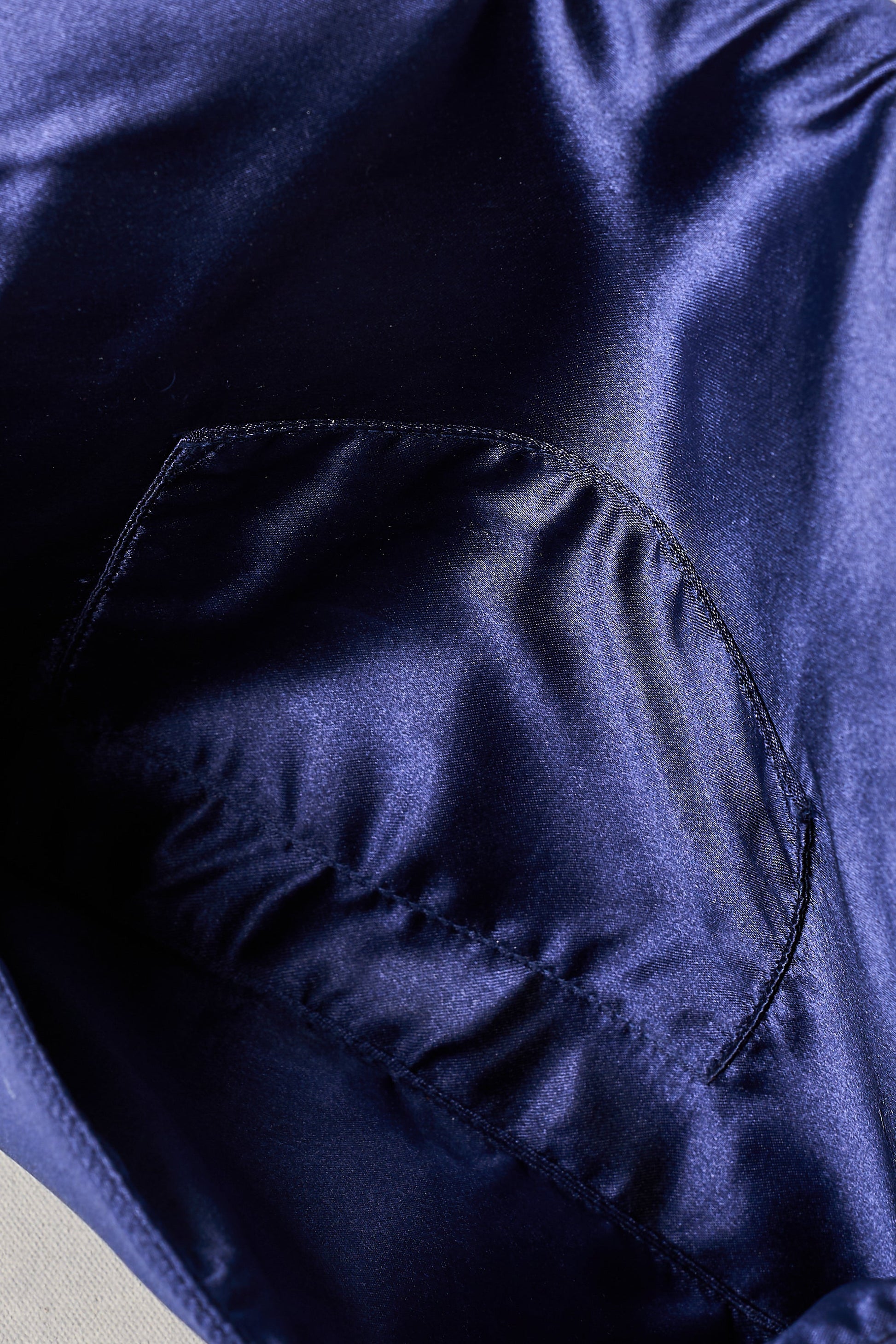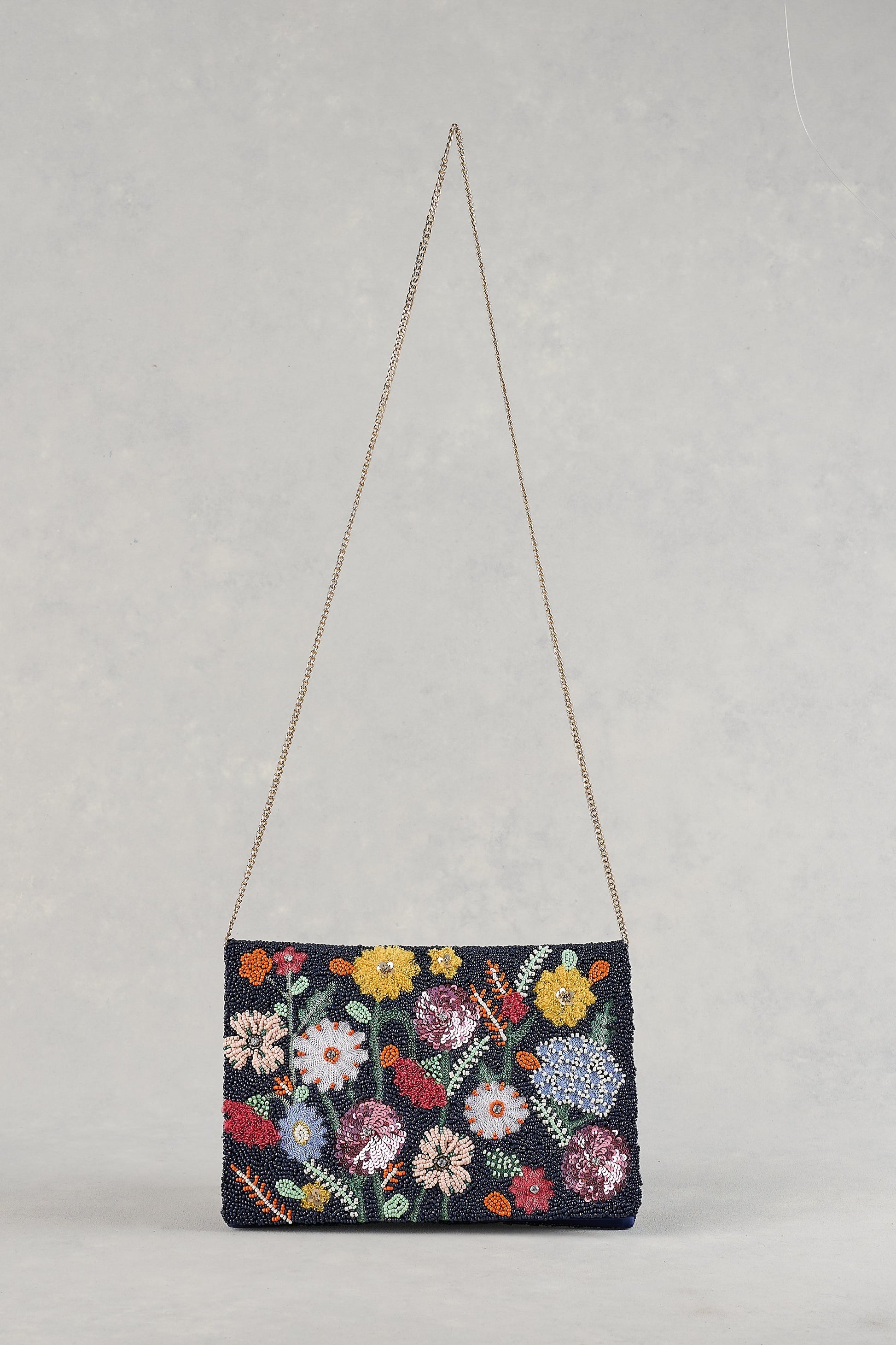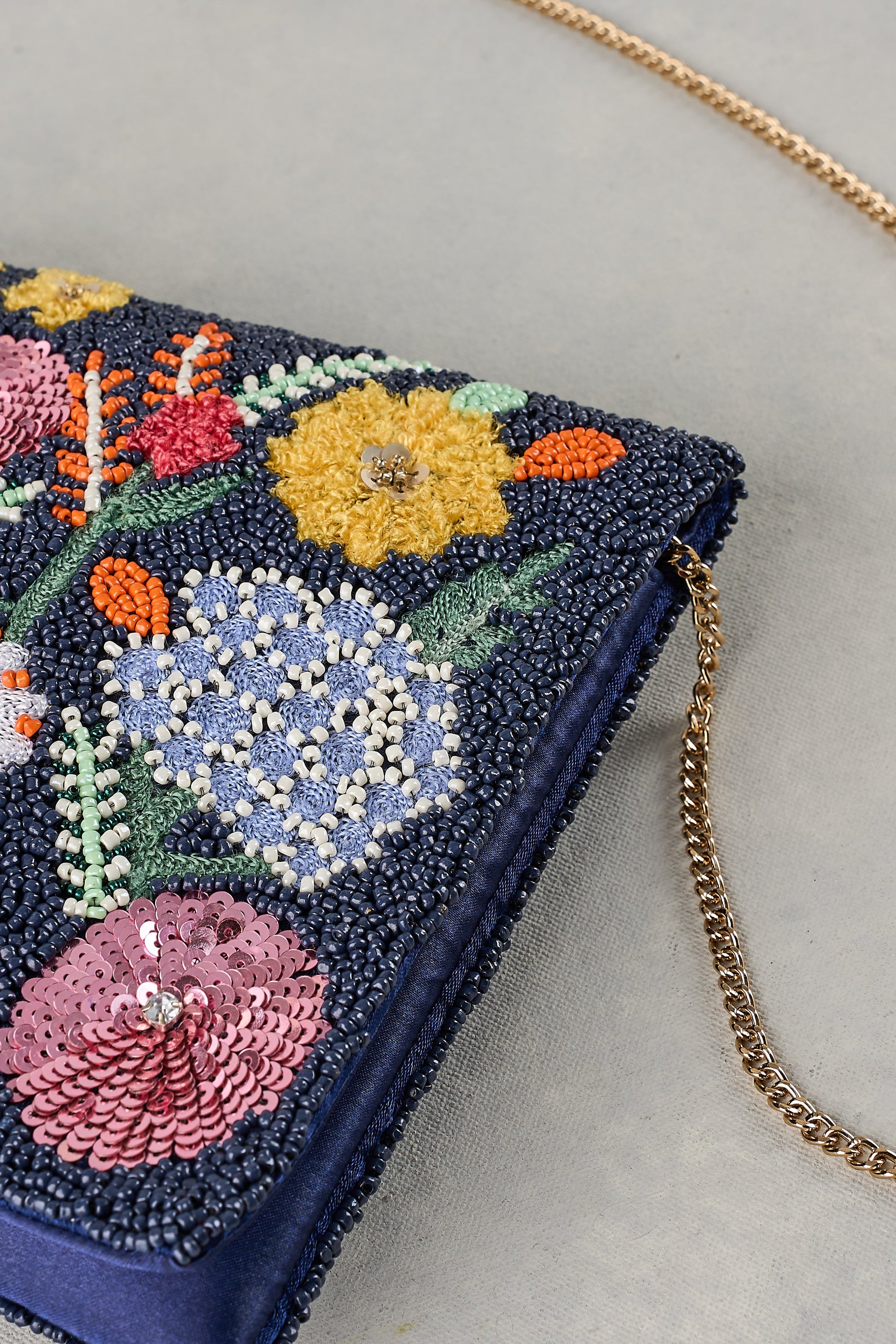 Petite, playful, and perfect for evenings. This navy clutch features intricate floral beading and a gold clasp closure. Tuck it under your arm or let it shine from the gold chain — either way, it’s très chic.
