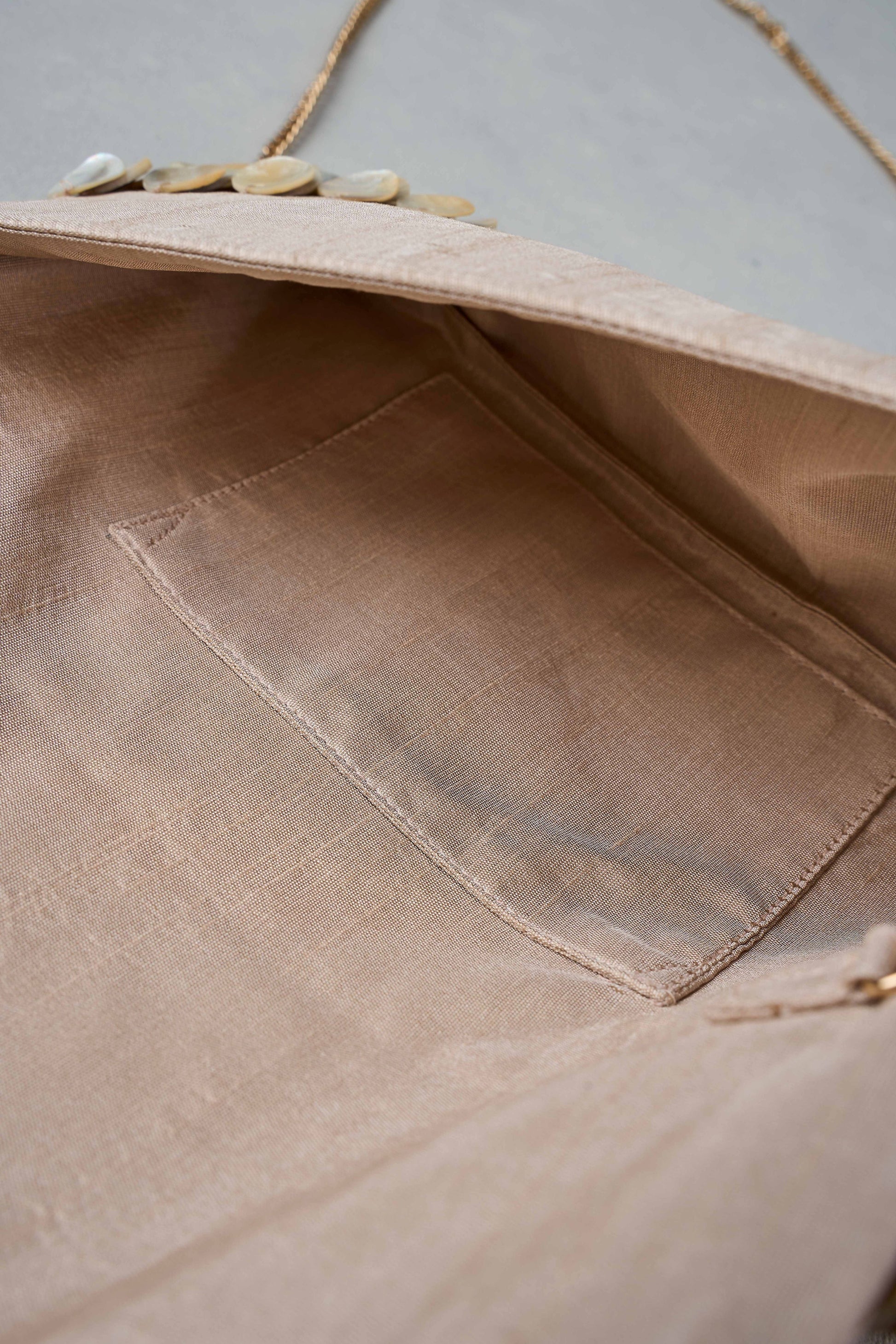 Delicate shell discs and sequins shimmer across this clutch, set against a neutral base for refined glamour. With a button closure and gold chain strap, it’s the perfect companion for weddings, long lunches, or evenings where subtle sparkle feels just right.