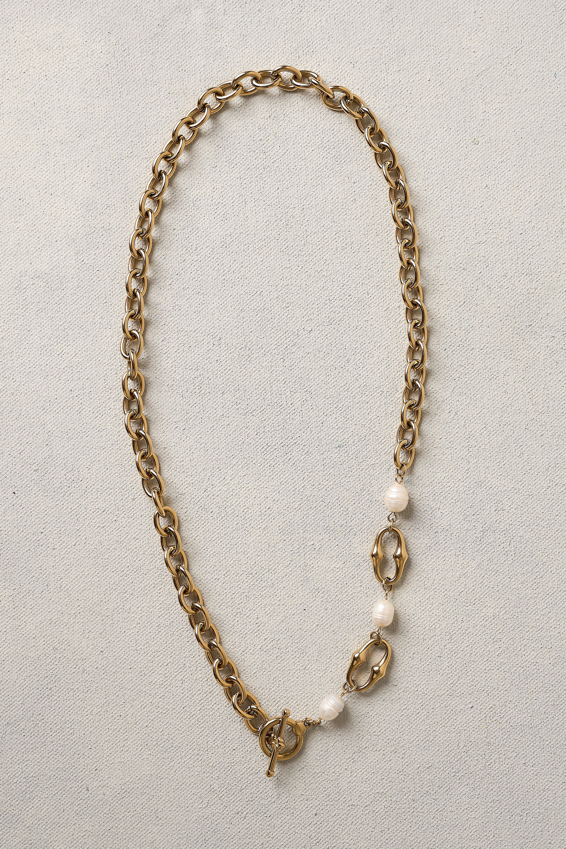 This wide link gold chain is finished with a striking trio of pearl accents. This is a statement piece that feels both contemporary and timeless.