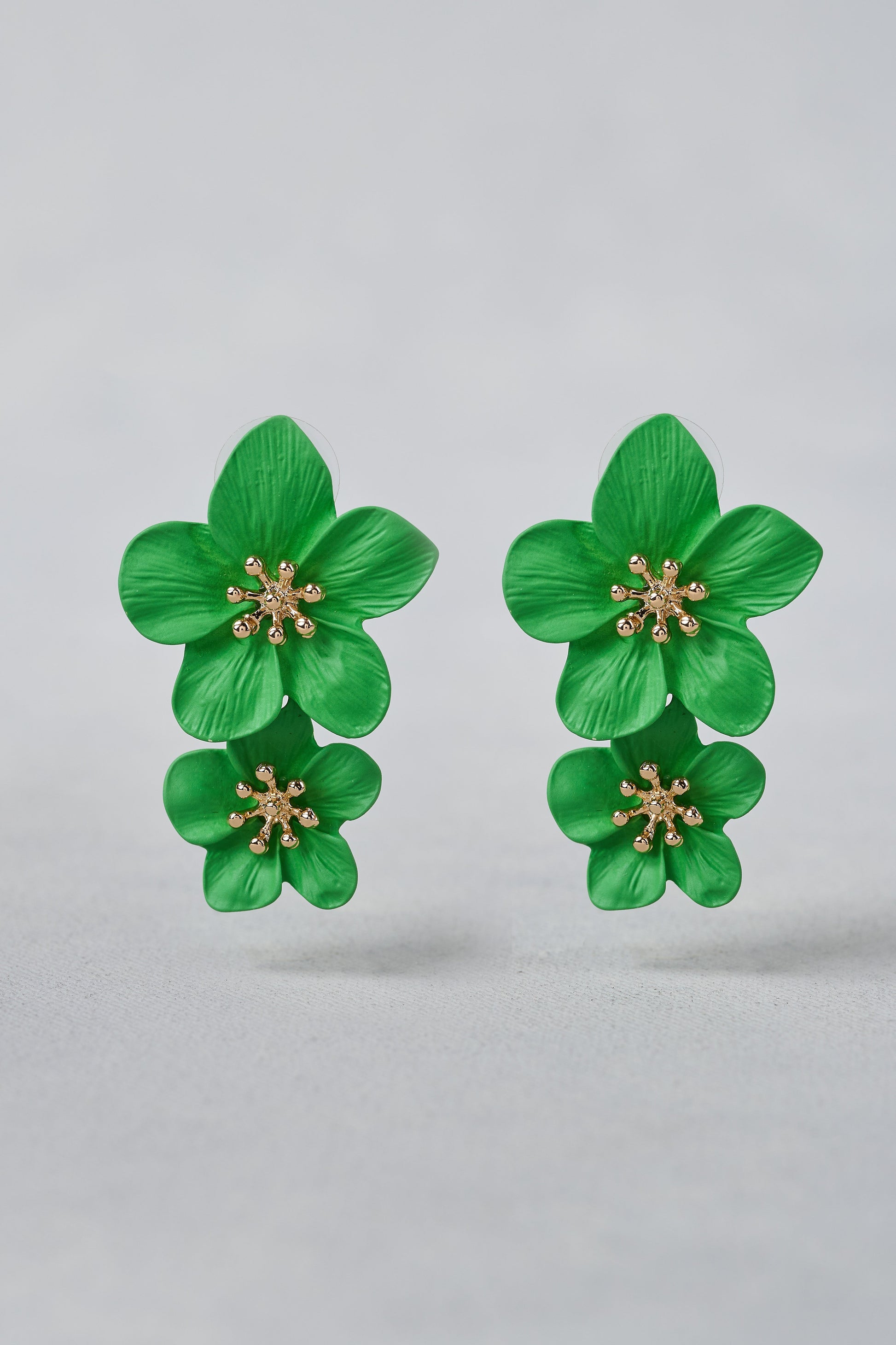 Inspired by the colourful gardens of Paris, these large floral earrings are the perfect accompaniment to the palette of our new Le Jardin des Muses collection. Featuring gold stamen with bright green coloured petals, wear this accessory to add a statement to any outfit.
