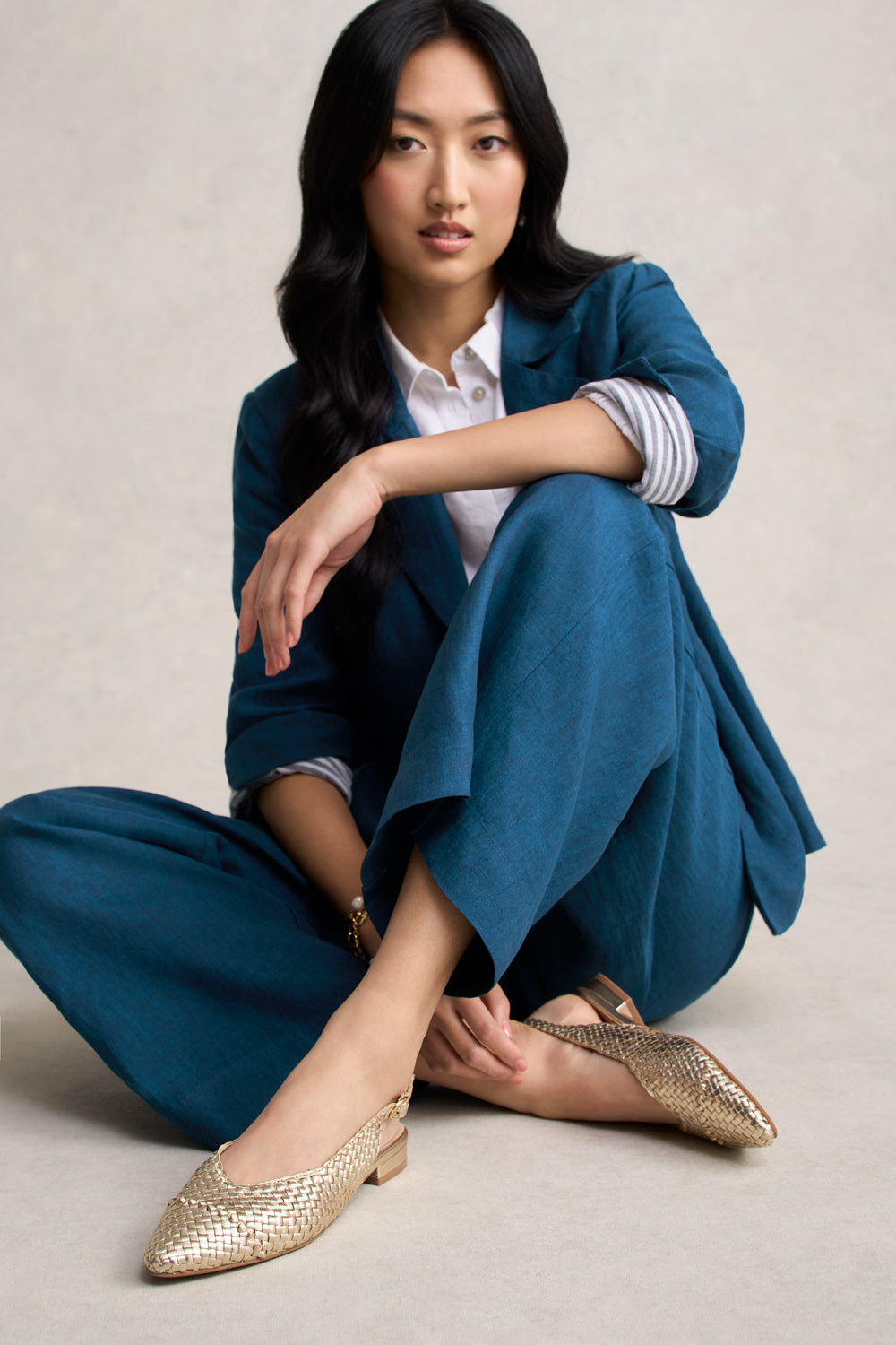 A modern take on a timeless classic, the Hazel Slingback shines in a soft gold woven finish. With a gentle heel and adjustable buckle strap, this style offers subtle elevation and all-day comfort. Feminine, flattering and effortlessly wearable, Hazel is a wardrobe staple.