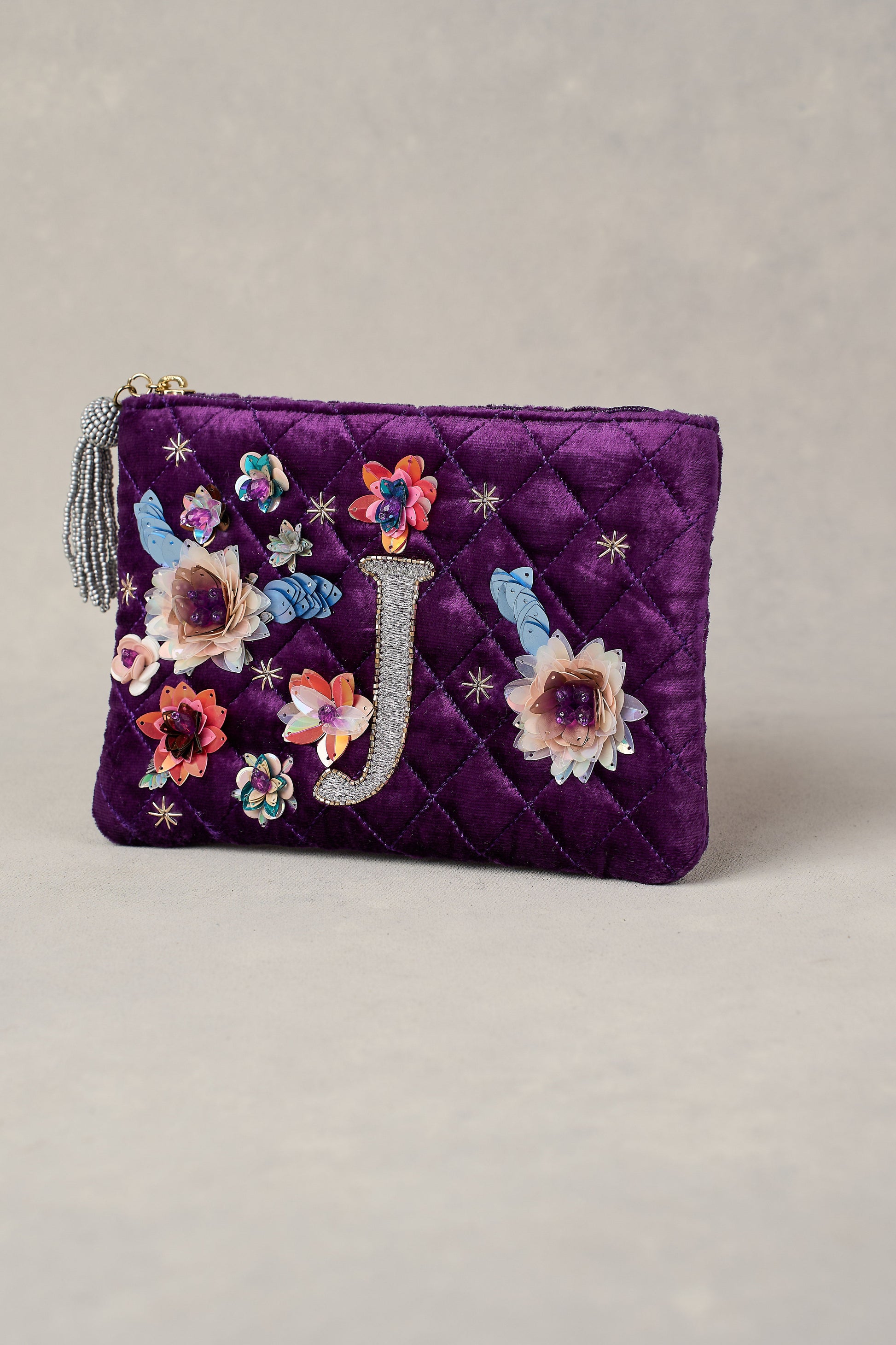 Take your cosmetics with you wherever you go in this personalised ‘J’ monogram cosmetic bag. Featuring a beautiful 3D floral design, embellished with seed beads and sequins over a purple base, add a pop of colour to your beauty regime. This bag makes a lovely personal purchase or thoughtful gift for someone special this Mother’s Day.