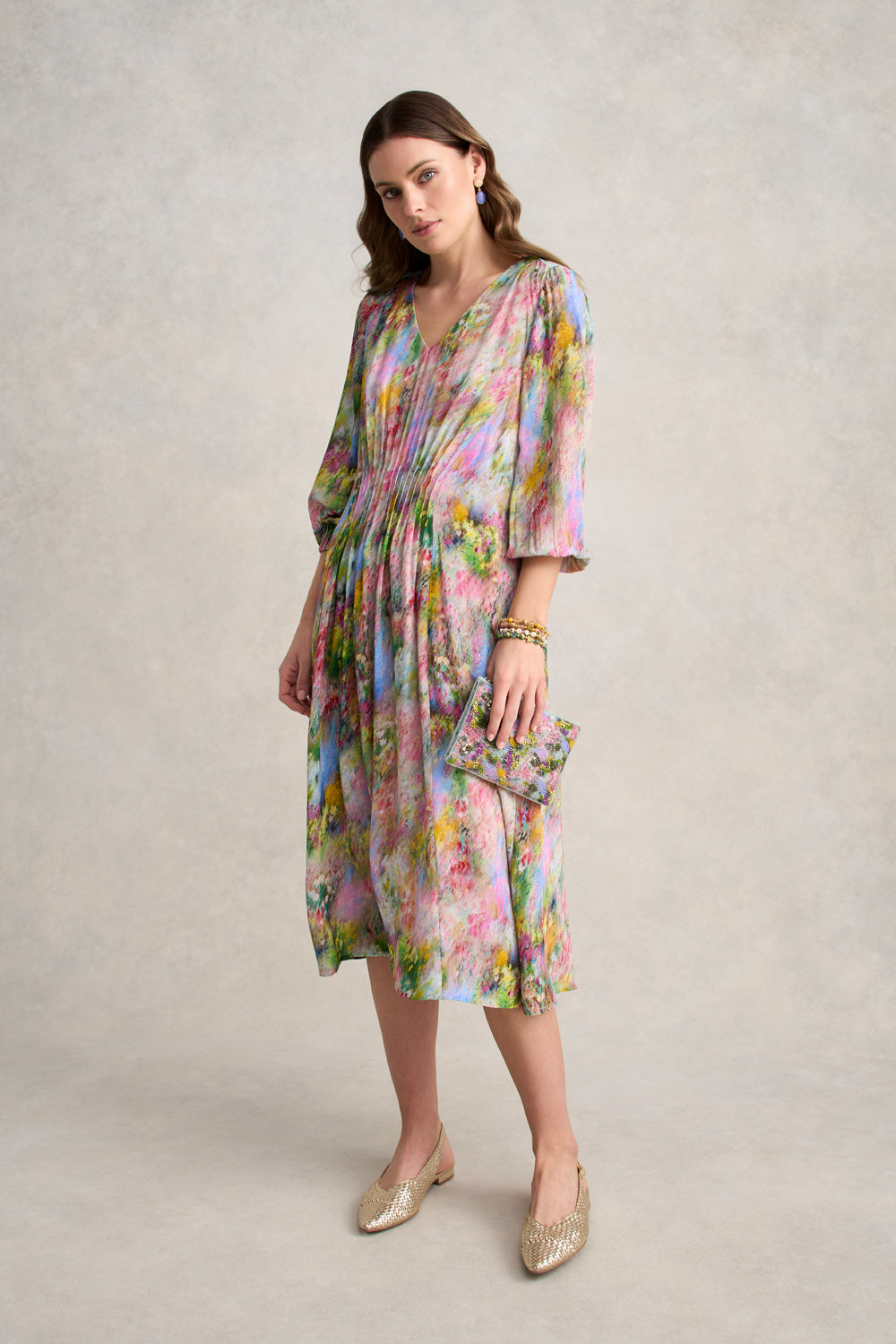 Light as air and softly structured, this midi dress is crafted in our exclusive Meadow Print for a fresh, feminine feel. Pintuck detailing through the bodice and hem adds subtle texture, while blouson sleeves and gentle gathers create graceful movement. Fully lined for comfort, it’s a piece that feels just as beautiful to wear as it looks.