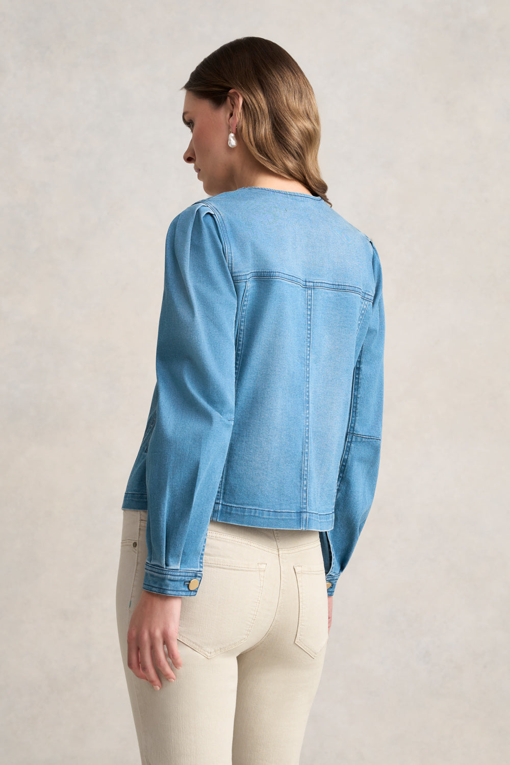 A feminine twist on a classic denim jacket, this collarless design features sculptural puff sleeves and brushed gold buttons. Stretch denim ensures comfort and functionality, from weekday layering to weekend strolls.
