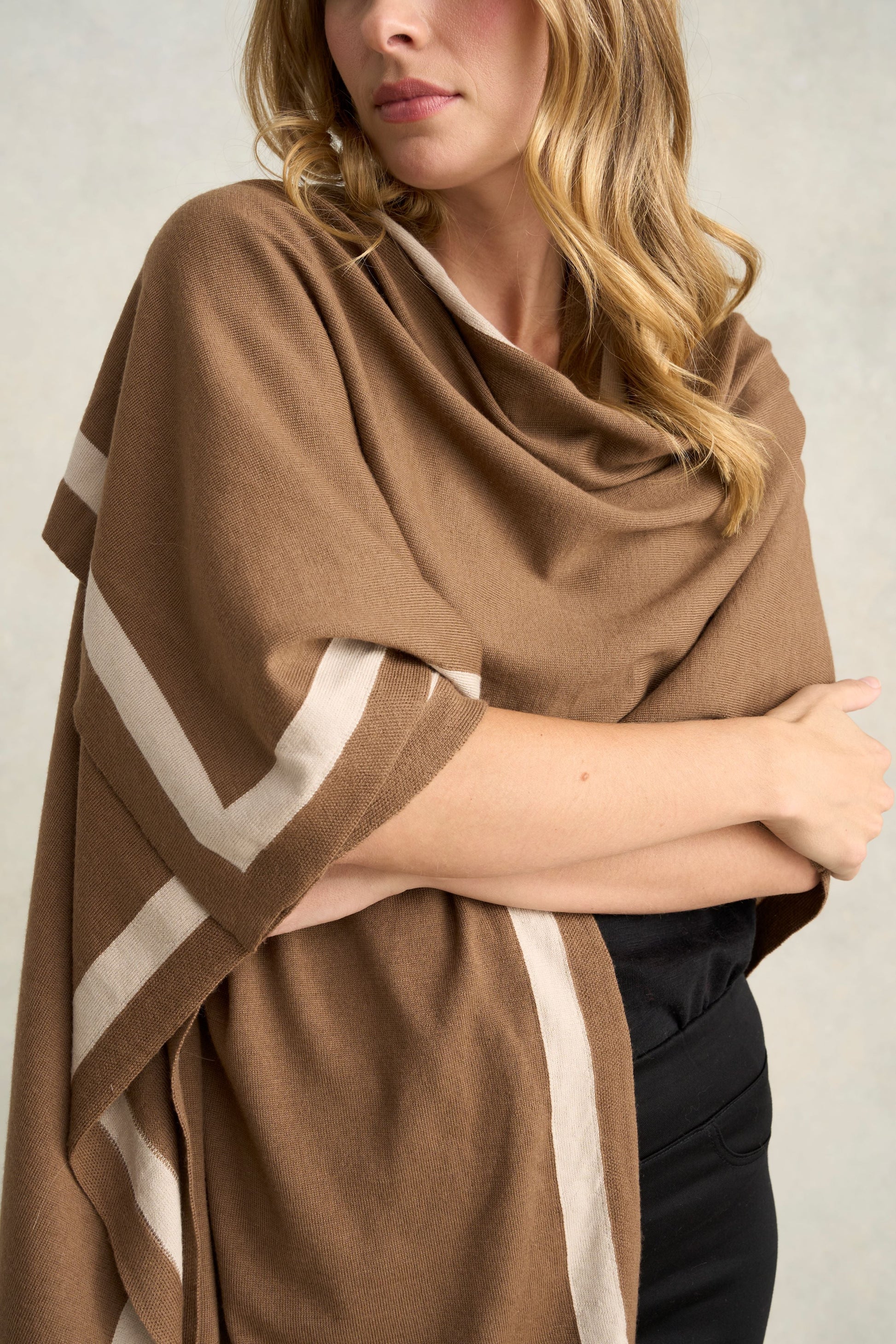 The Julie Merino Wrap is a luxurious blend of warmth and style. Crafted from soft Merino wool, it features a chic striped border design and flattering centre back seam. With a graceful drape, in an elegant tan and cream hue, it’s perfect for throwing over your shoulders in the cool weather.