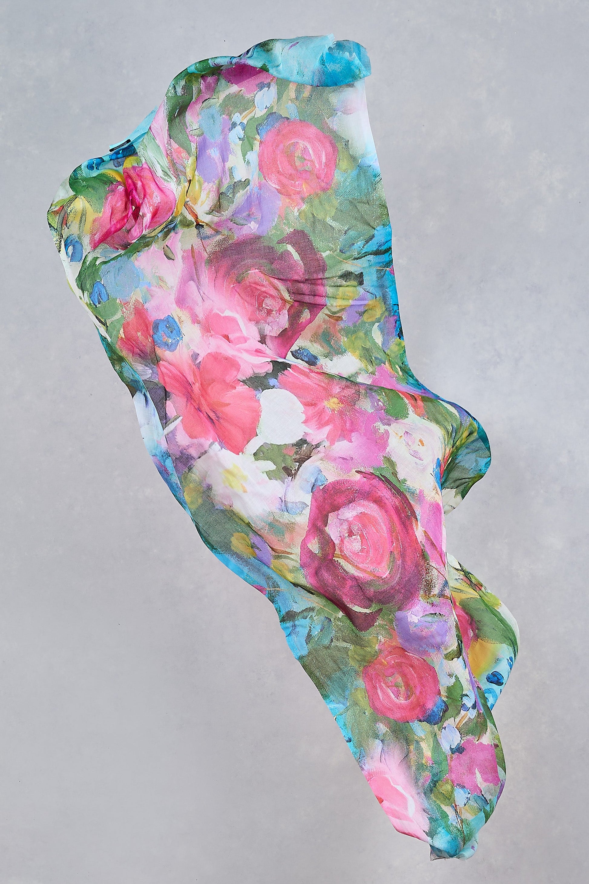 Bursting with painterly blooms in fuchsia, lilac, turquoise and green, this cotton-modal scarf makes a bold statement. With softly frayed edges and a generous length, it’s perfect for draping over neutral outfits or adding a pop of colour to summer dresses.