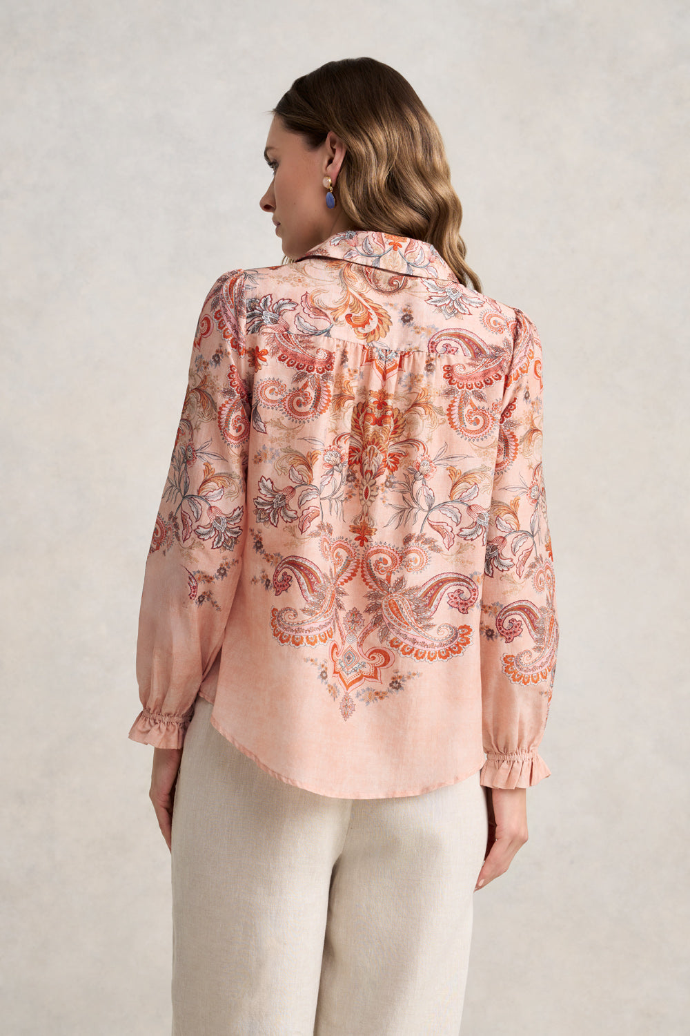 Light as air and softly luminous, this cotton-silk shirt is a dream to wear. The intricate Peach Paisley print brings warmth to each wear, while elasticated cuffs and gentle gathers offer a relaxed drape with a touch of elegance.