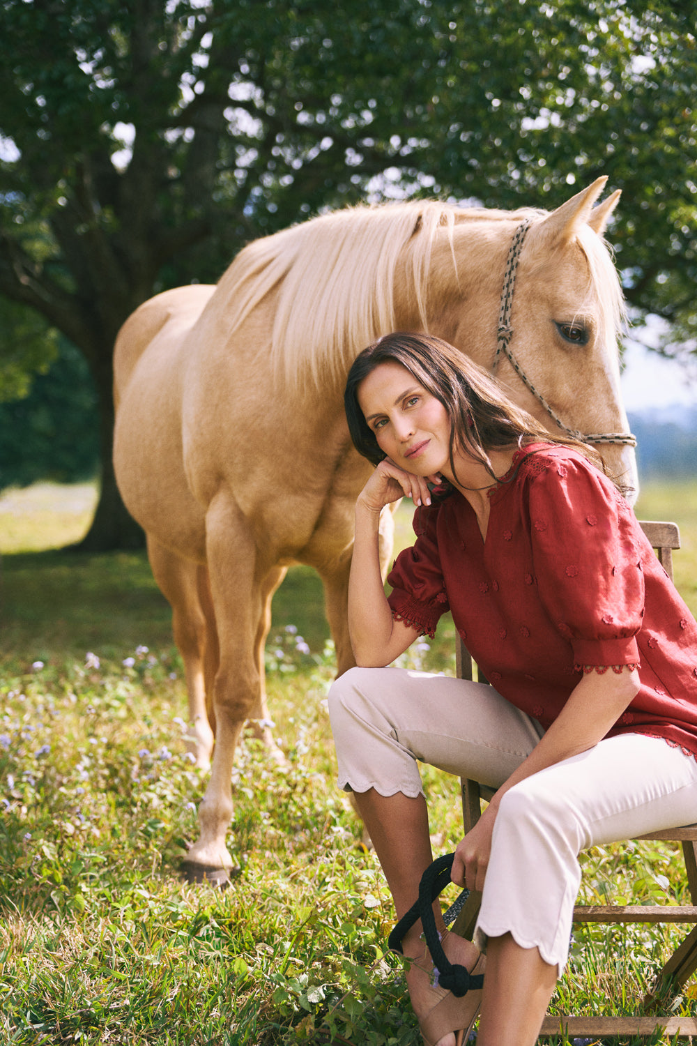 Delicate and detailed, this French linen top exudes feminine charm. With 3D floral appliqués, lace inserts and scalloped edges, it feels romantic yet grounded. The rich crimson hue pairs beautifully with soft neutrals or washed denim for effortless elegance.