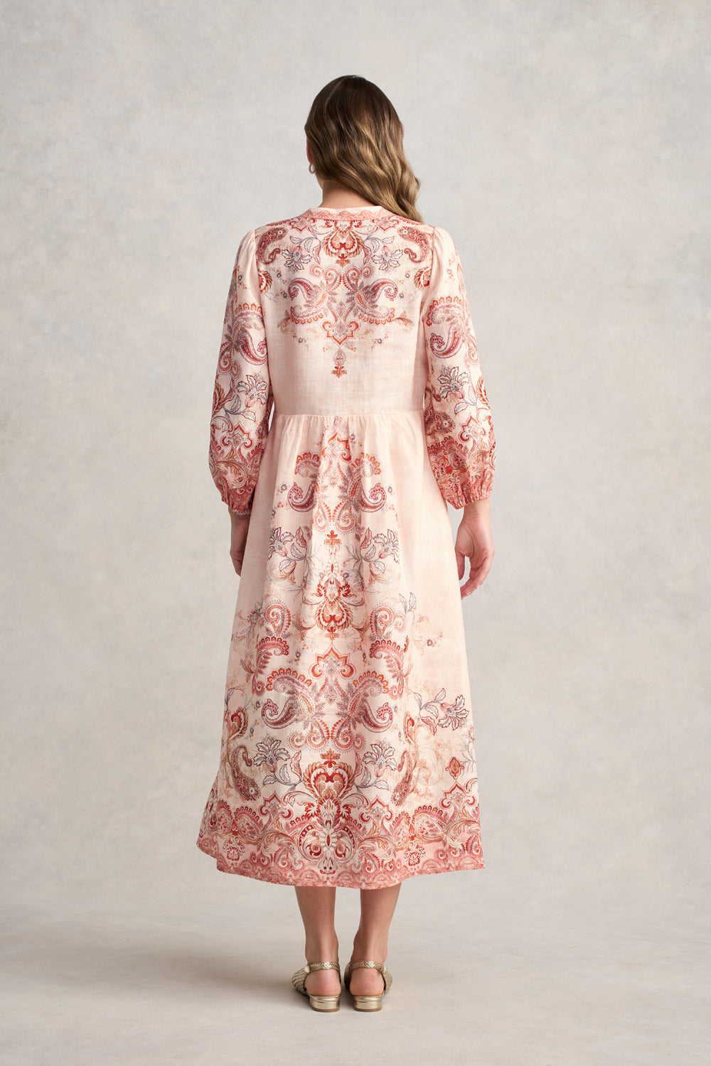 Elegant and expressive, our French Linen Dress is made for moments that call for something special. The new Peach Paisley Print is artful and refined, while a softly shirred waist, flowing silhouette and full raglan sleeve create a sense of quiet drama. Whether for a long lunch or a night out, it brings a touch of tres chic to every step.
