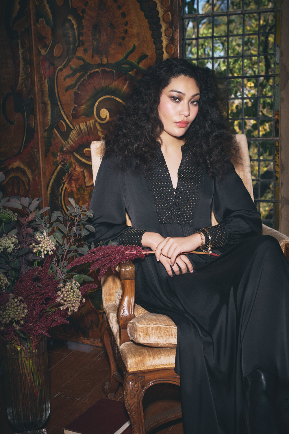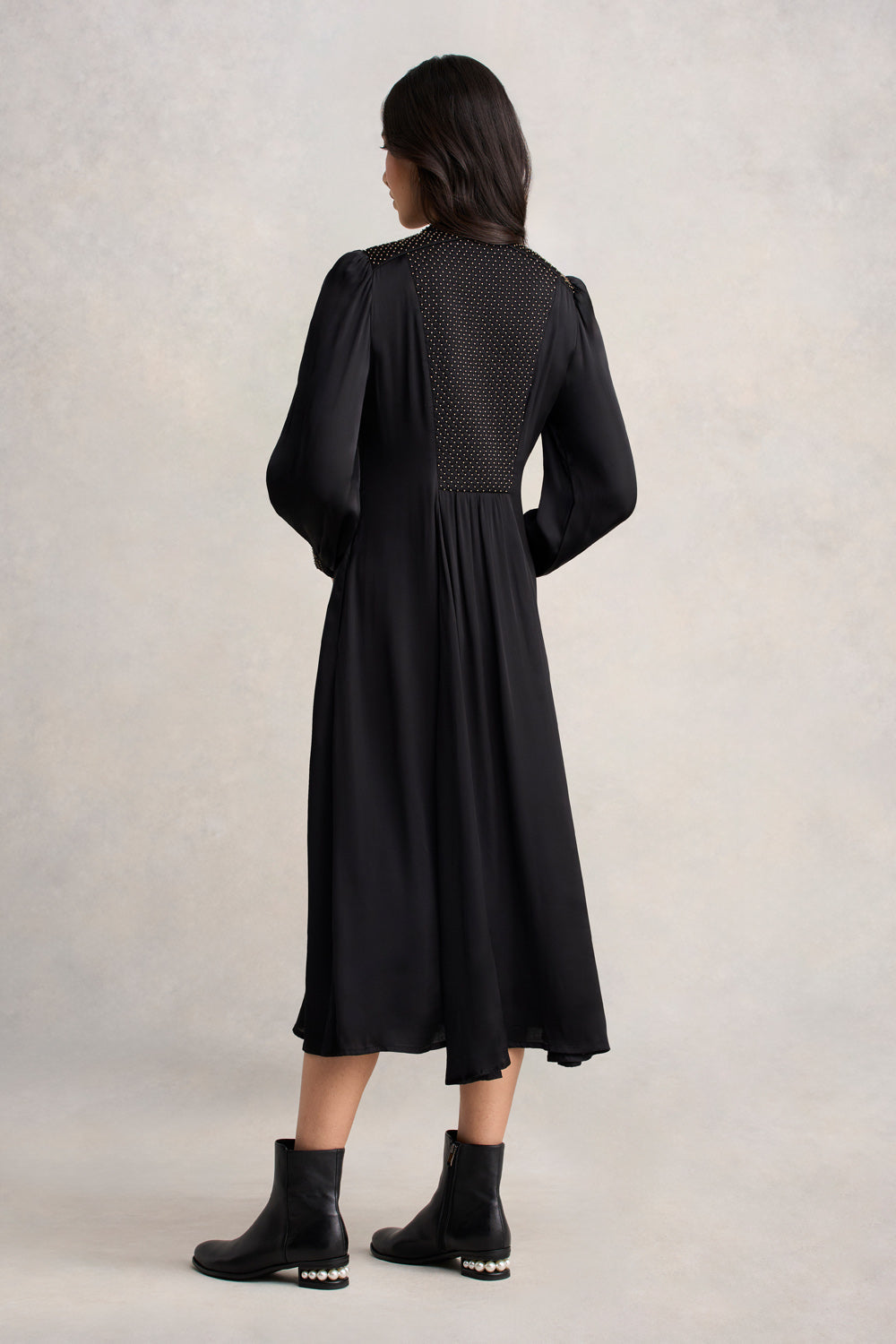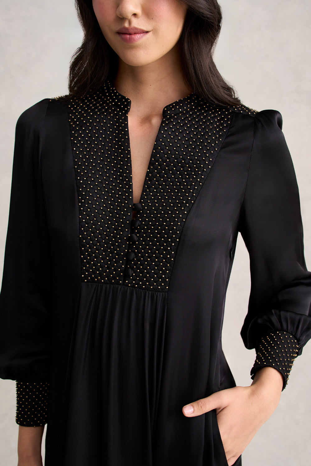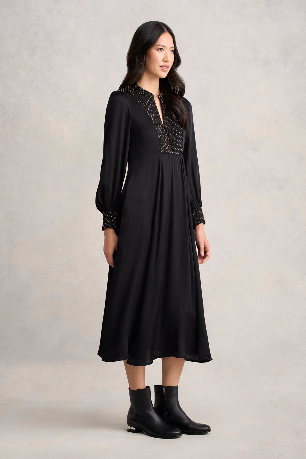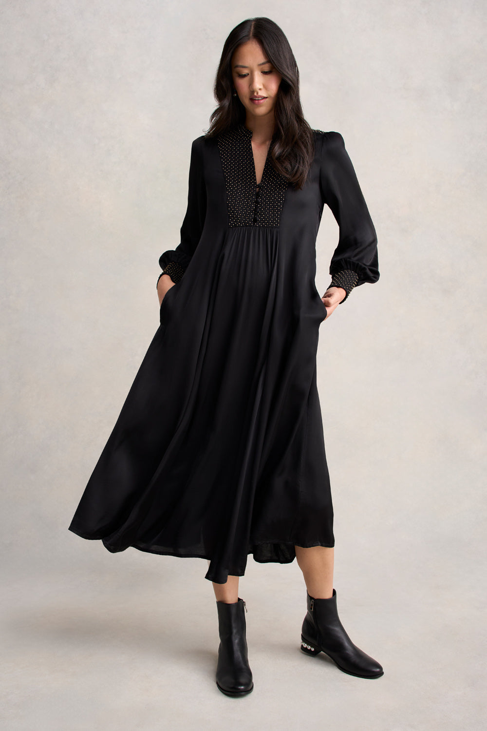 Our elegant Beaded Smock Dress, crafted from luxuriously soft viscose sateen, combines both elegance and comfort. Featuring quilted beading in bronze along the bodice, cuffs, and back, this Black midi dress has a flattering flared silhouette with gathering at both the front and back. The cutaway neckline, self-fabricated buttons and side pockets add style and practicality.