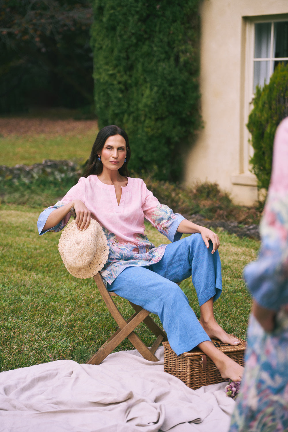 With a gentle drape and Denim Chambray cross dye effect, these French linen pants are made for easy elegance. The wide-leg silhouette flows beautifully, while an elastic waist and self-tie belt add comfort and subtle detail. Style with our Printed Linen Tunic or simple white tank — et voilà, effortless charm.