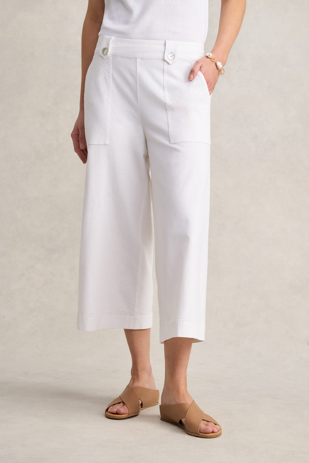 Breezy, beautiful and effortlessly refined — our Linen Culotte is crafted for warm-weather with timeless style. Cut in a wide-leg, cropped silhouette, it features a flattering flat front with tab and button detailing, and functional patch pockets. Pair with a linen shirt or colourful tee for an easy summer look.