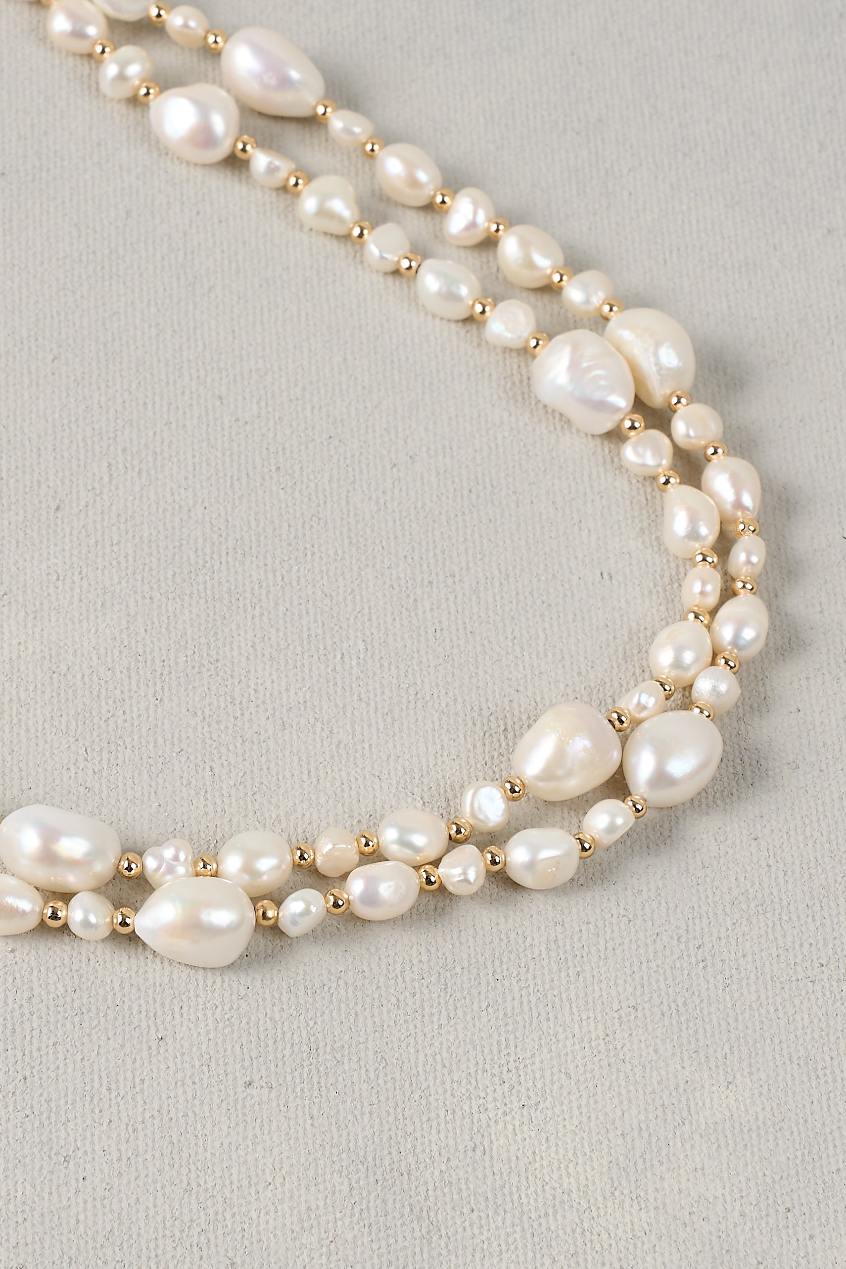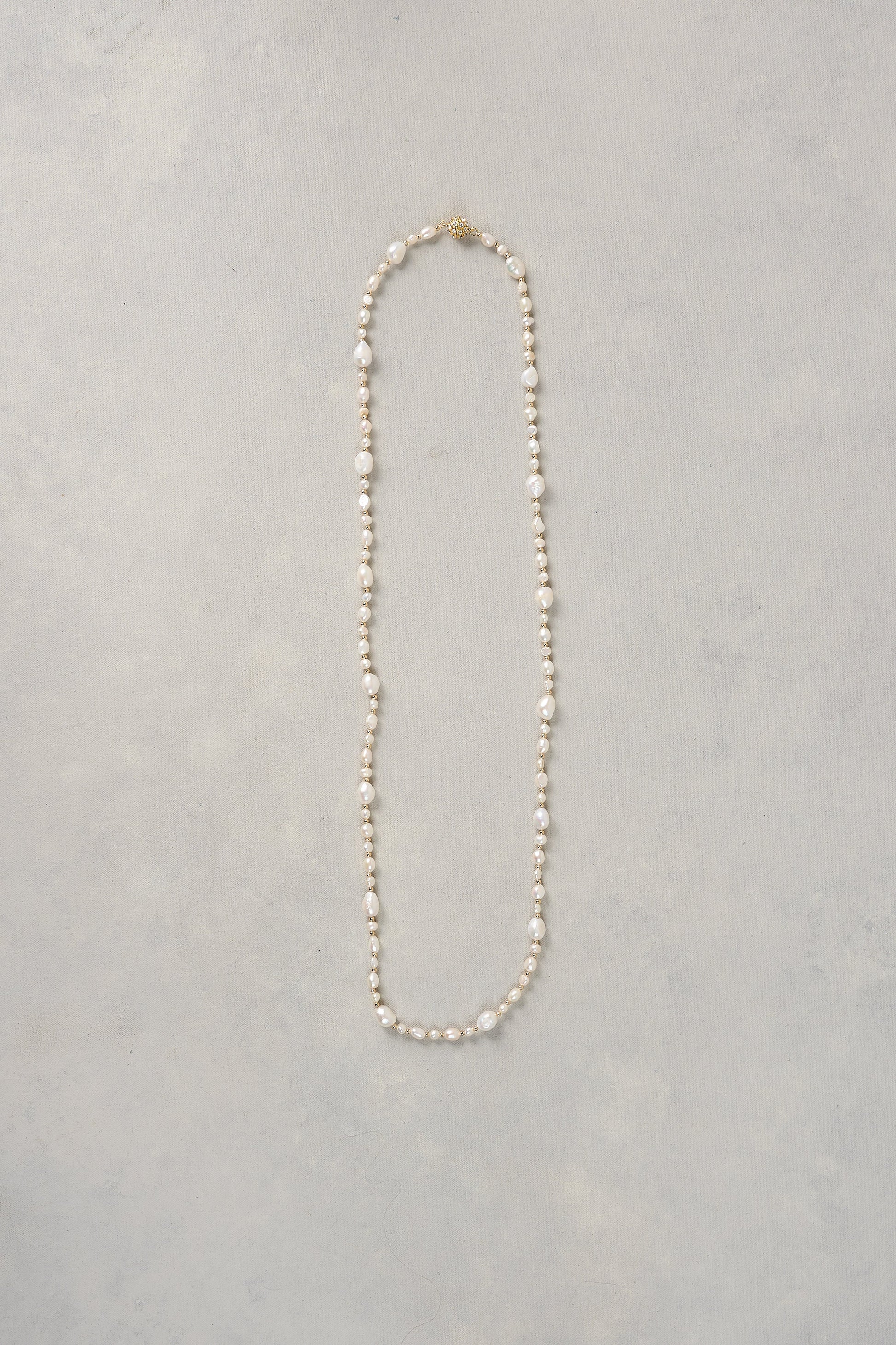 Elegant in its length and simplicity, this cream pearl necklace is adorned with delicate gold beading and organic-shaped pearls. With a magnetic closure for ease, it layers beautifully or wears solo as a refined statement.