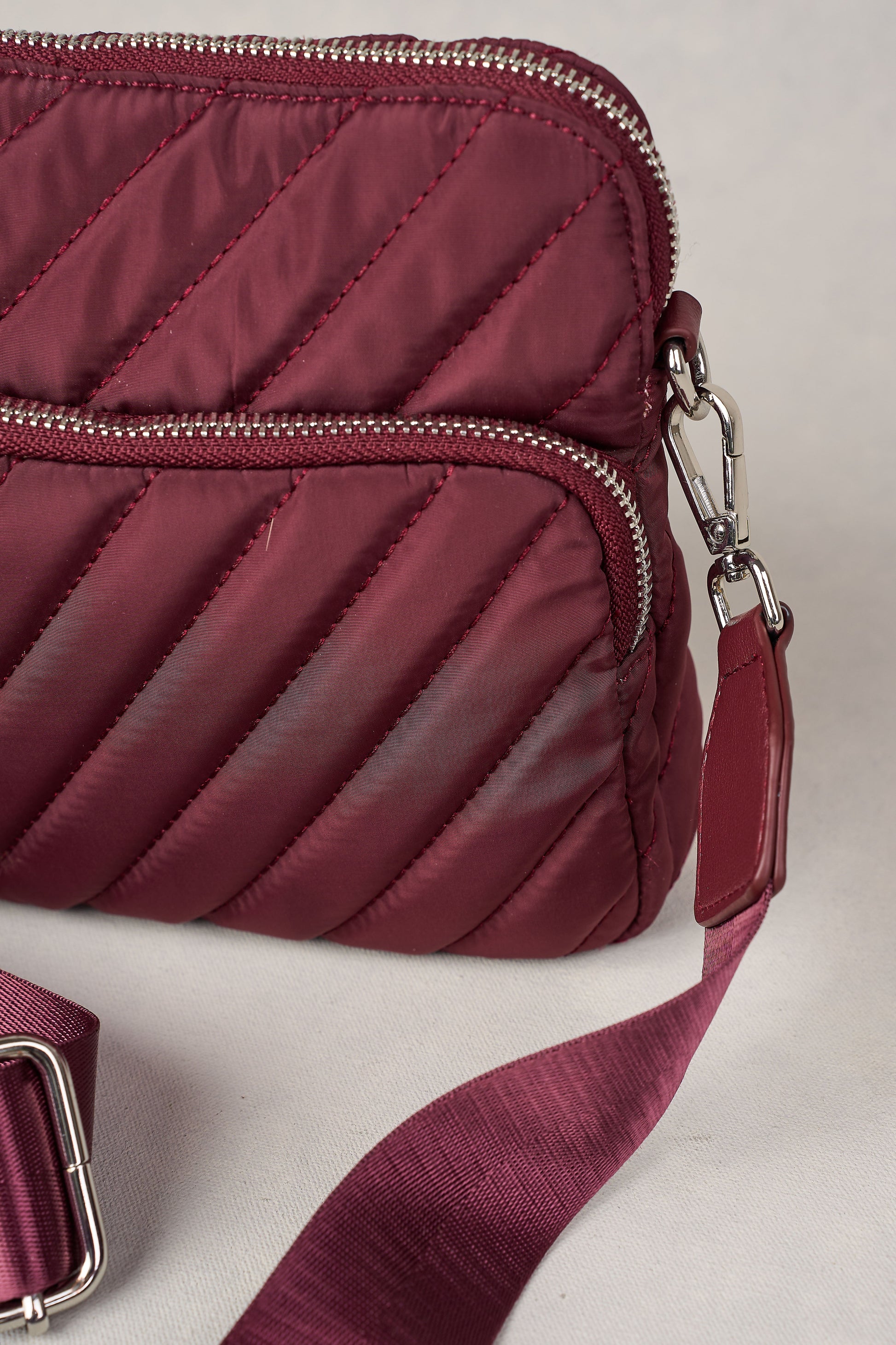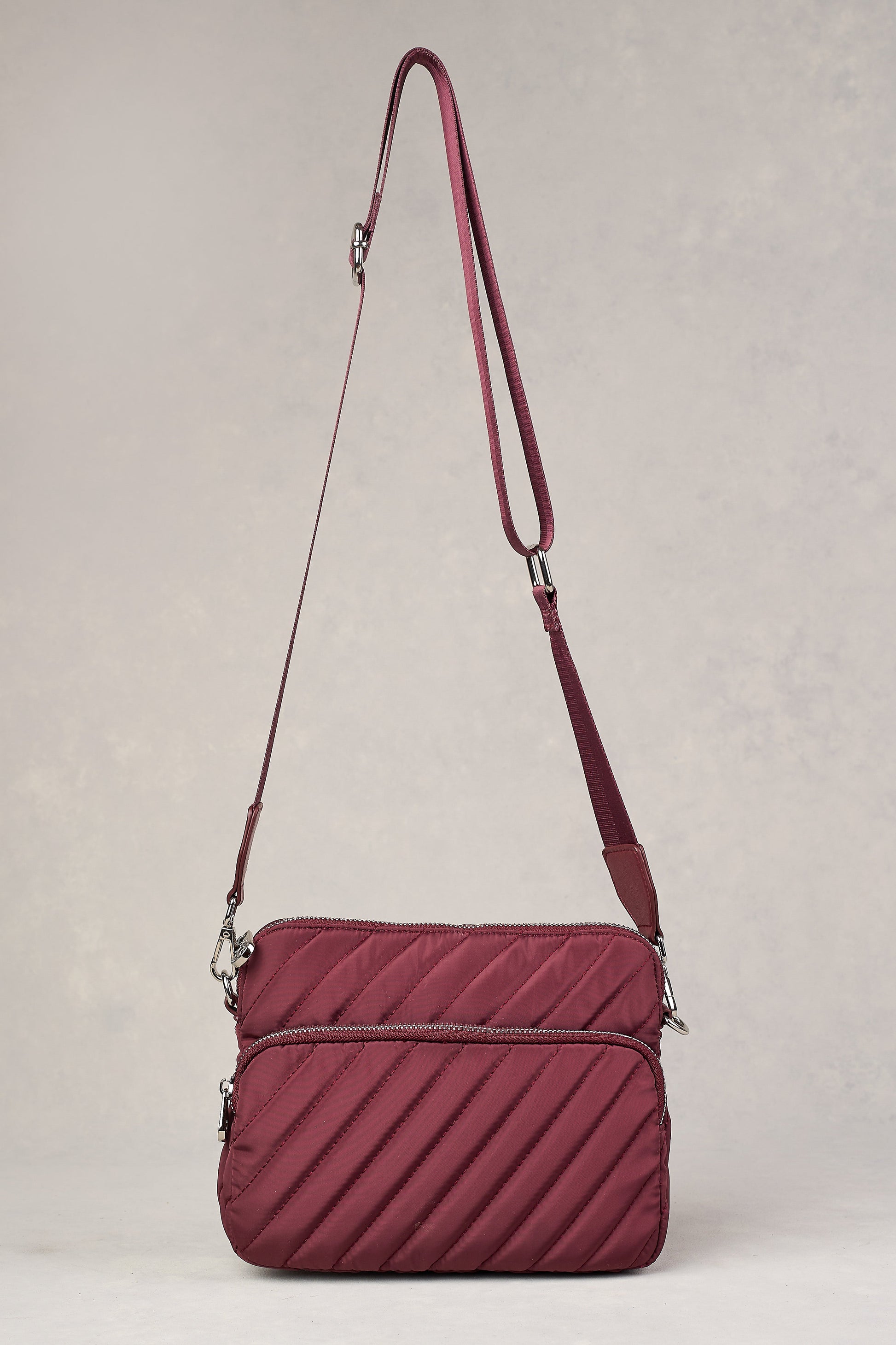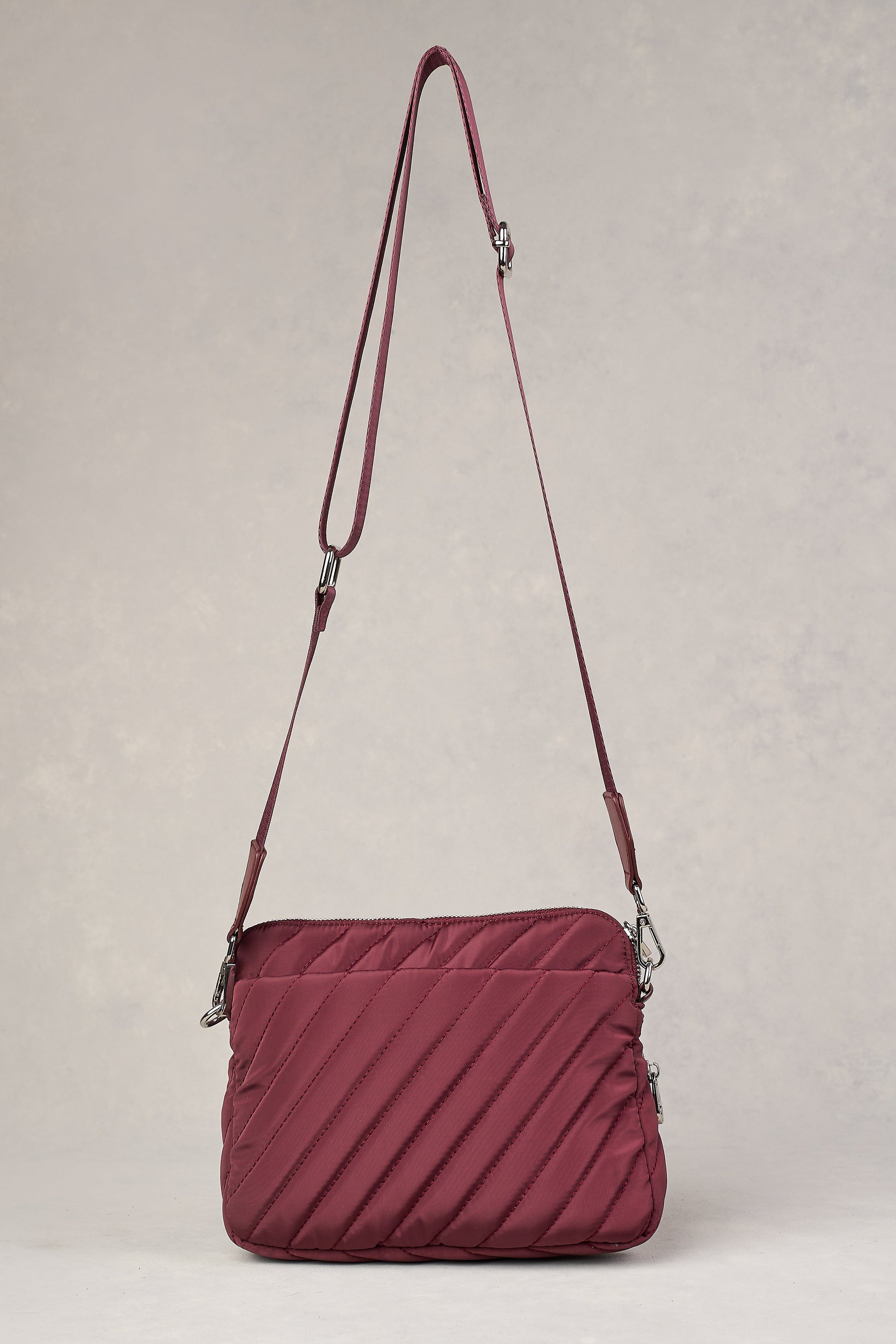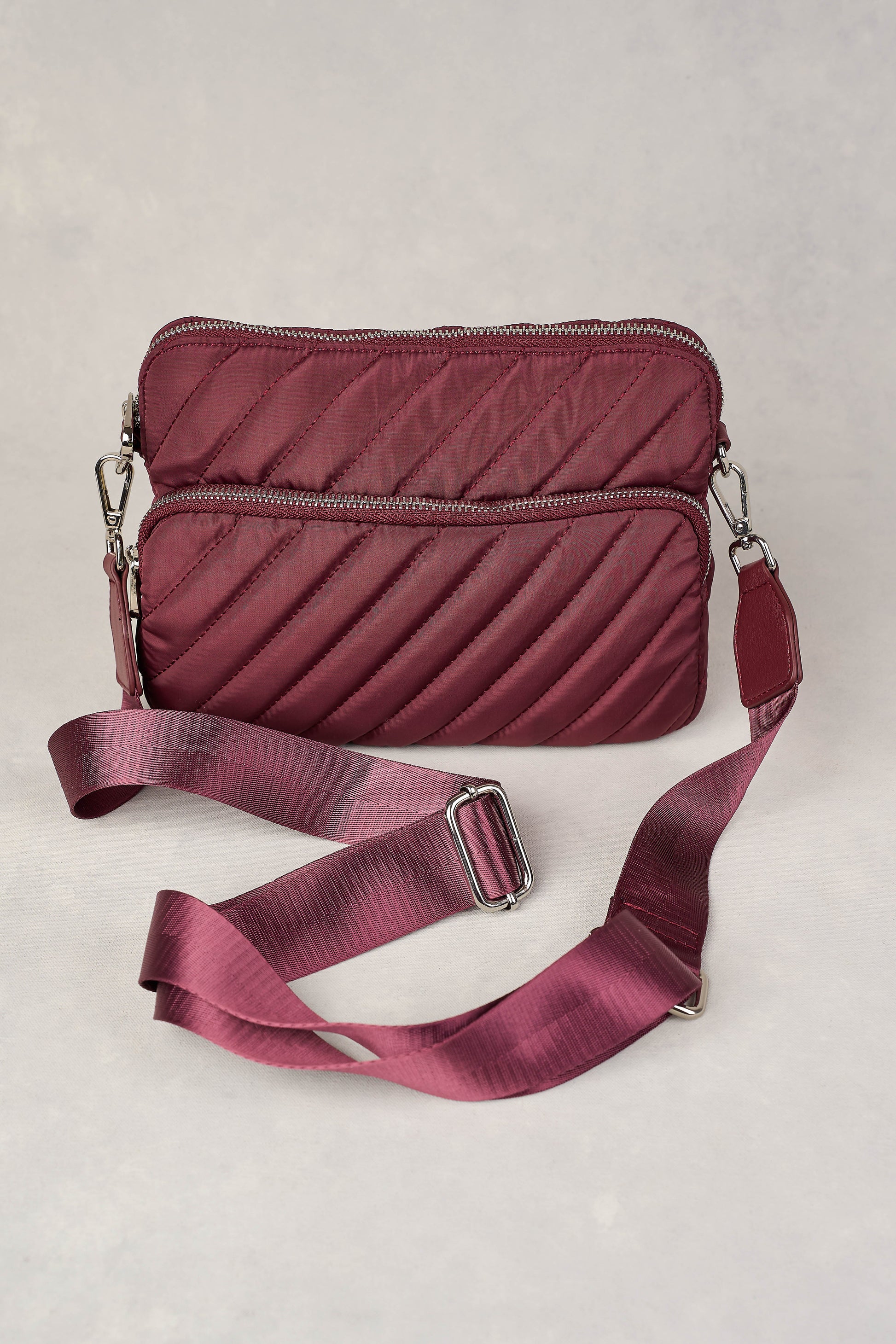 Designed to be worn across the body, the Manon Quilted Crossbody Bag in merlot est ici. Great for travel and featuring pretty diagonal quilted detailing, this bag has plenty of storage and a comfortable woven guitar strap that is both adjustable and detachable. Complete your look with this simple yet chic design.