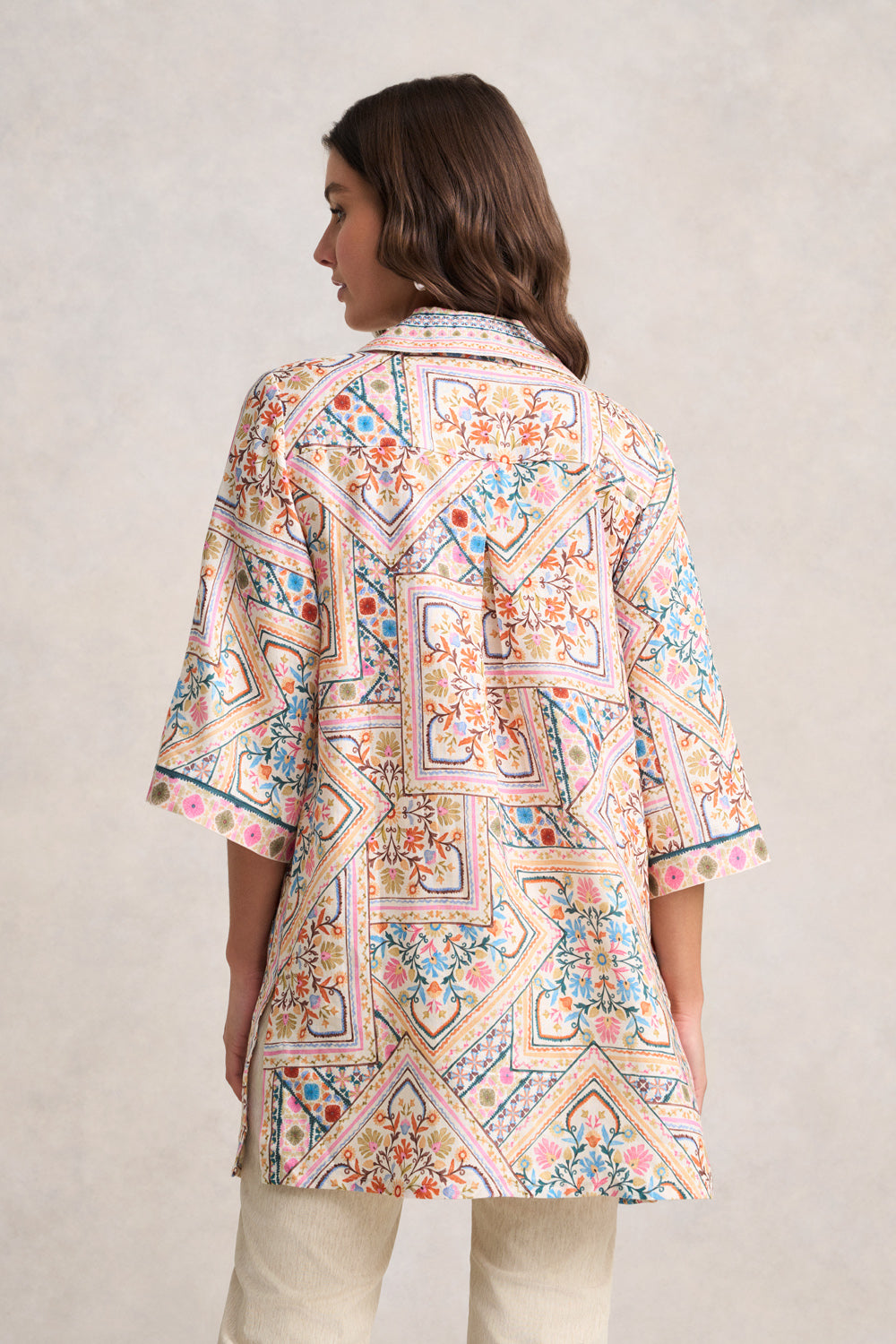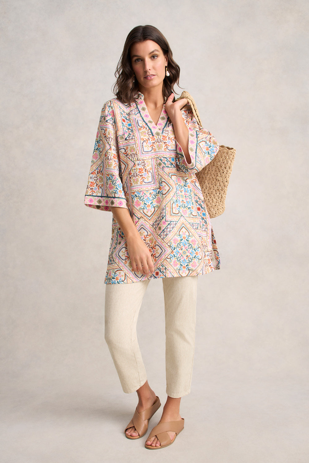 Effortless and artistic, our French linen Collared Kaftan showcases our signature Tile Print with contrast trim for a refined finish. Its flowing silhouette, cutaway neckline and wide sleeves create an air of relaxed sophistication — the perfect piece for sunlit lunches or balmy beach strolls.