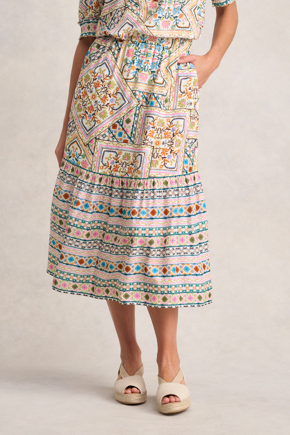 Part of our latest Mosaique de Couleurs collection, this midi-length skirt showcases our new Tile Print. It features a comfortable elasticated waistband for all-day wear and pairs with our matching Rayon Blouse to create a matching set.