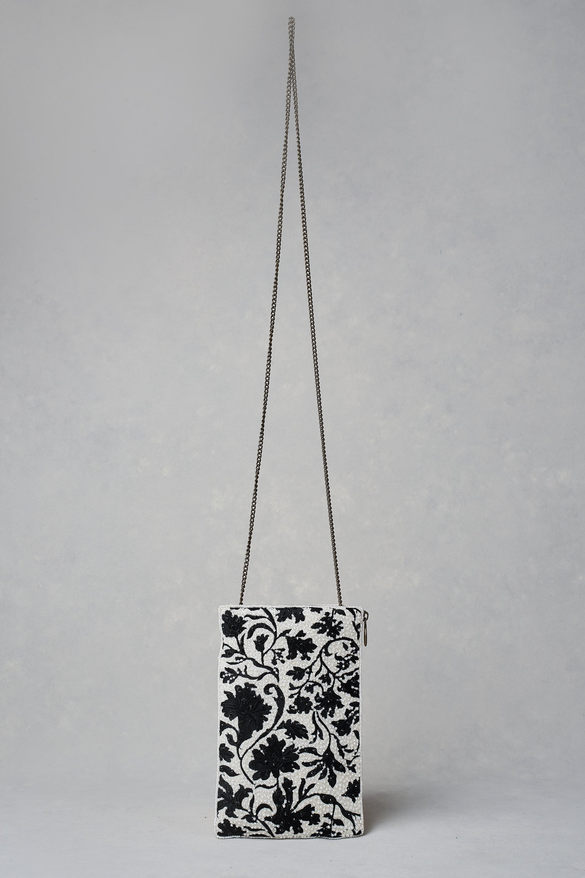 Chic and striking, this black and white mini clutch is intricately beaded in a bold leaf motif. With a compact shape, brass chain strap and magnetic button closure, it’s the perfect finishing touch to any outfit.