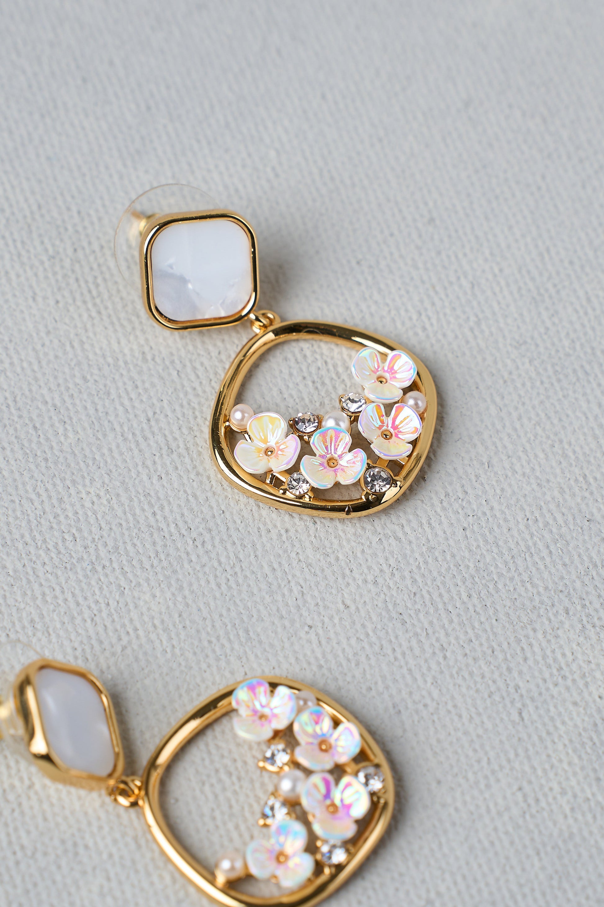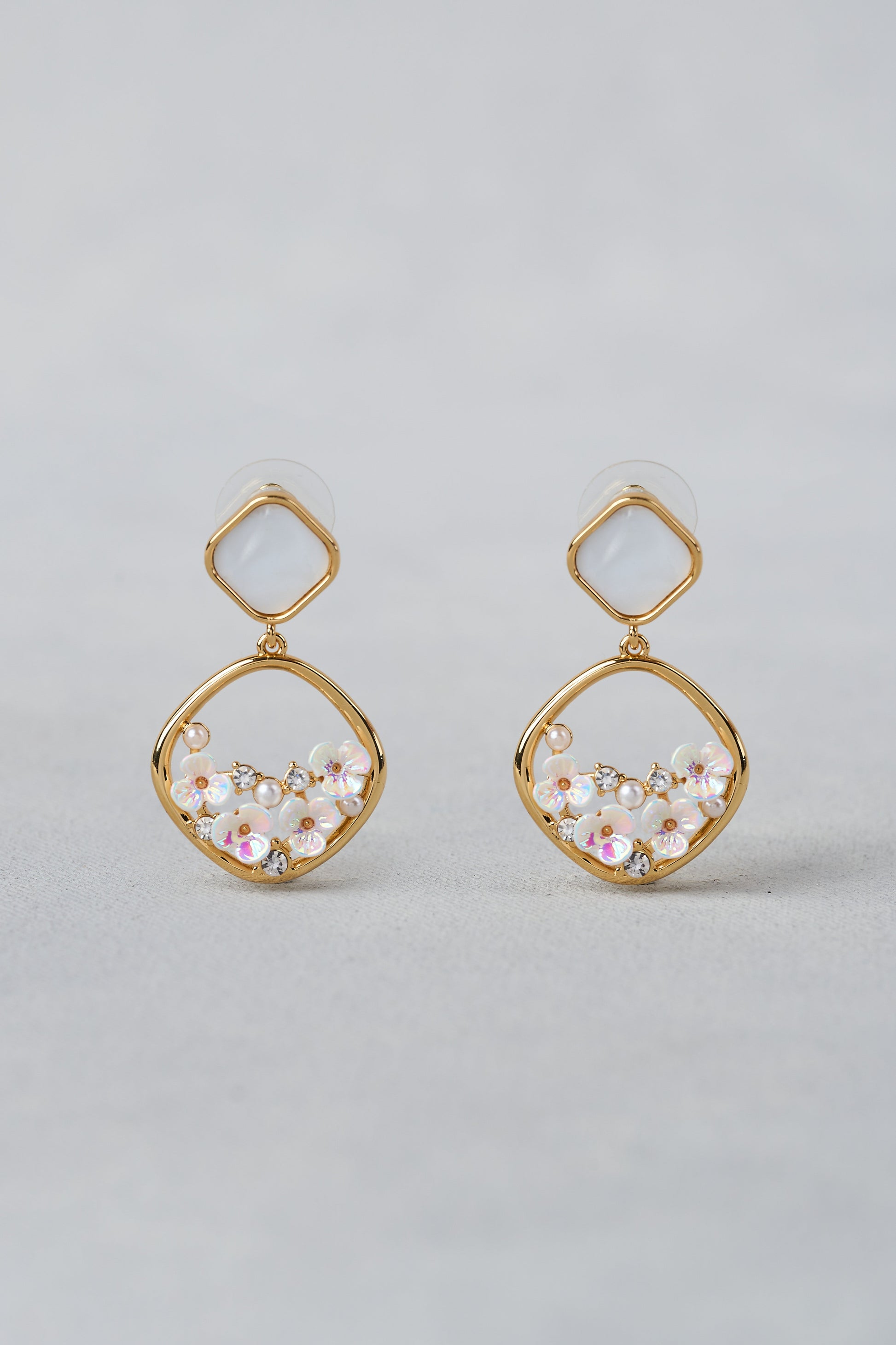 Petite iridescent flowers bloom within a gold-tone frame, accented by tiny pearls and sparkling stones. These delicate drop earrings catch the light beautifully; a romantic choice for weddings, soirées, or simply adding a touch of whimsy to your day.