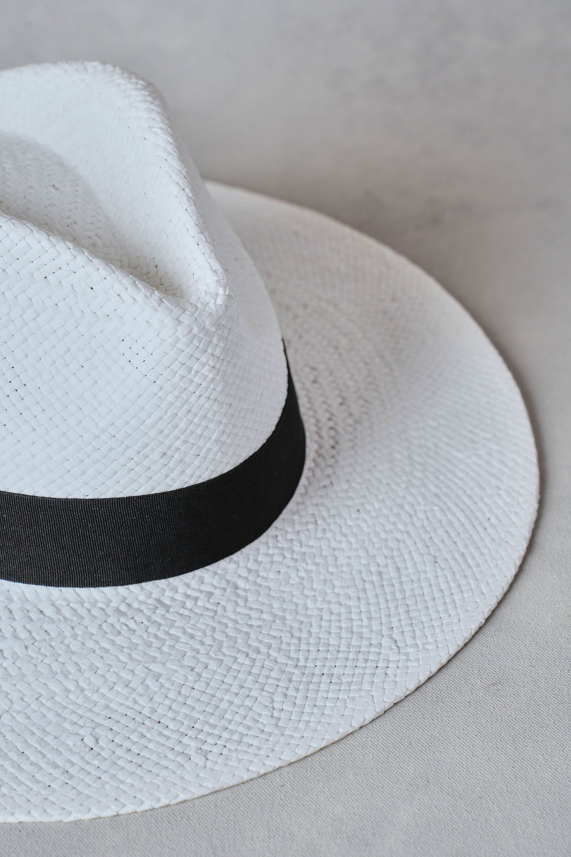 Lightweight and timeless, our classic Panama Hat is crafted from natural paper straw with a black trim. Whether paired with a linen dress or on the beach, this warm-weather favourite adds instant polish and charm to your ensemble.