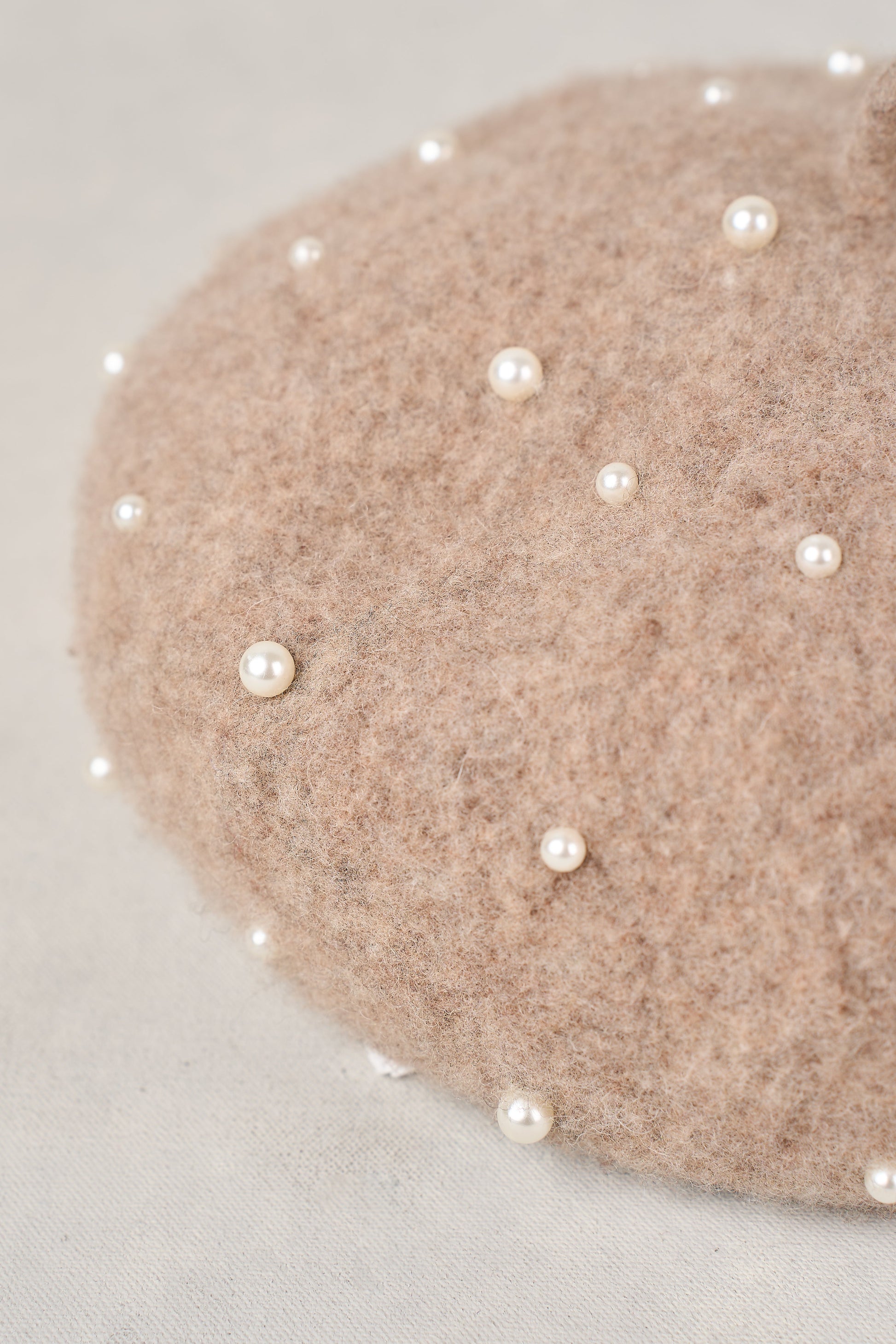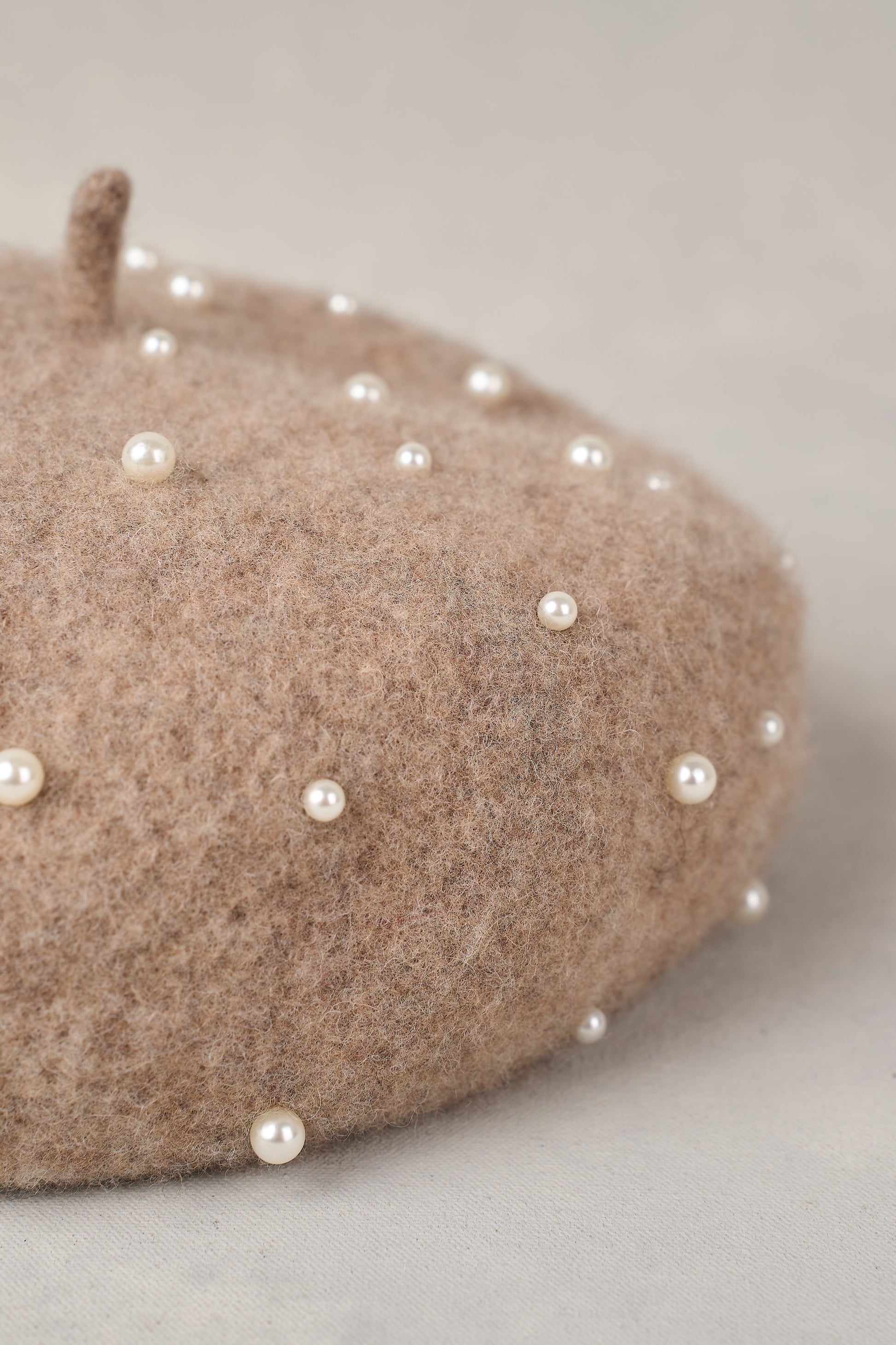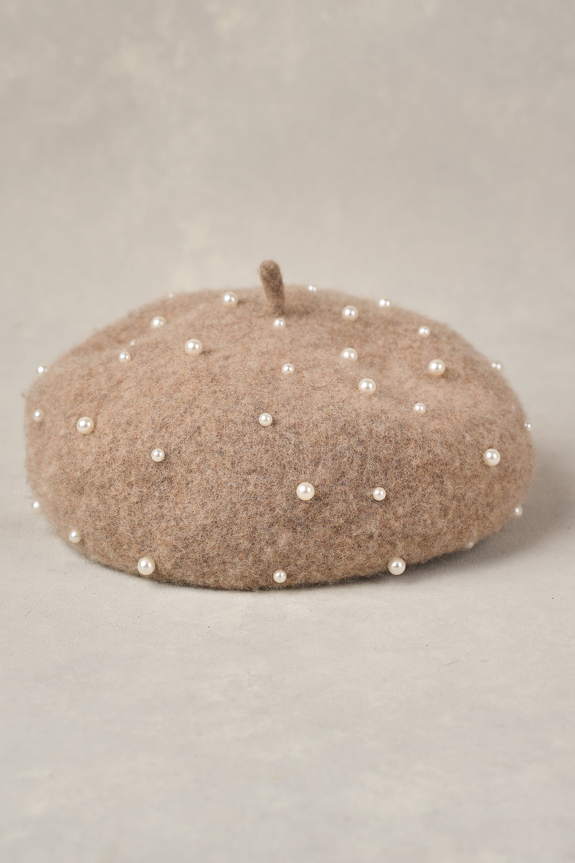 Embrace your inner Francophile with this glamorous beret. Crafted from 100% wool in Taupe Marle and featuring faux pearl studs, this stretchy and comfortable hat will keep your head nice and warm. Pair it with your favourite neckerchief for a full winter look à la française.
