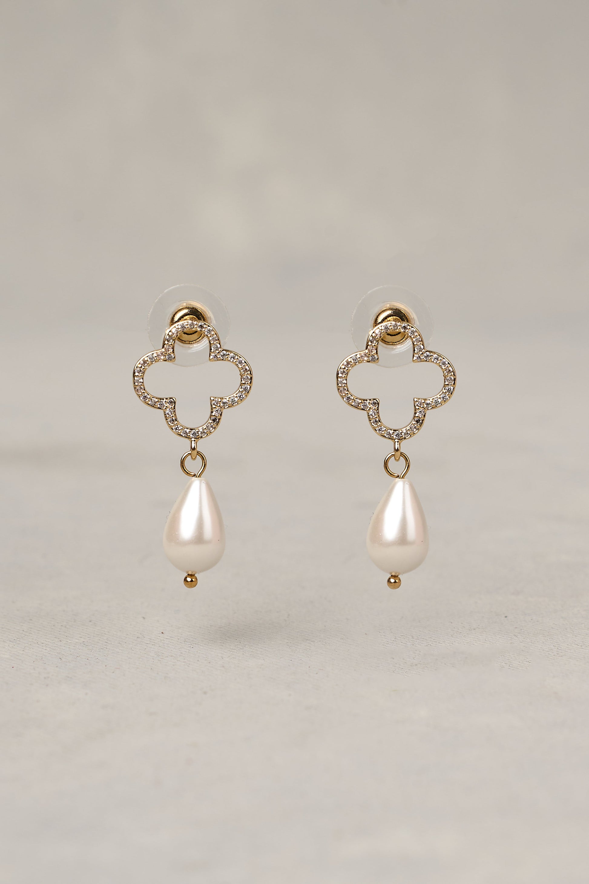 Charming and radiant, the Pearl Clover Studs feature a clover-shaped base encrusted with cubic zirconia and are complete with a pearl drop pendant. Elegant with a twist, they bring a hint of French whimsy to any look.