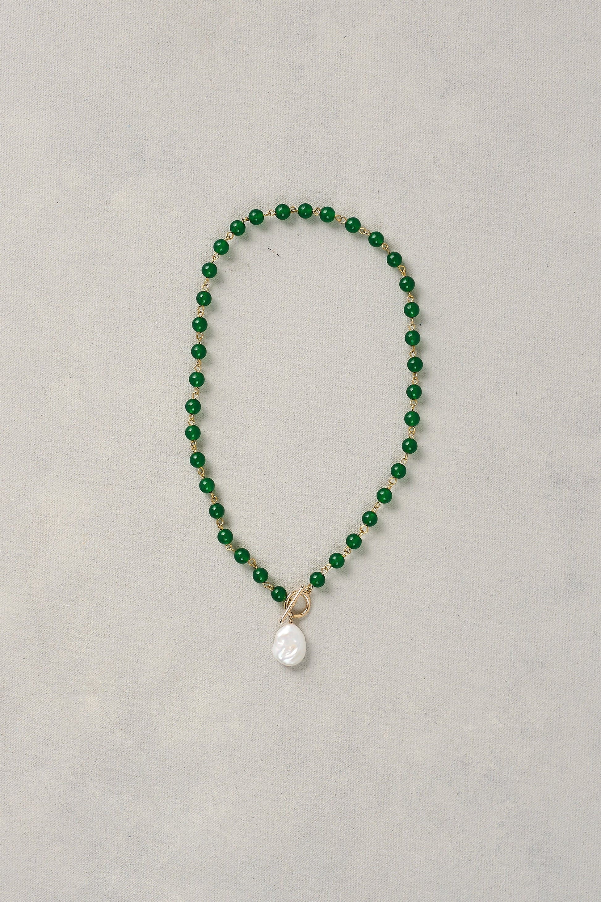 Inspired by vintage jewels, this emerald necklace is a statement in understated glamour. With glass stone beads and a single pearl pendant, it’s the perfect finishing touch for a polished, feminine look.
