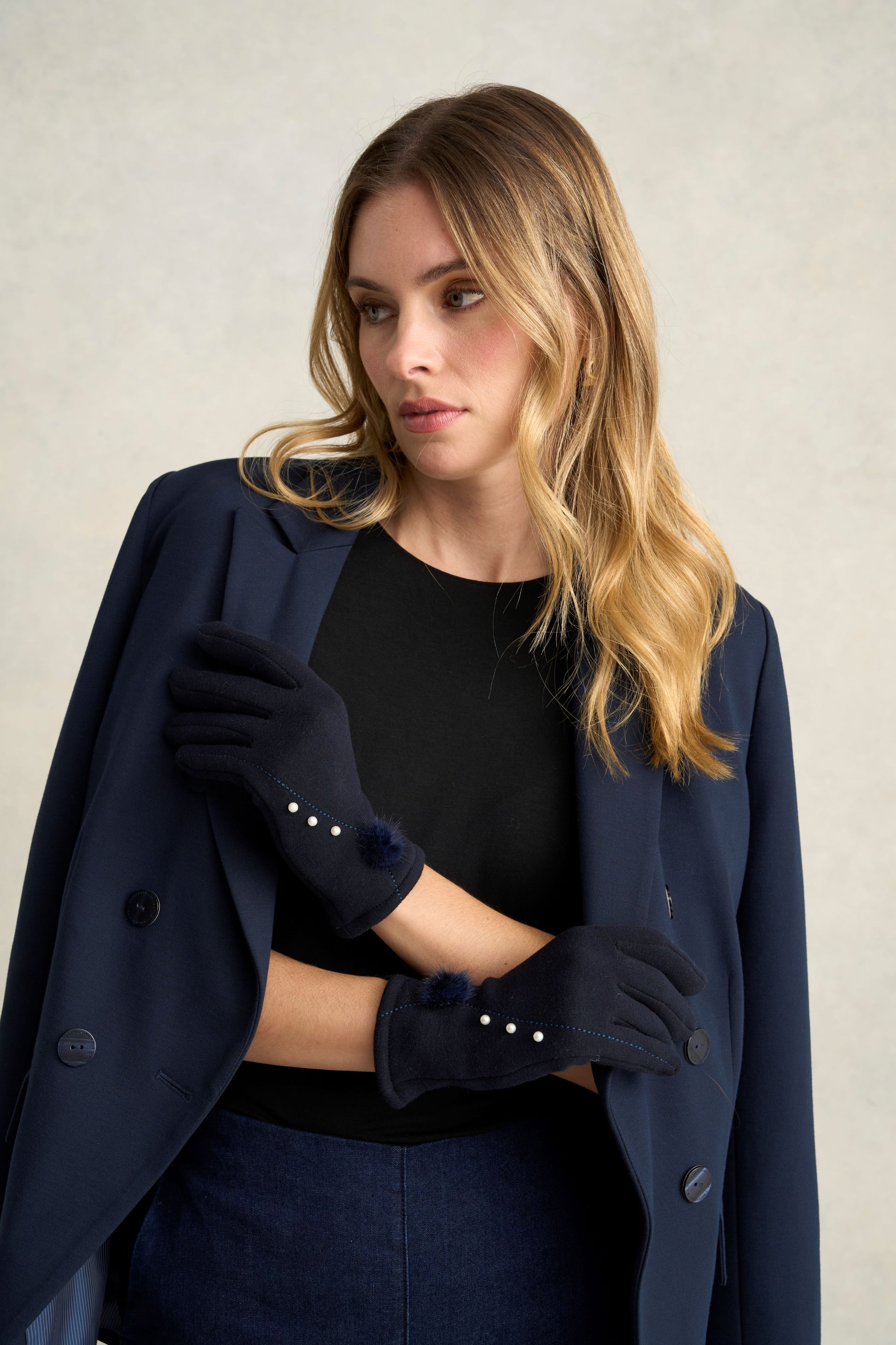 Elegant and cosy, these navy gloves feature a soft-touch finish both inside and out. Featuring a delicate trio of faux pearls and an oversized pom design, these gloves are charming and classic, bound to add polish to chilly days.