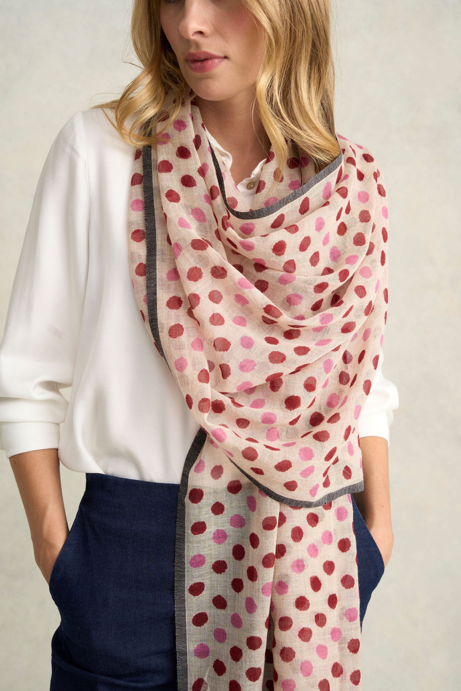 Playful yet refined, the Polka Dot Wool Scarf features a soft cream base with a purple polka dot design. Made from a luxurious wool/silk blend, it’s lightweight, warm, and effortlessly stylish. A charming finishing touch to any outfit.