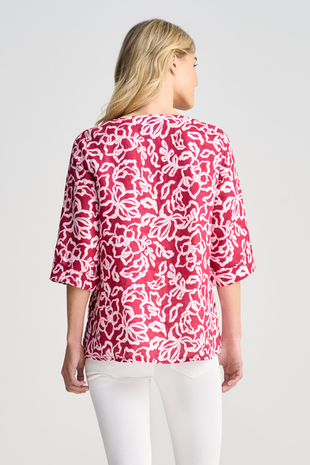 You’ll feel like you’ve been transported to Provence with every wear of this French Linen Button Detail Top. Featuring our Pink White Floral print and crafted from 100% French linen, this top is breathable and comfortable. It offers a wide scoop neckline, chic side button detailing and a turn back cuff.