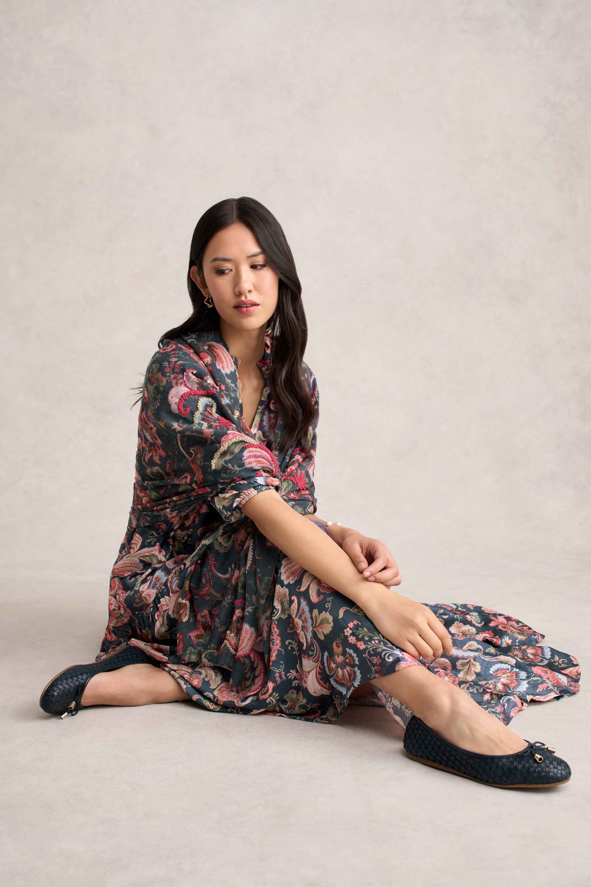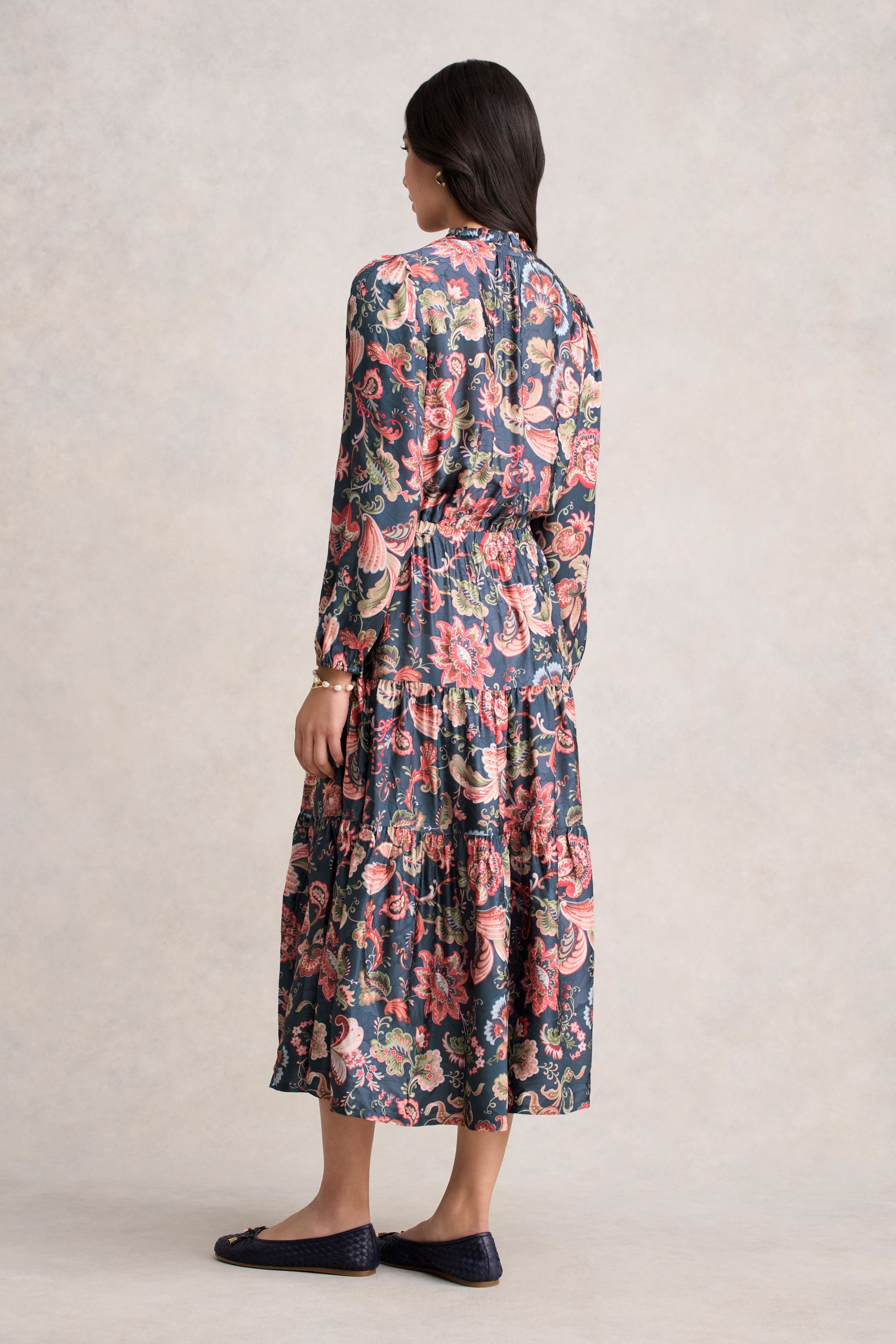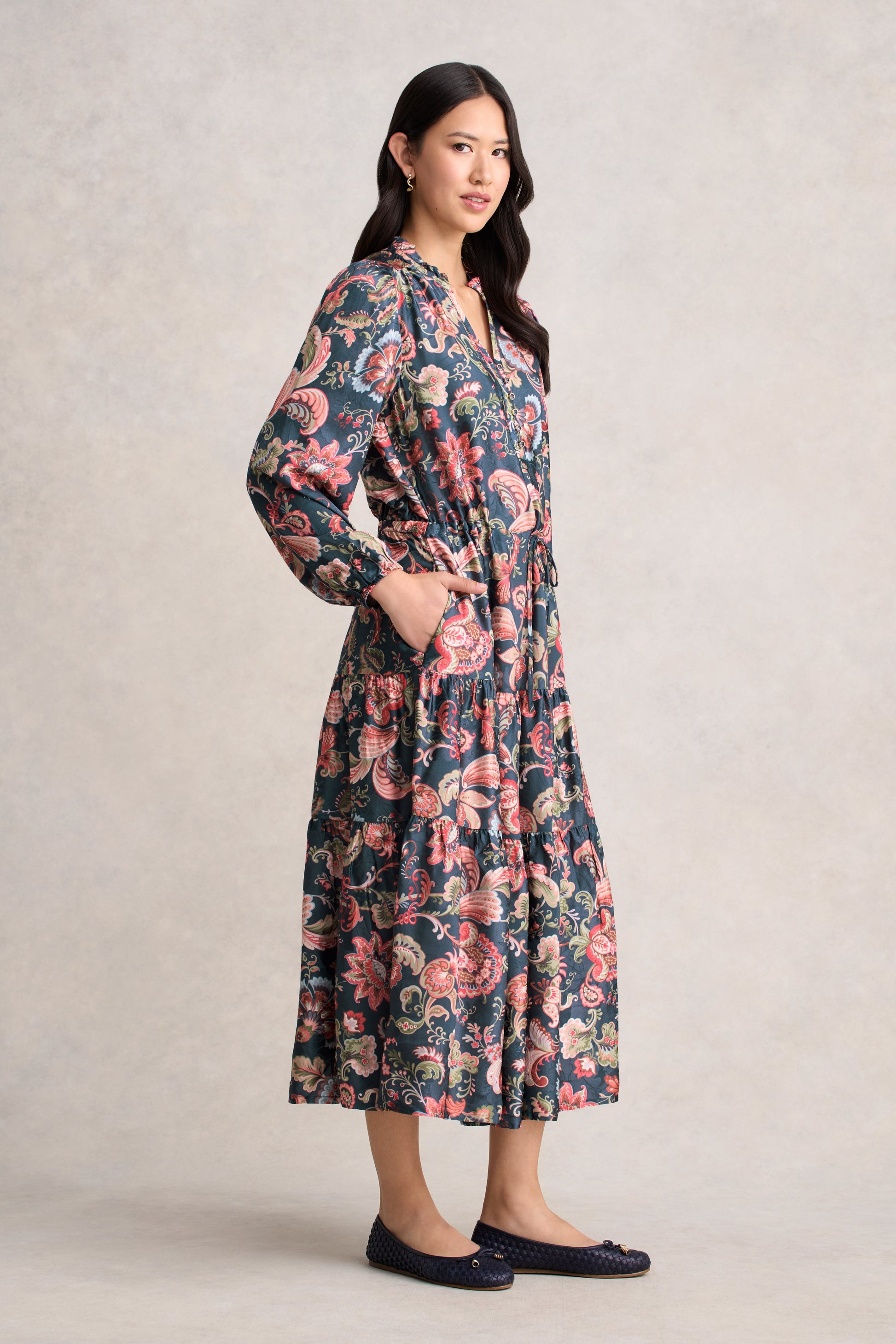 The striking Printed Jacquard Dress exudes timeless French elegance. Crafted from textured viscose jacquard with a satin finish, it features a feminine frill collar and notched neck as well as jewelled blue-grey buttons providing a hint of sophistication. With long, gathered sleeves, a drawstring waistband in the front, and elastic at the back, this midi dress offers a flattering silhouette. Two tiers with gentle gathering and side pockets complete the look, perfect for pairing with boots for a chic winter outfit.