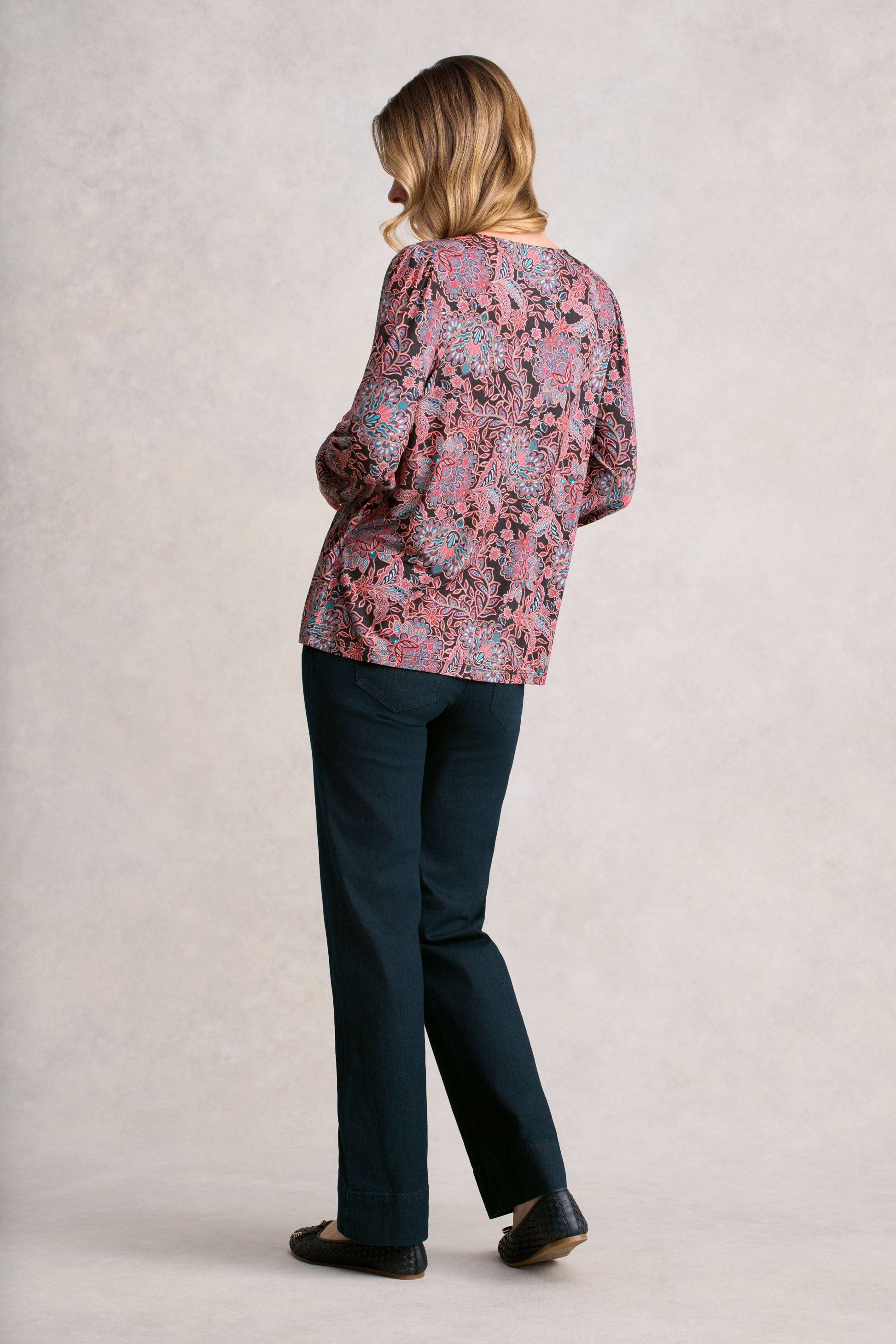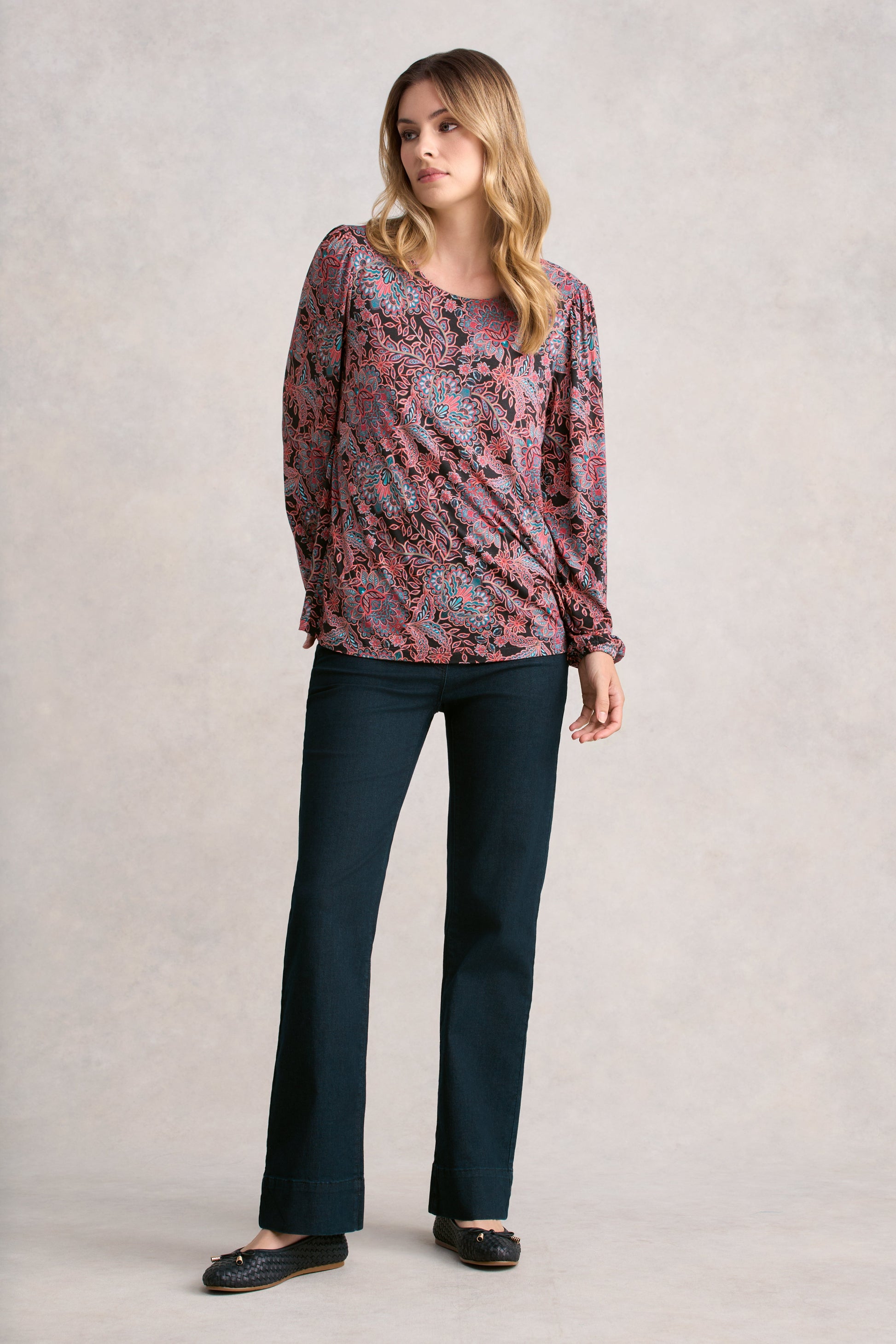 This printed top captures the essence of a French winter with its effortless elegance. Featuring a round neck and full-length blouson sleeve with elasticated cuffs, this top offers an easy, relaxed fit and the double-layered front creates a smooth finish without clinging. Perfect for layering during crisp winter days.