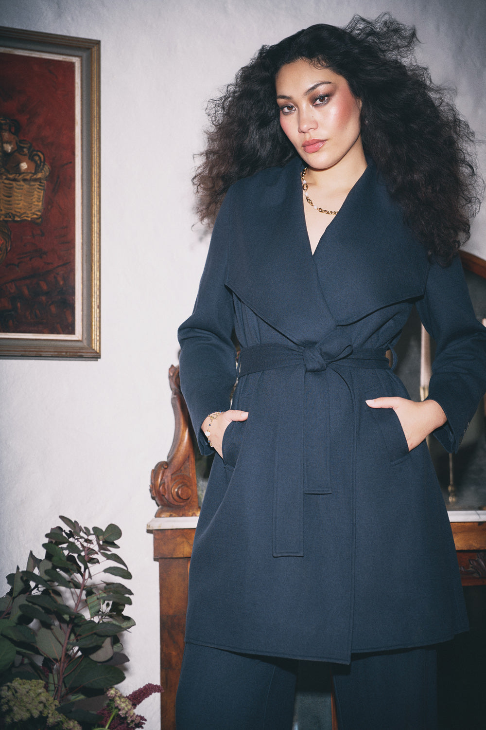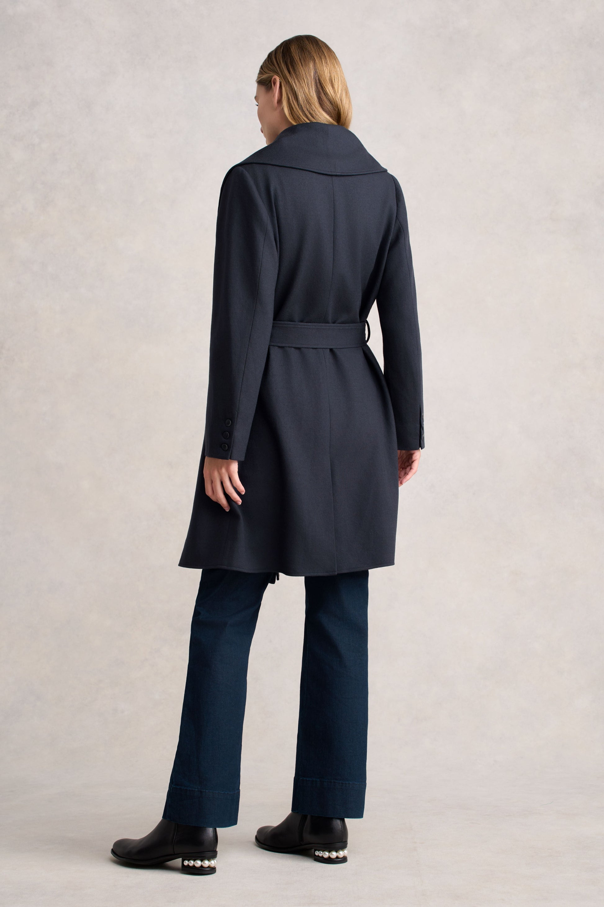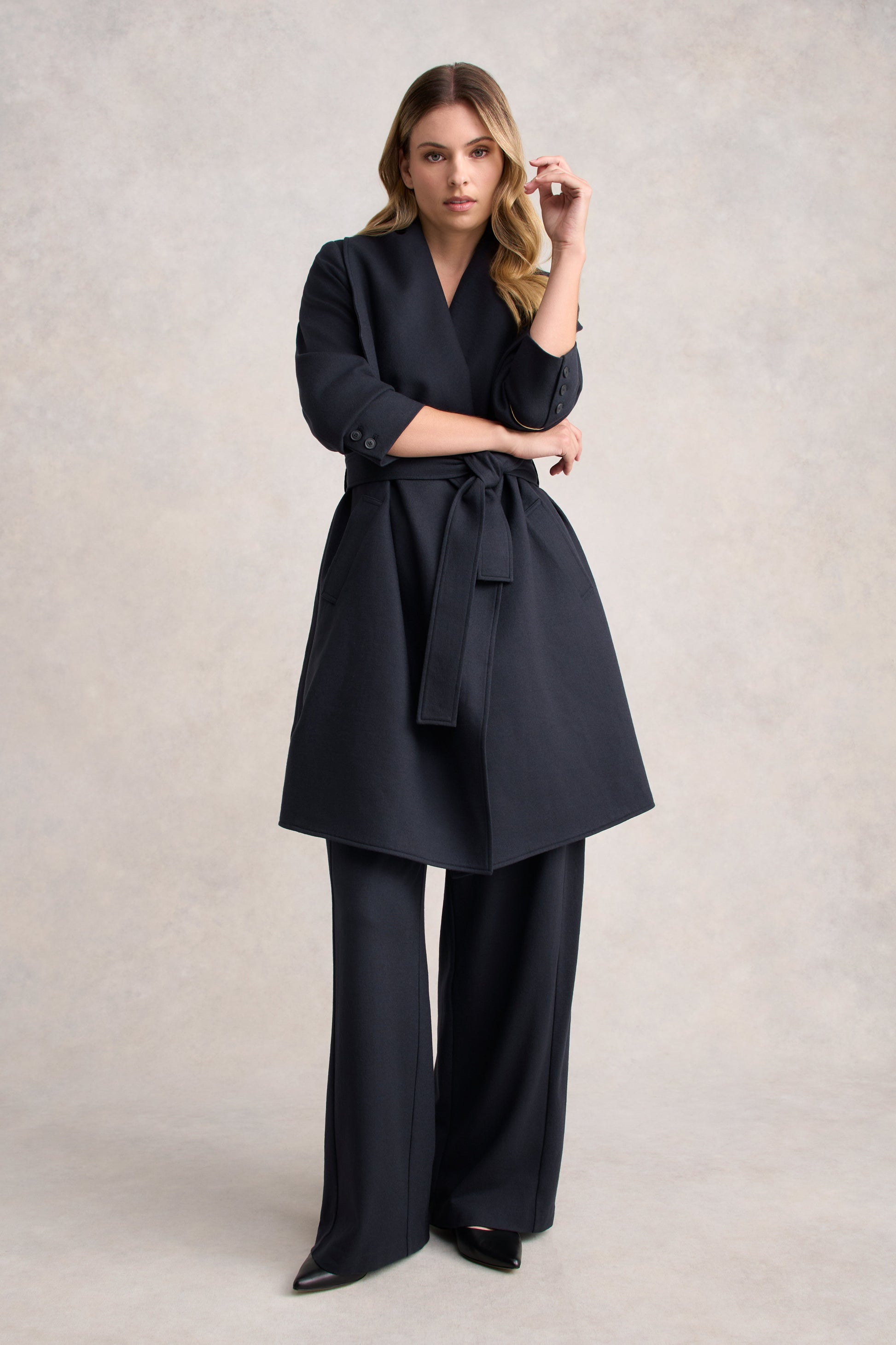 This Wool Coatigan is a versatile and stylish piece crafted from soft boiled wool in sophisticated Steel Grey. Featuring an oversized statement collar, double-breasted design and deep front pockets, it exudes both elegance and comfort. Fully lined, the coatigan includes a matching belt with belt loops, tortoiseshell buttons and a back vent for added movement. Pair it with the matching pant for a coordinated look.