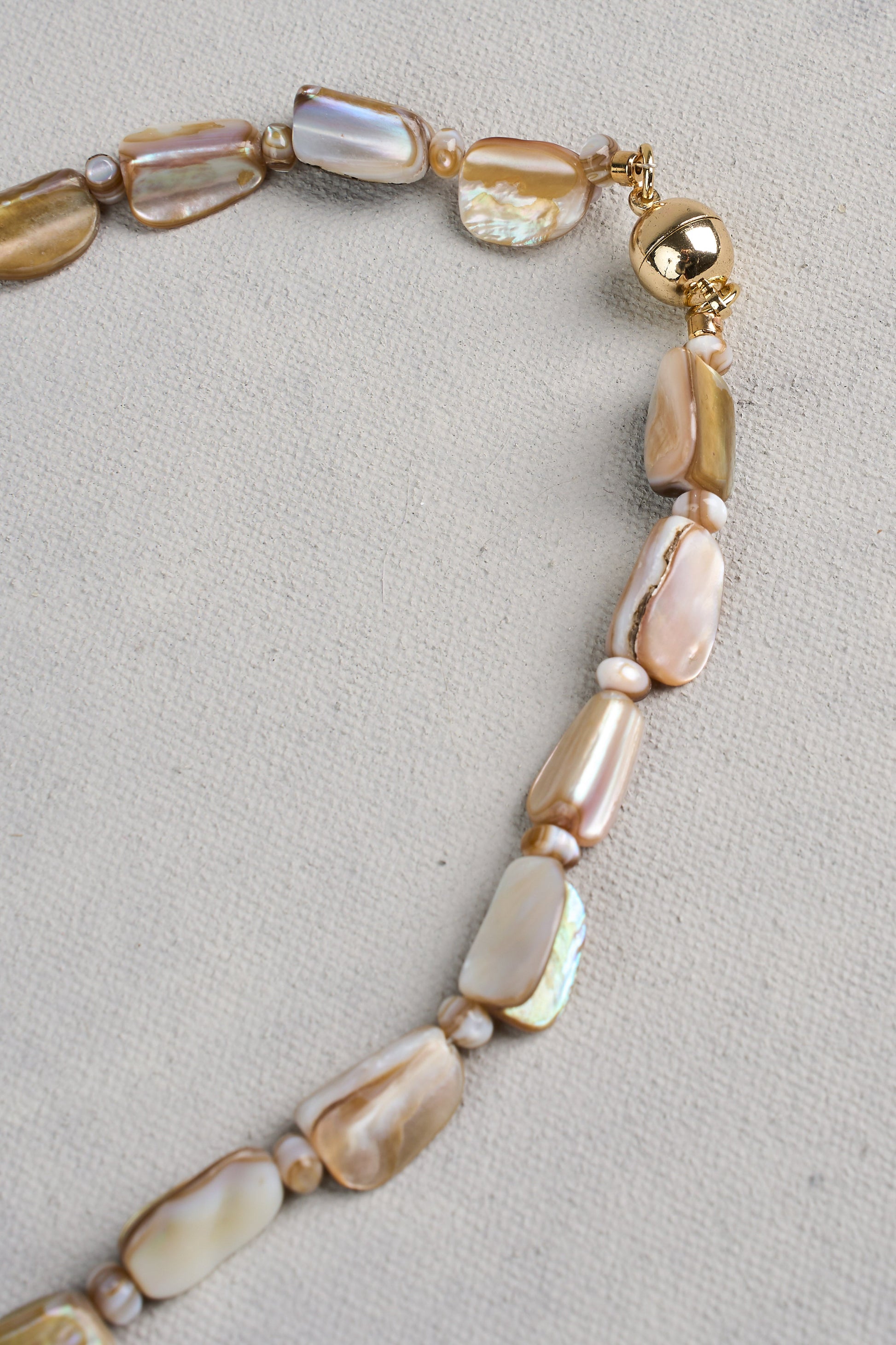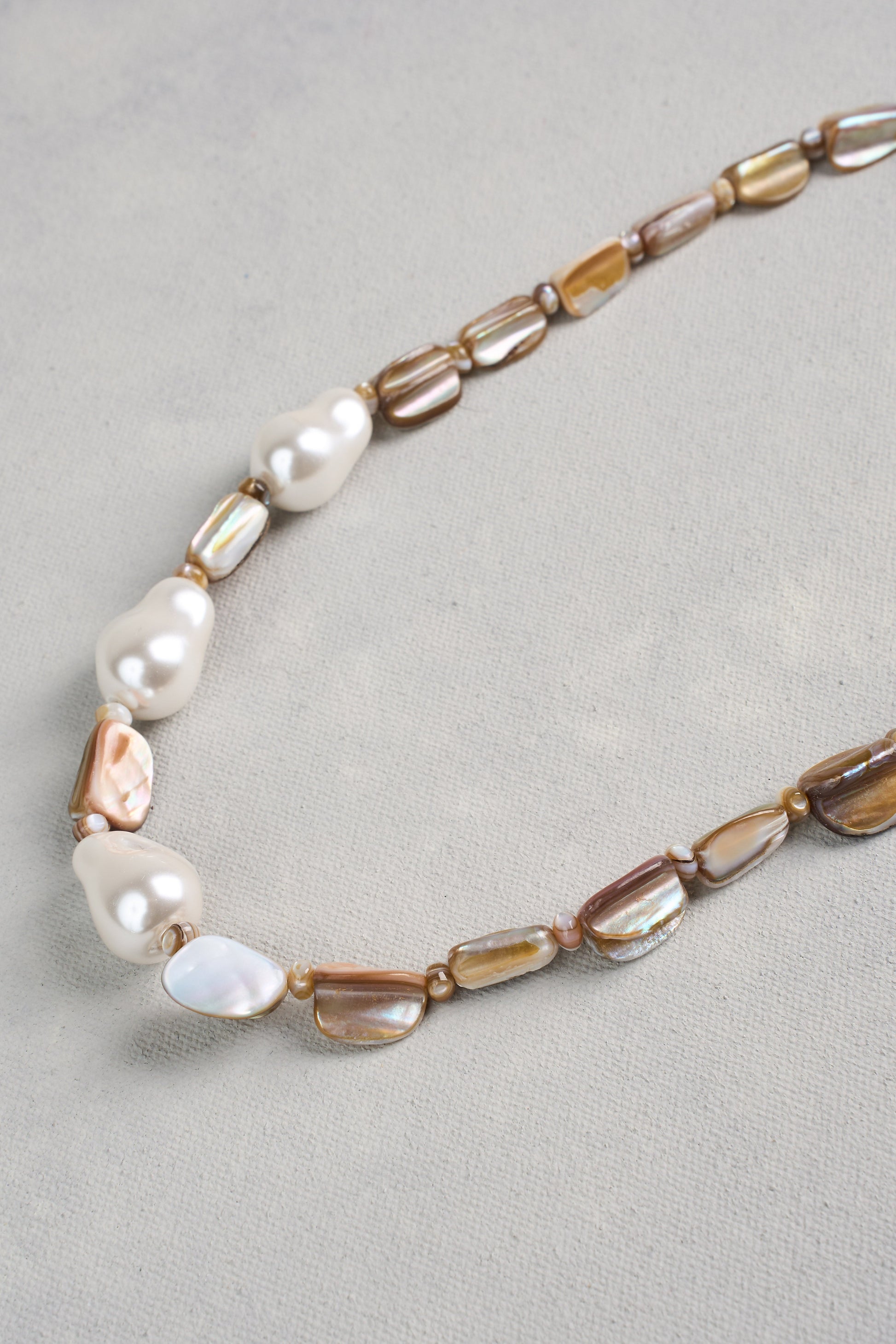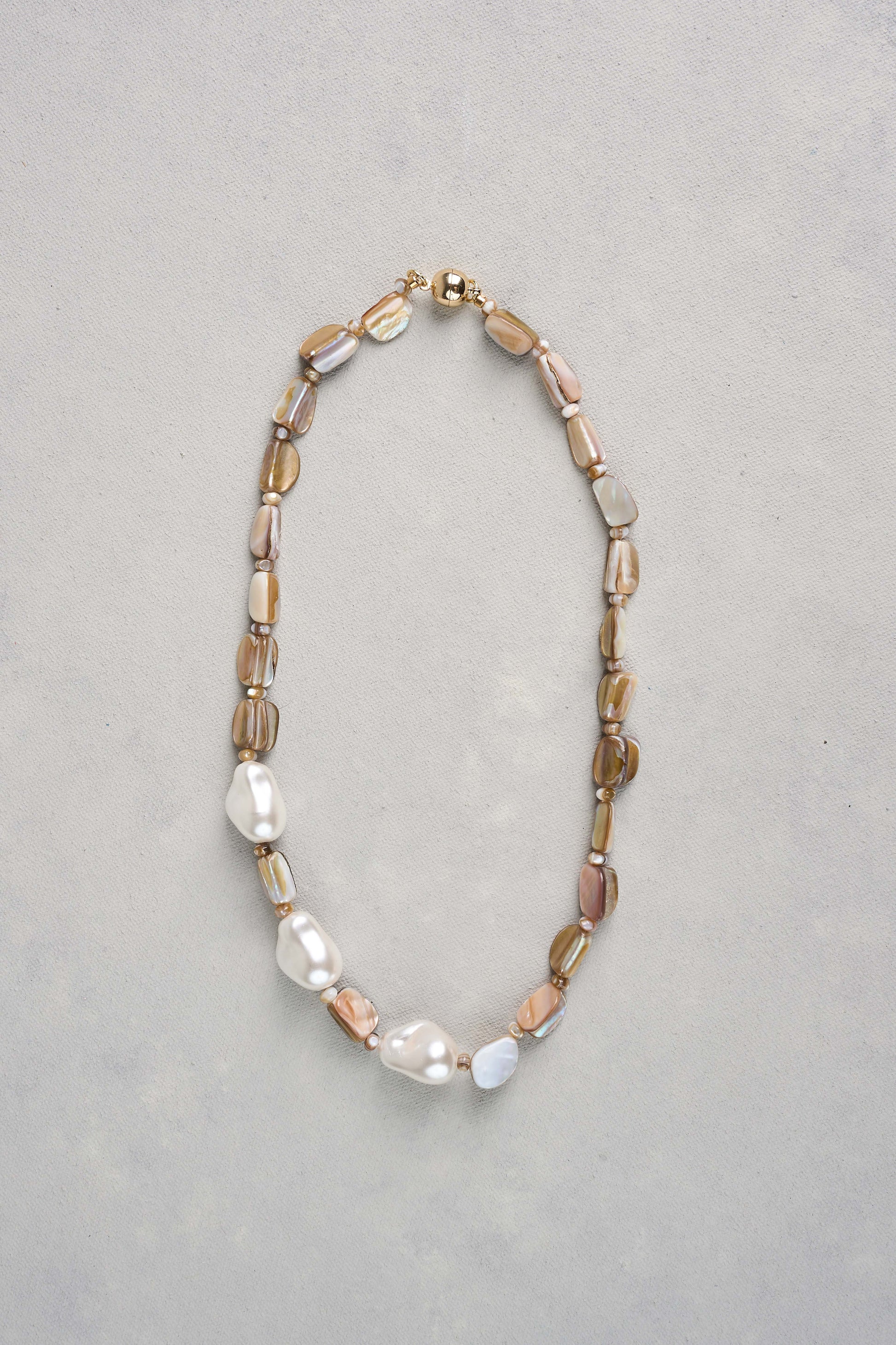 Balancing natural charm with polish, this necklace features coated pearls, natural shells and three striking baroque pearls. Finished with 18k gold hardware and a magnetic closure, it layers beautifully with other pieces or shines on its own for coastal-inspired elegance.