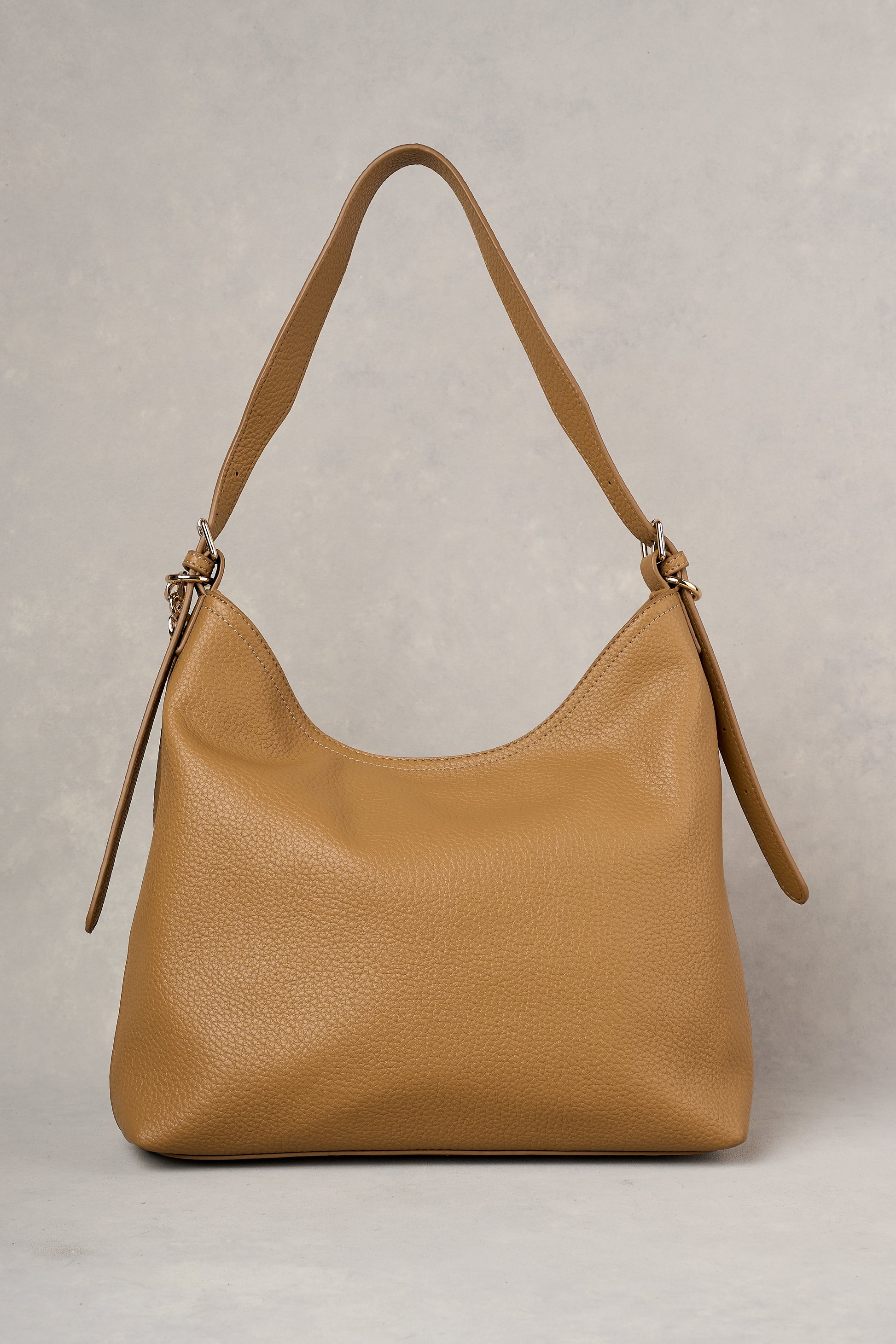 This tan-coloured hobo shoulder bag features a soft, slouched silhouette with a pebbled finish. The gold chain accent adds a touch of polish making it the perfect everyday bag with generous storage. Understated, practical and luxe.