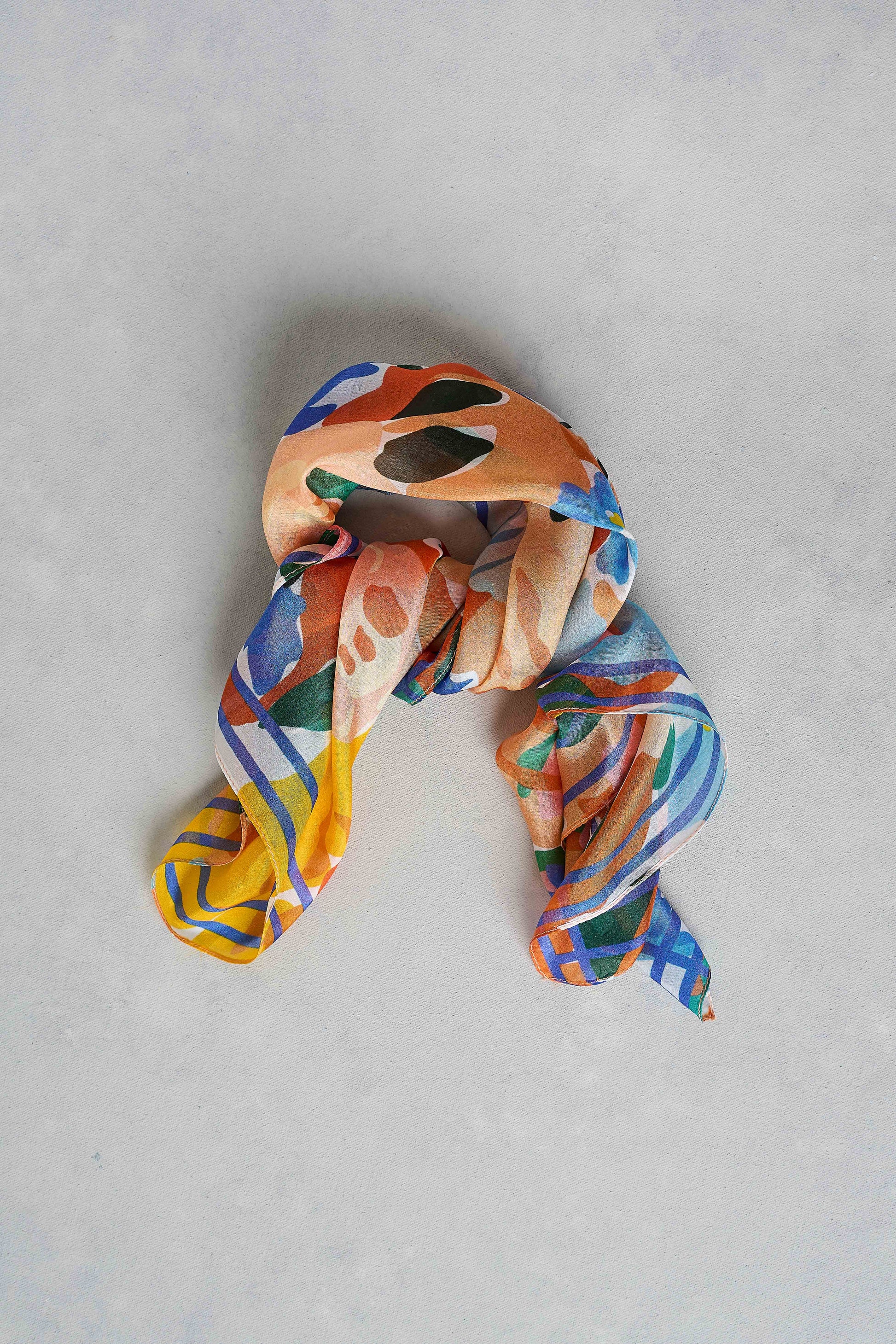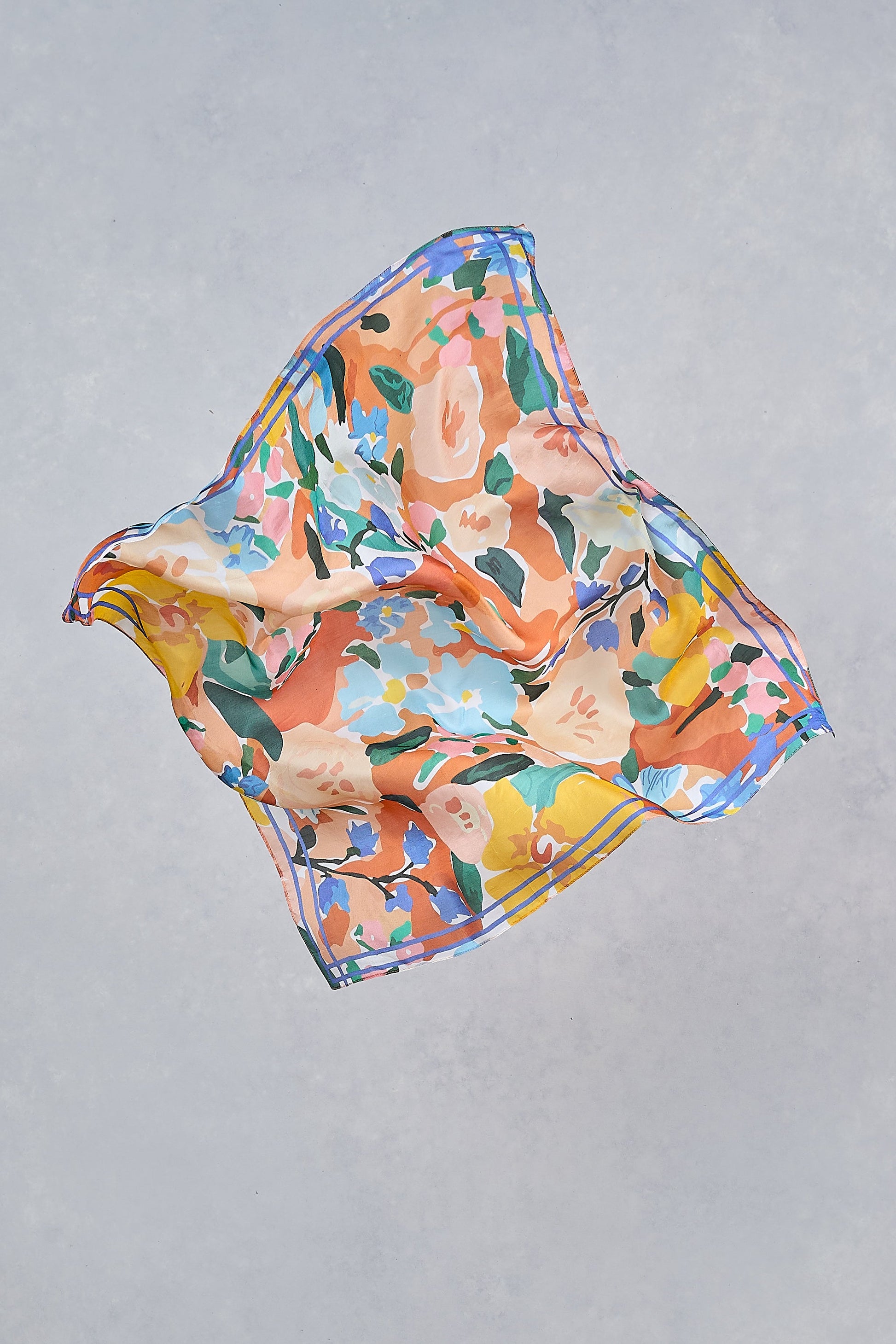 Soft brushstrokes of pink, coral and green bloom across this silk scarf, creating a painterly floral effect. In a versatile square shape, it’s perfect tied at the neck, styled as a headscarf or knotted onto a handbag for a feminine flourish.